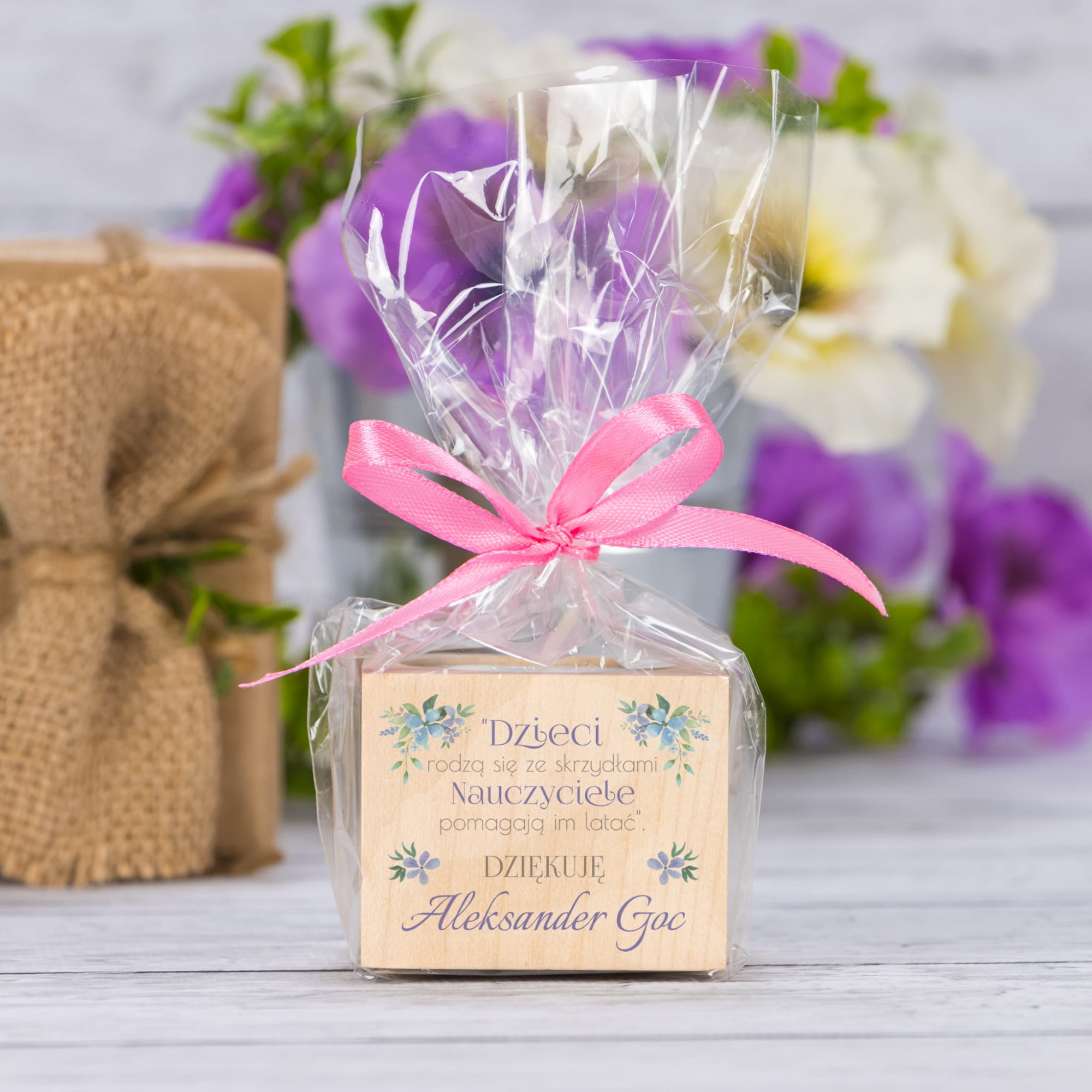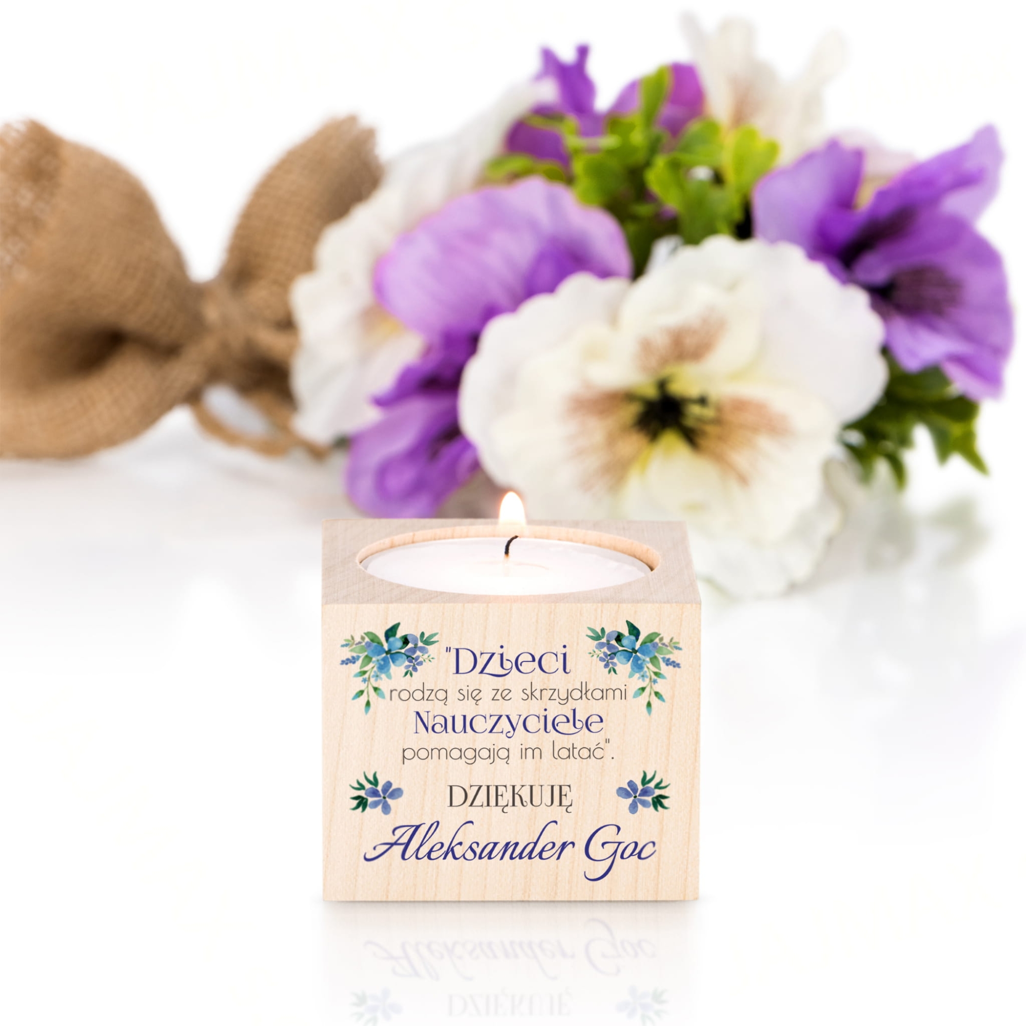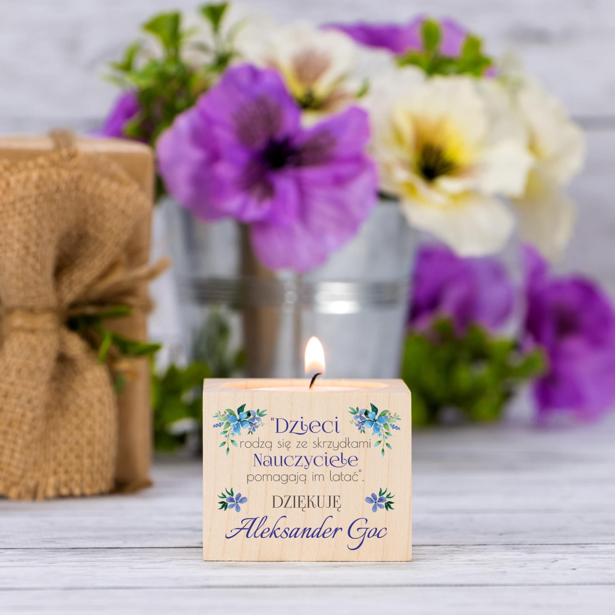 Drobny upominek dla nauczyciela to świetna propozycja na indywidualny prezent od ucznia dla nauczyciela lub jako dodatek do prezentu od całej klasy. Prezent na Dzień Nauczyciela lub prezent na Zakończenie roku szkolnego to zawsze bardzo miły gest. Nasz drewniany świecznik z kolorowym nadrukiem to doskonały sposób na podziękowania dla nauczyciela. Dzięki personalizacji świecznik będzie jedyny i niepowtarzalny.