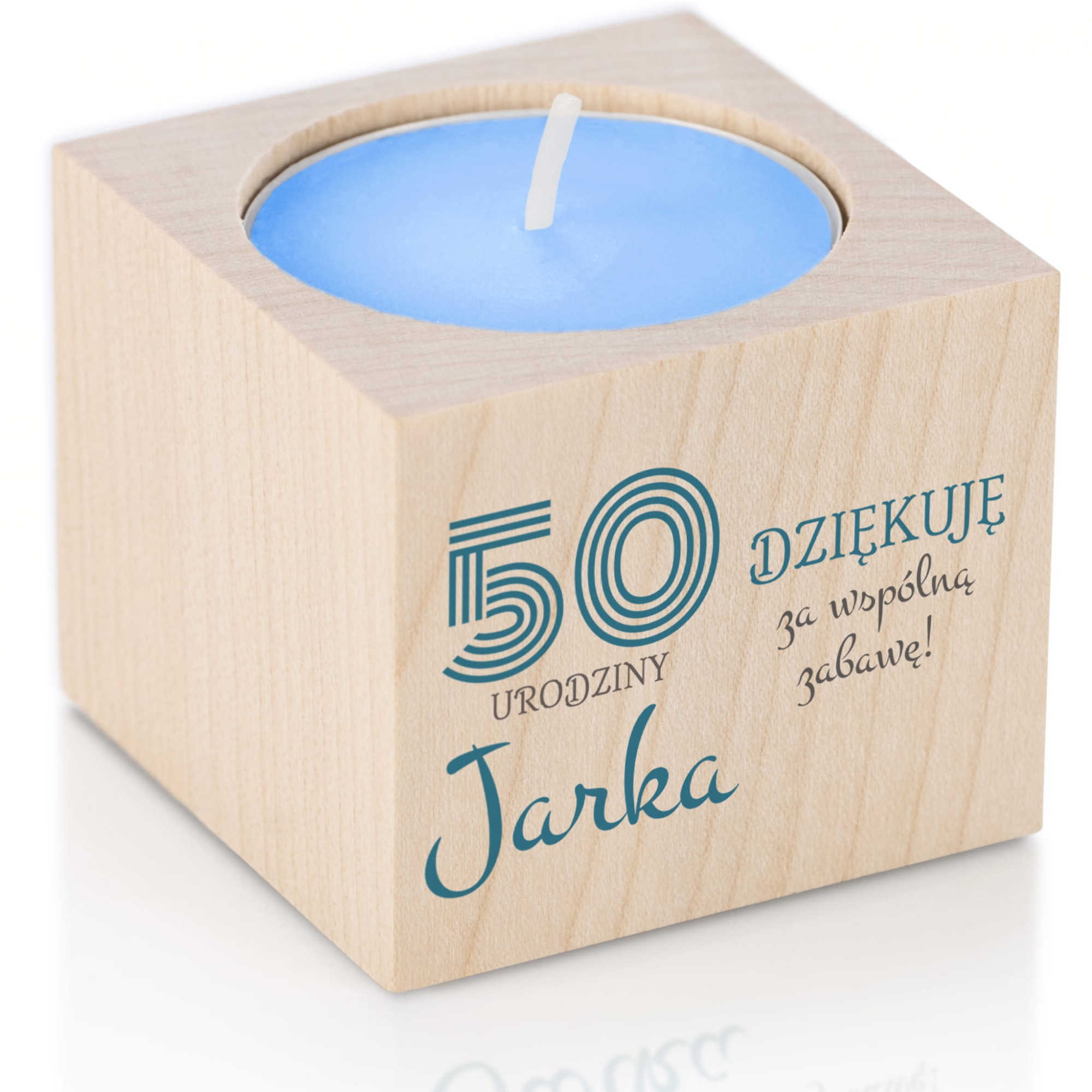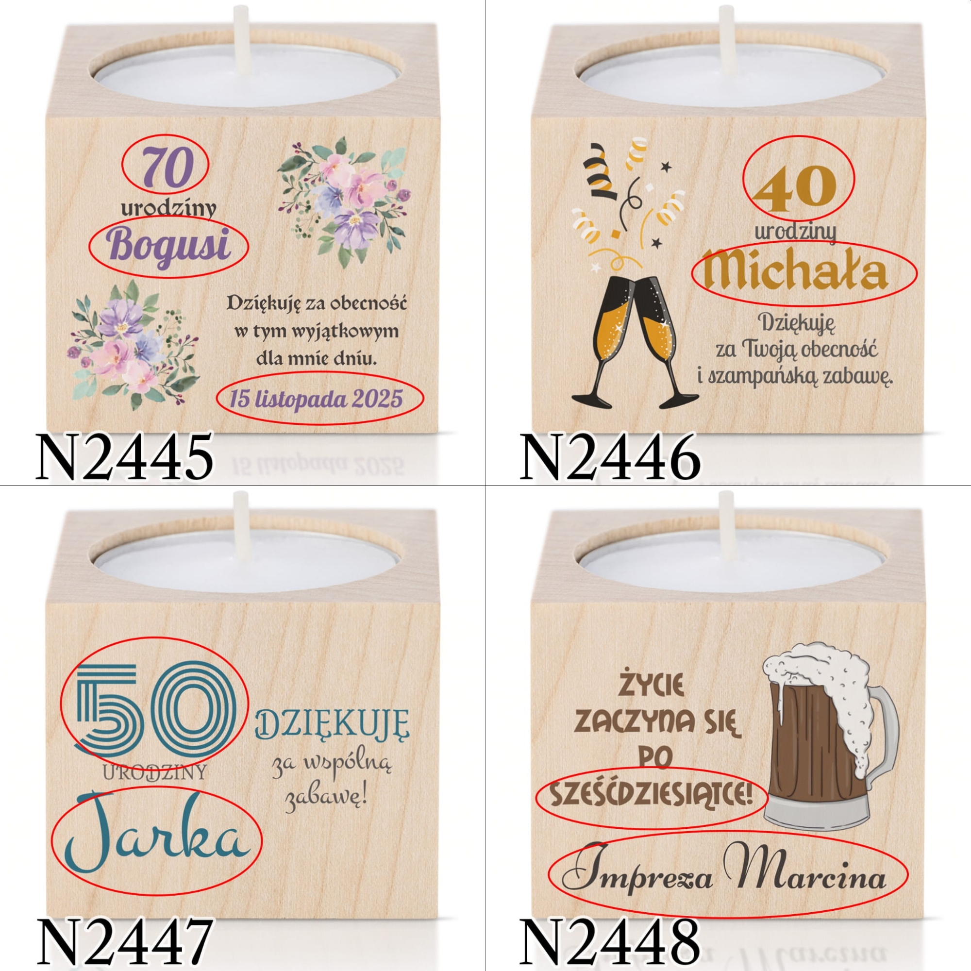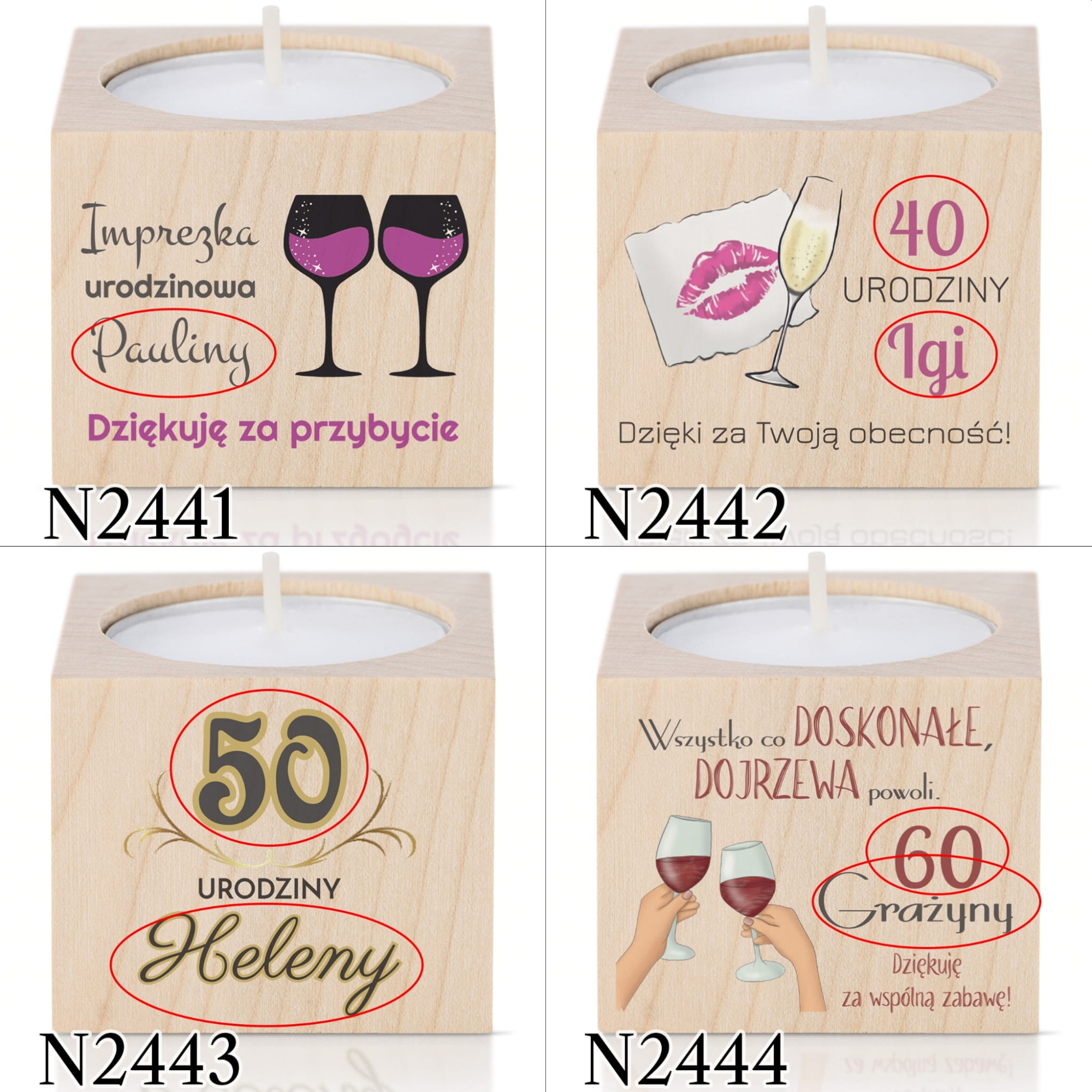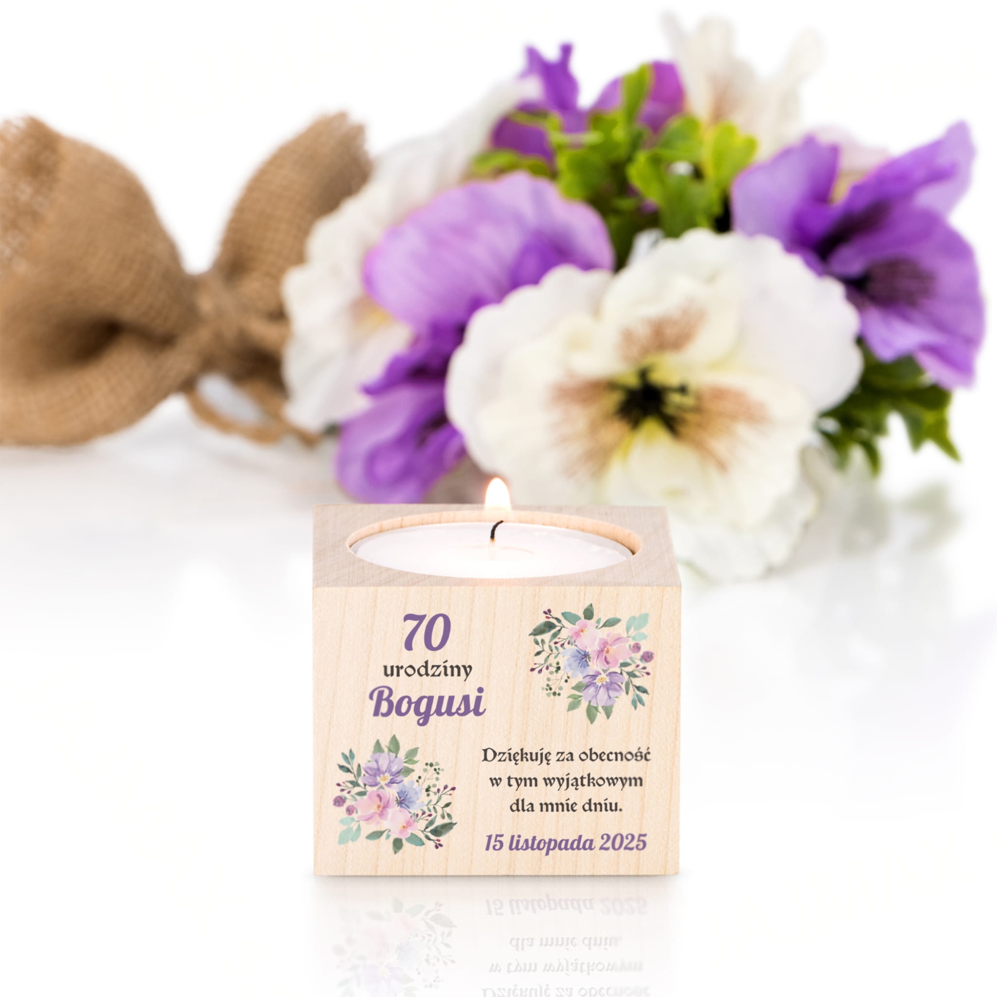 Drewniany świecznik na podgrzewacz podziękowania dla gości na urodziny z nadrukiem