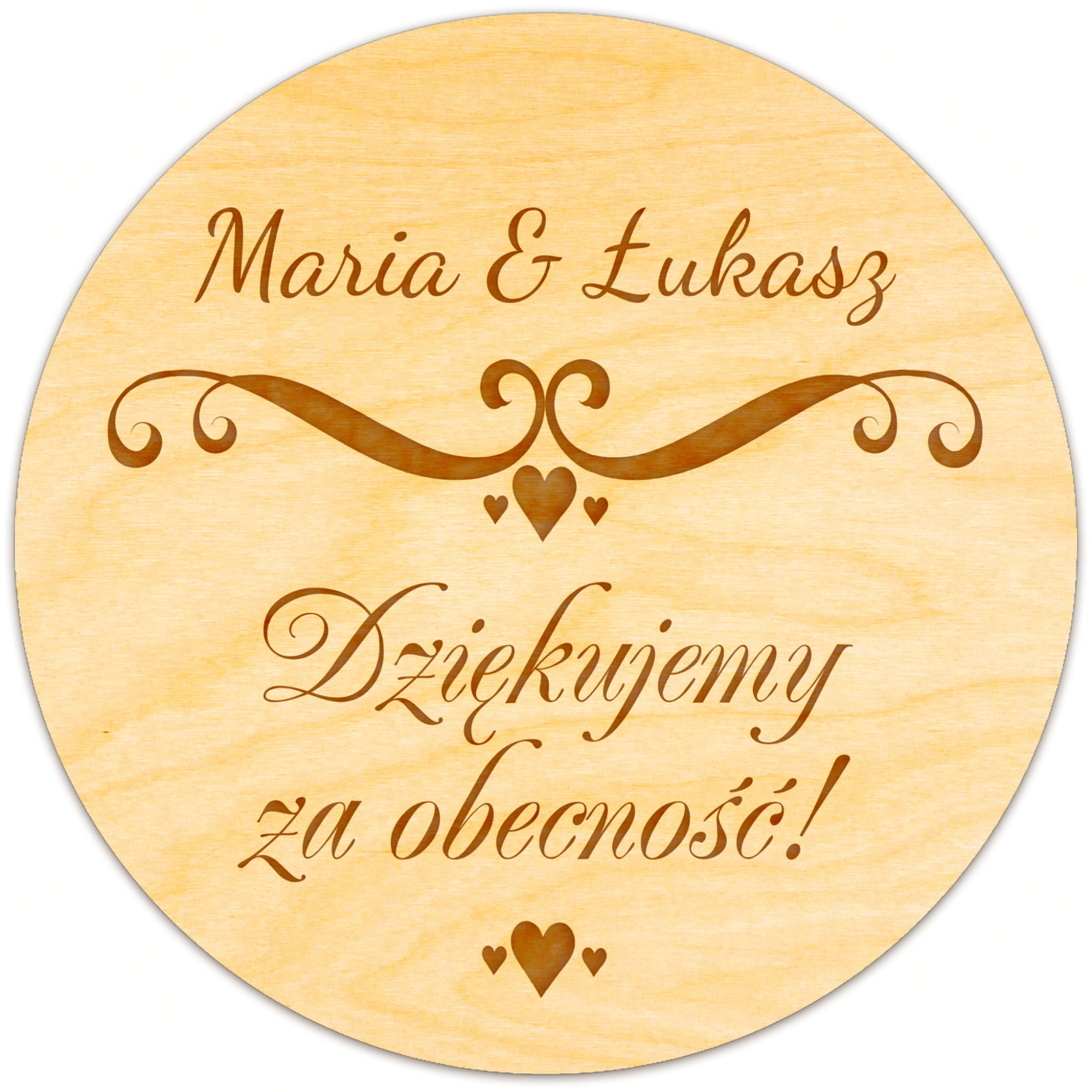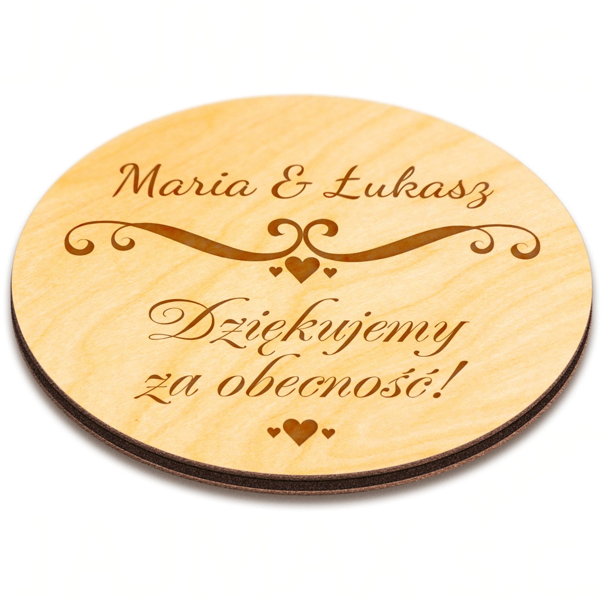 Drewniany magnes koło z imionami Pary Młodej super pamiątka dla gości z okazji ślubu