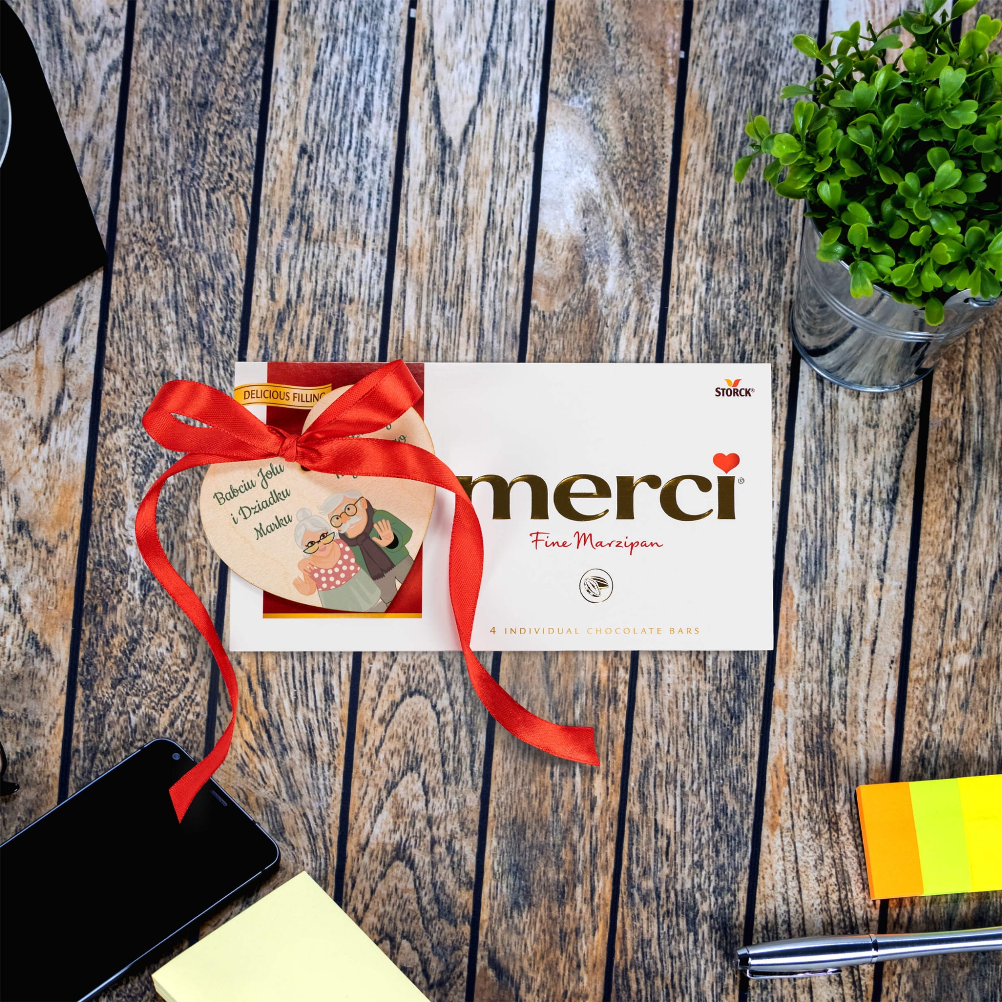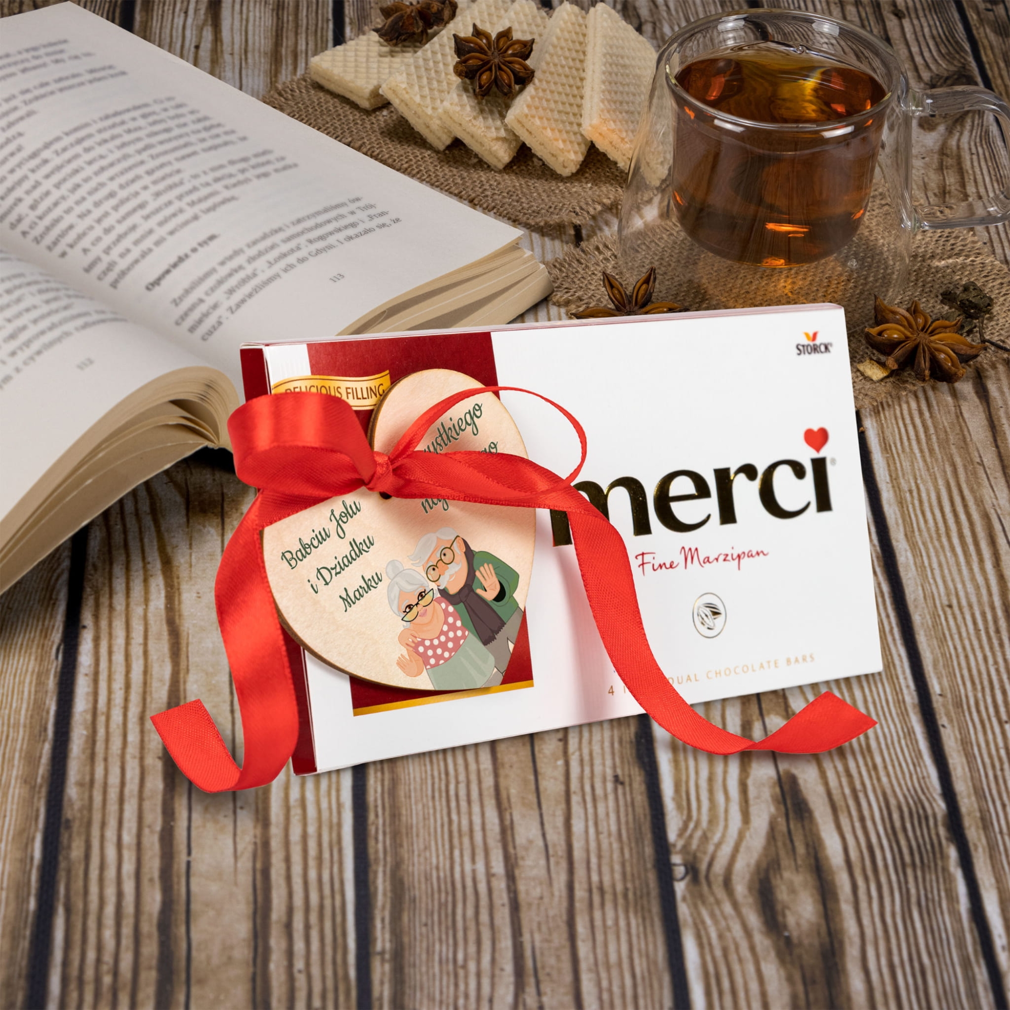 Czekolada Merci plus serce z życzeniami z okazji Dnia Babci i Dziadka