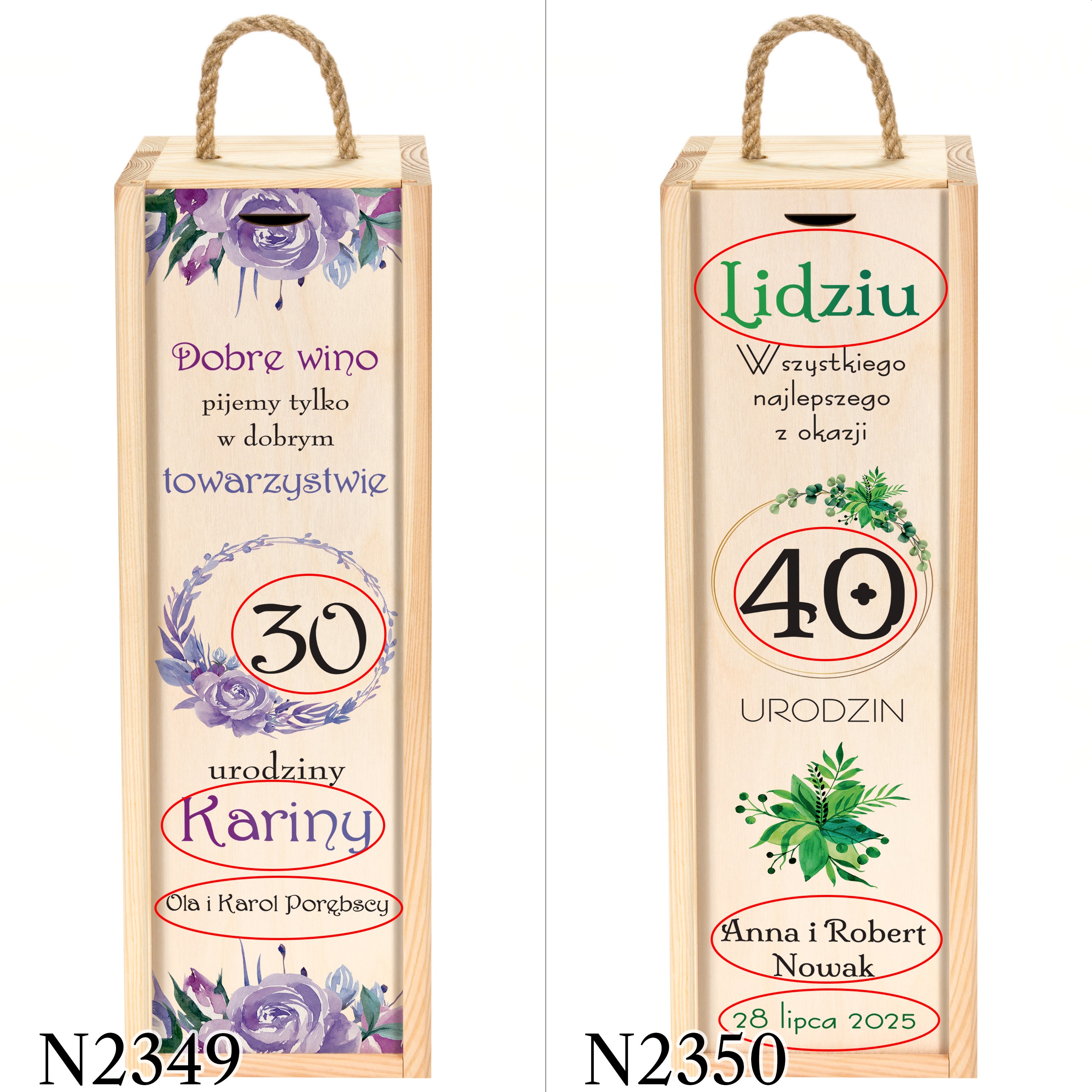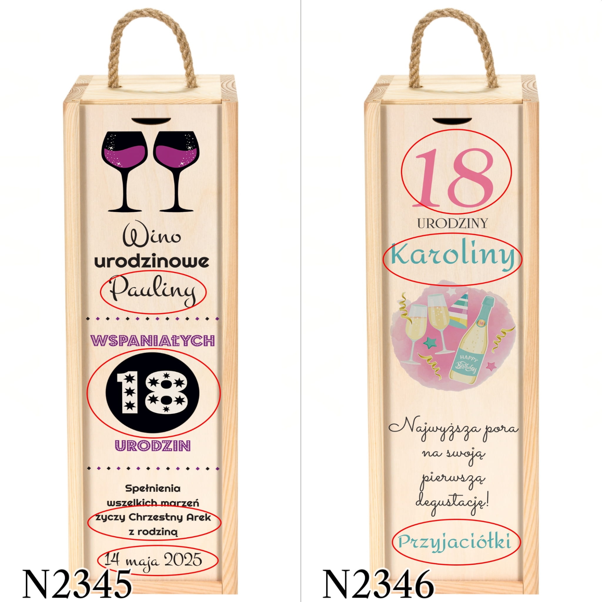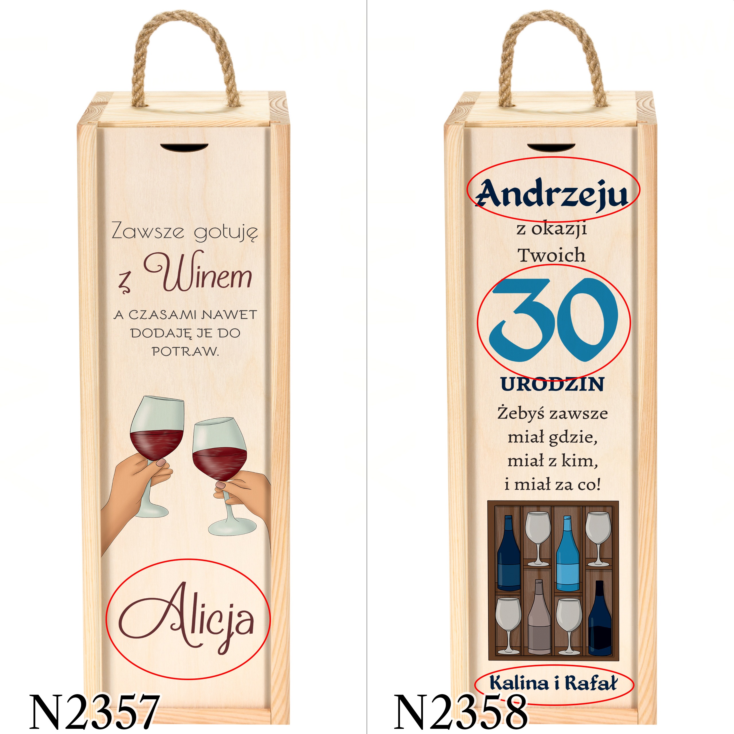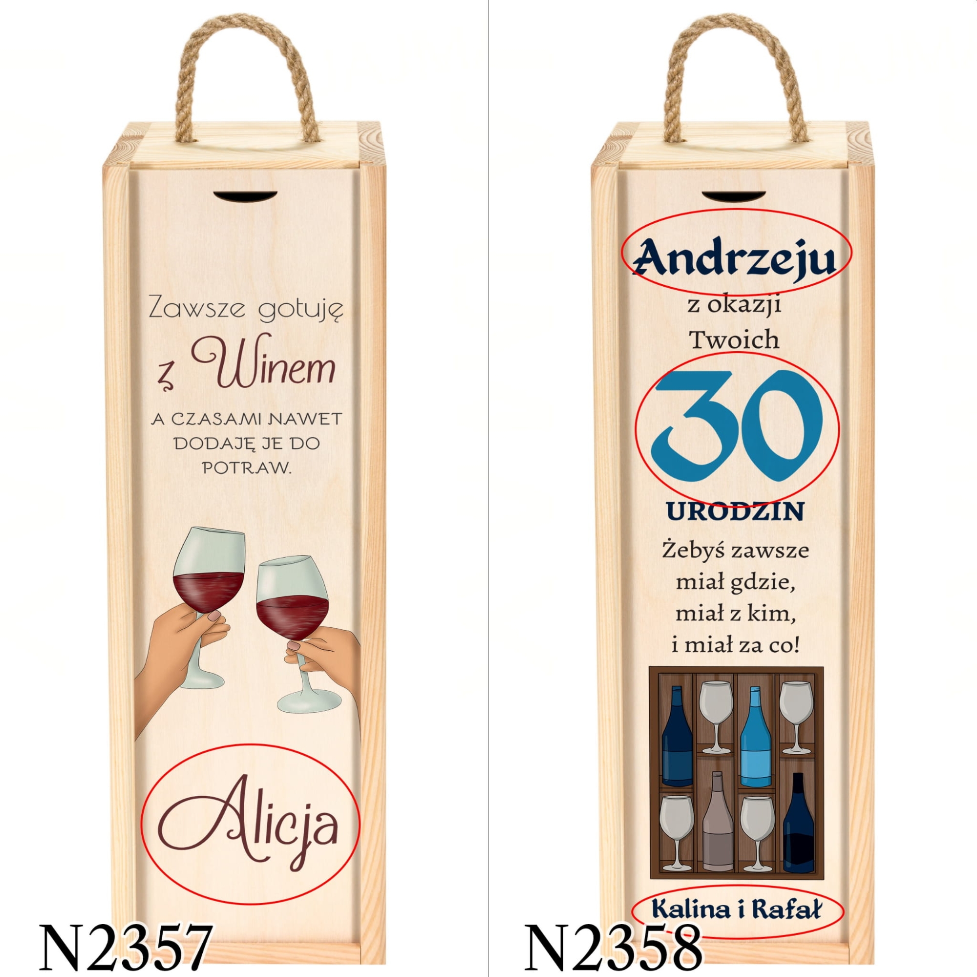 Skrzynka na wino z nadrukiem to świetny pomysł na prezent na urodziny. Drewniana skrzynka to zdecydowanie najlepszy sposób na zapakowanie ulubionego trunku solenizanta. W skrzynce znajduje się naturalna wełna drzewna, która jest zarówno dekoracją jak i zabezpieczeniem butelki. Prezent na urodziny lub prezent na imieniny wręczony w skrzynce z pewnością będzie strzałem w dziesiątkę. Niezależnie czy ma być to prezent na 18stkę, prezent na 30tskę, prezent na 40stkę czy inne okrągłe urodziny lub imieniny to gwarantujemy, że nasz spersonalizowany produkt będzie świetnym wyborem.