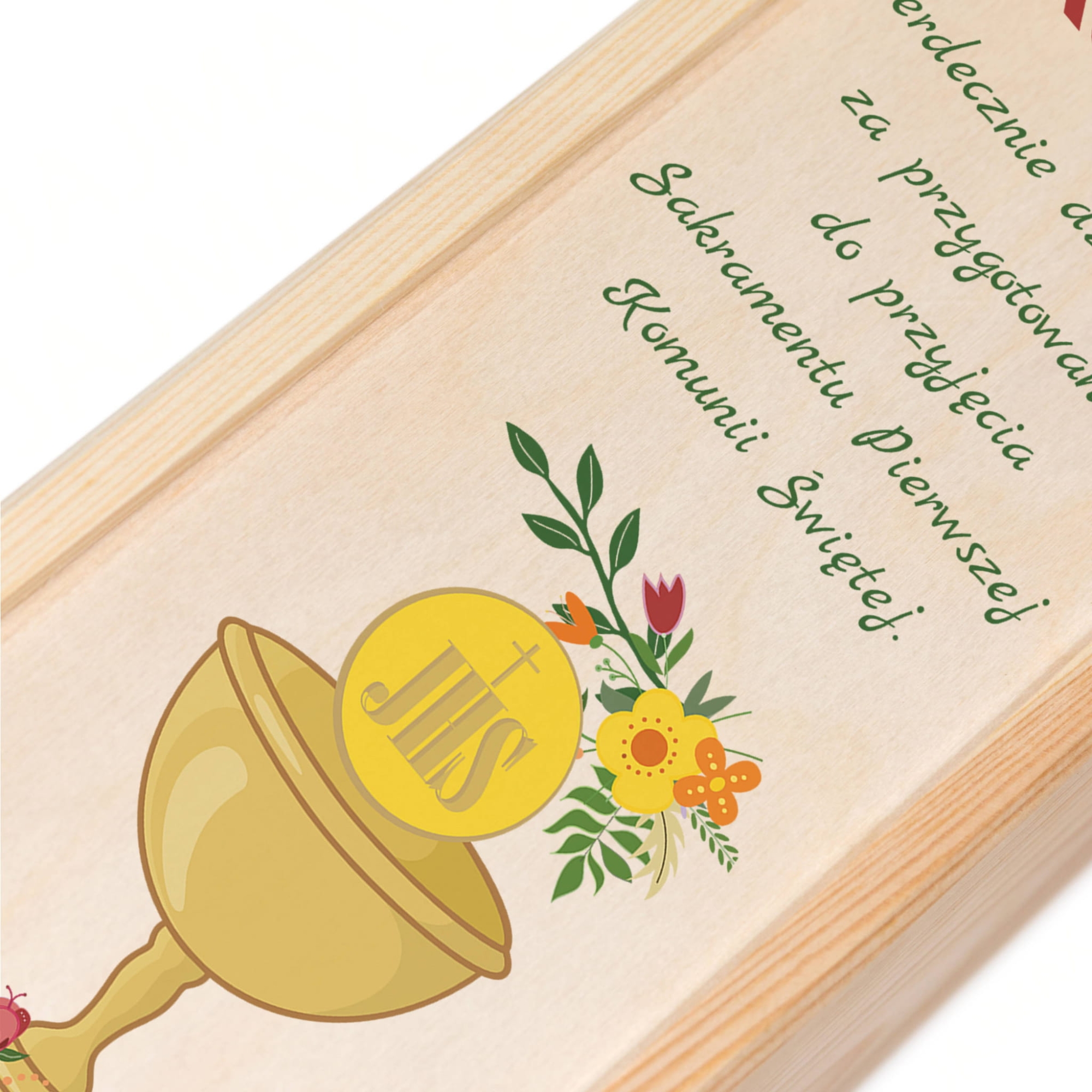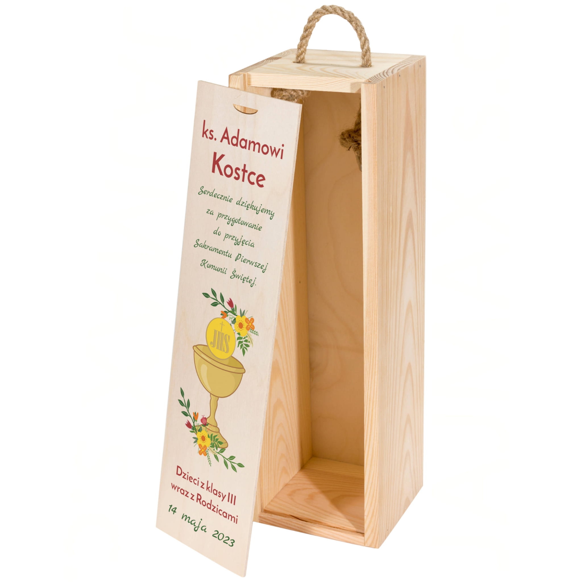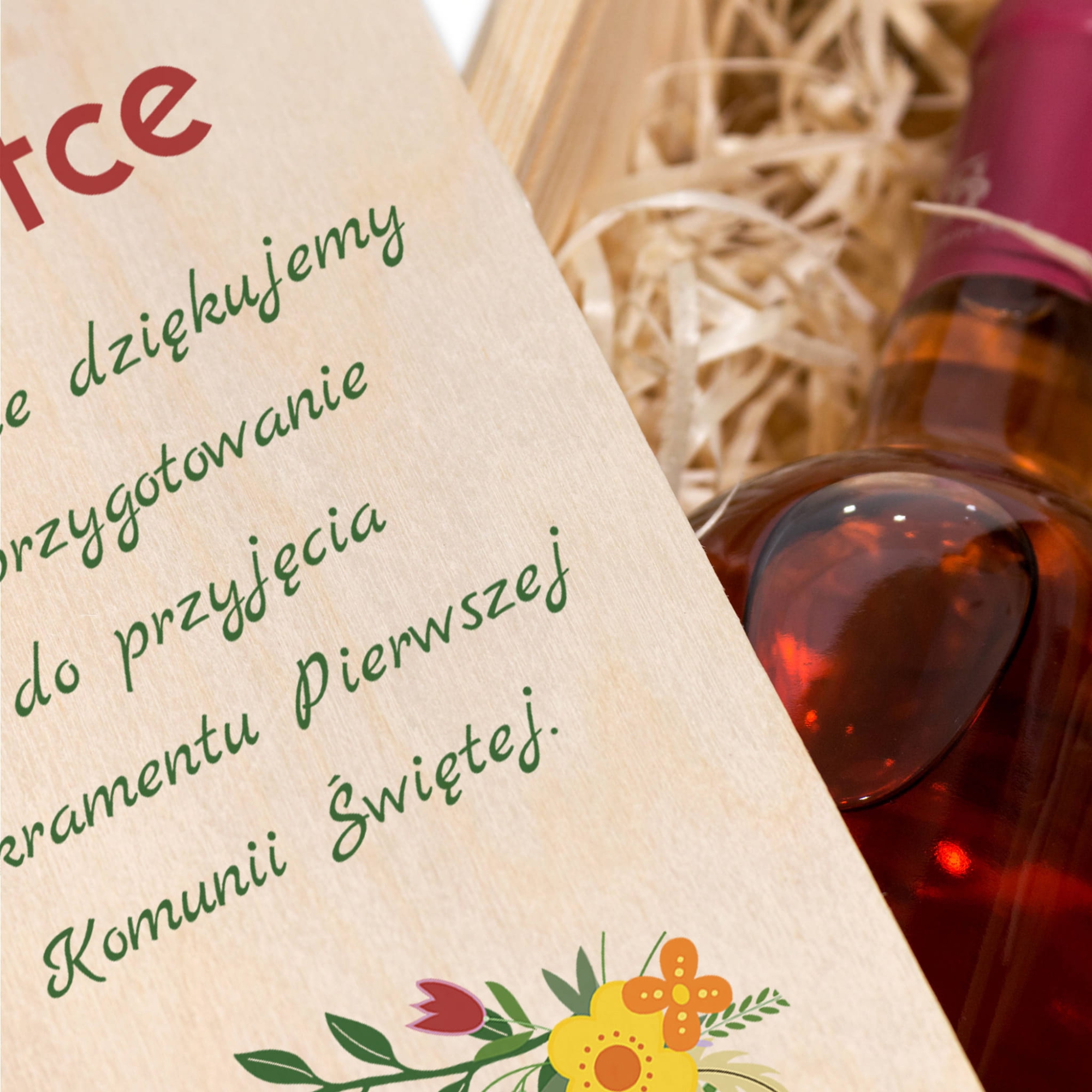 Jeśli organizujesz Komunię dziecka i myślisz o podziękowaniach dla gości nie zapomnij podziękować księdzu, katechetce czy też zakonnicy za przygotowanie dzieci do przyjęcia sakramentu Pierwszej Komunii Świętej. Bez ich wkładu ceremonia I Komunii nie odbyłaby się. Z myślą o wszystkich zaangażowanych w przygotowanie dzieci do tego ważnego sakramentu stworzyliśmy podziękowania w formie skrzynki na wino z nadrukiem. Twój spersonalizowany nadruk jaki na niej umieścimy sprawi, że będzie to miła pamiątka na długie lata. Takie podziękowania sprawdzą się doskonale aby wyrazić wdzięczność od całej klasy, ale także jako indywidualny gest.