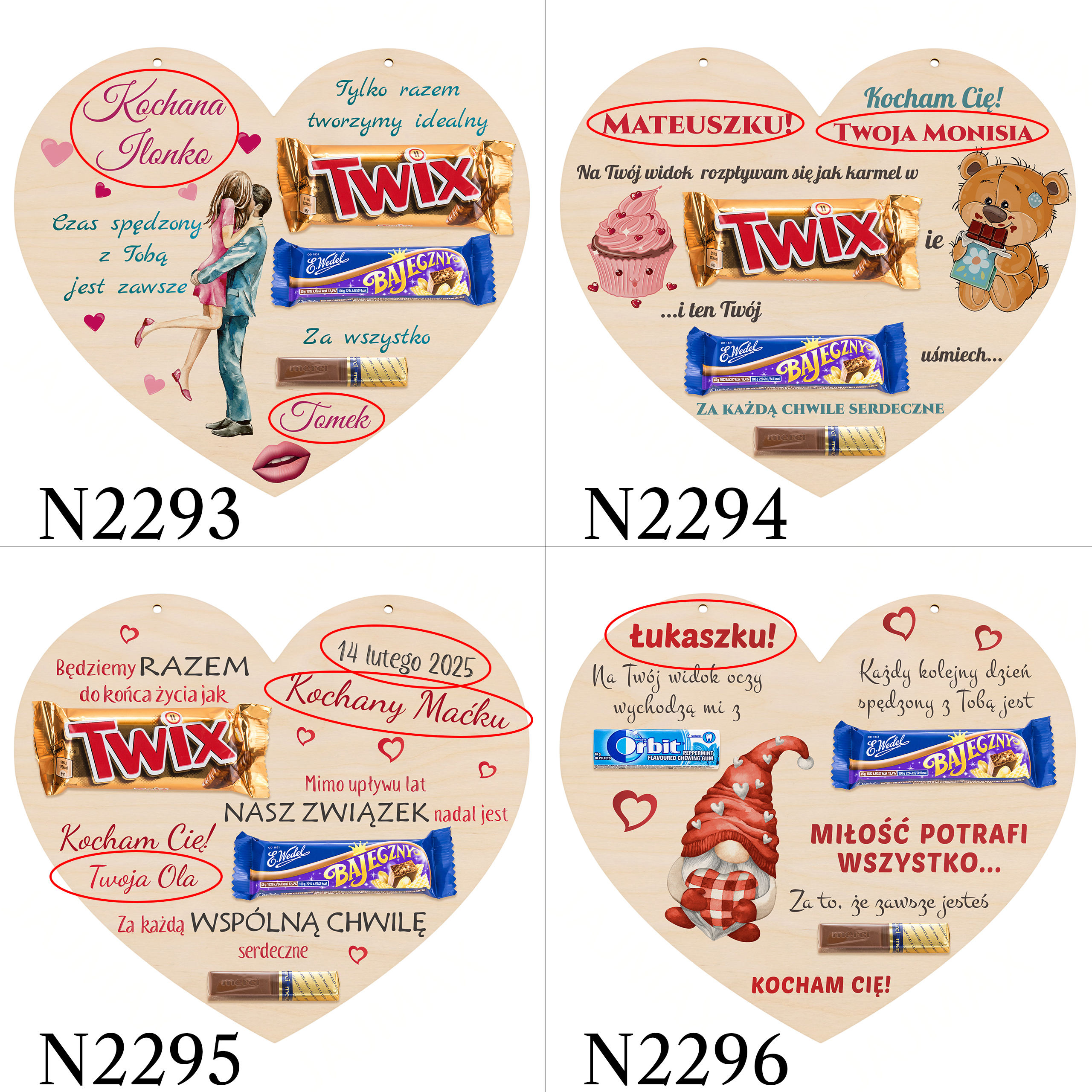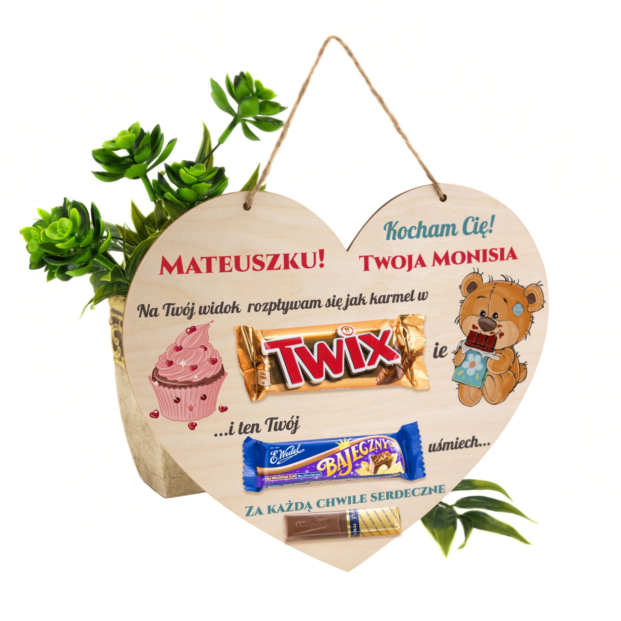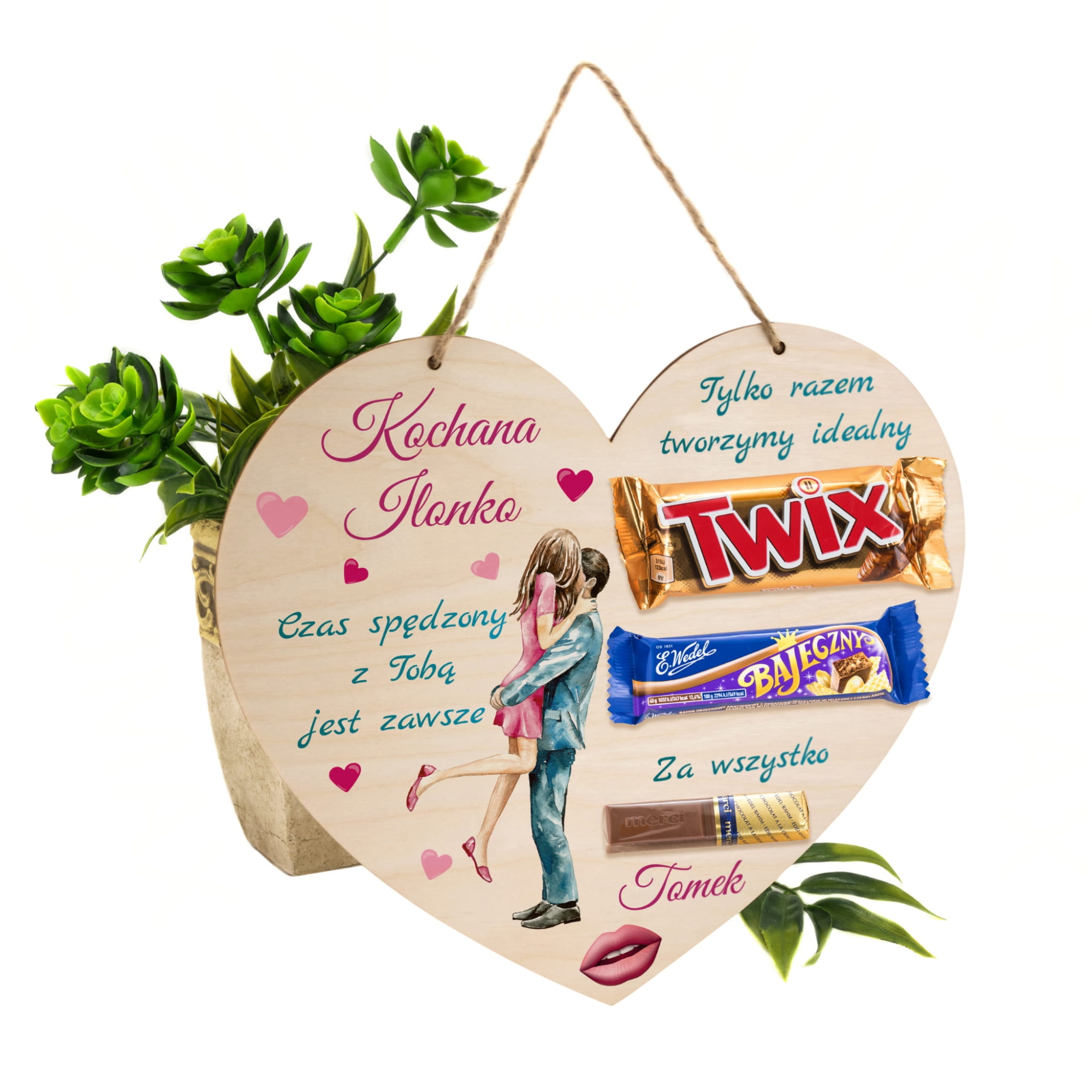 Słodycze na Walentynki to najczęściej wybierany dodatek do prezentu głównego dla Niej i dla Niego. A gdyby tak wykorzystać słodkości do stworzenia pięknego prezentu, w którym powiesz ,,Merci’’ ukochanej osobie i pokażesz światu, jak ,,Bajeczny’’ i idealny z Was ,,Twix’’? Wykonana z drewna tabliczka dyplom na słodycze SERCE to aż 4 motywy do wyboru, a każdy z nich wyjątkowy. Zamień tradycyjne słodycze na Walentynki na dyplom, któremu nie oprze się żaden miłośnik czekolady. Zestaw zawiera również sznurek jutowy, dzięki któremu obdarowana osoba bez problemu powiesi słodkie trofeum z życzeniami w wybranym przez siebie miejscu.