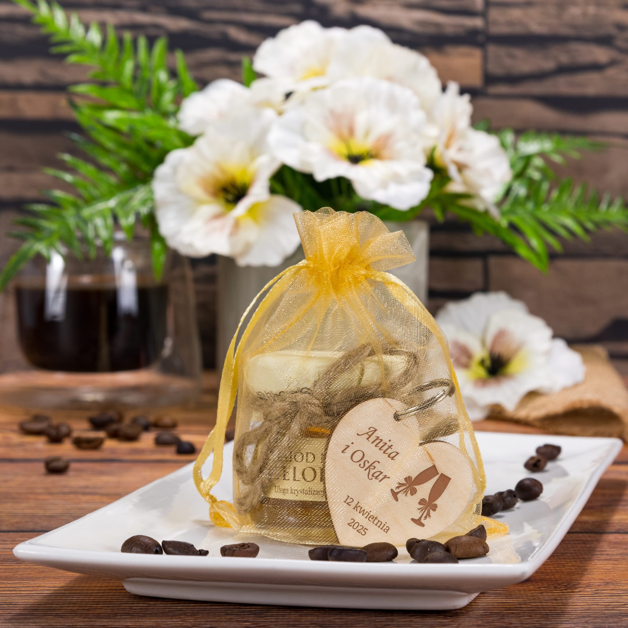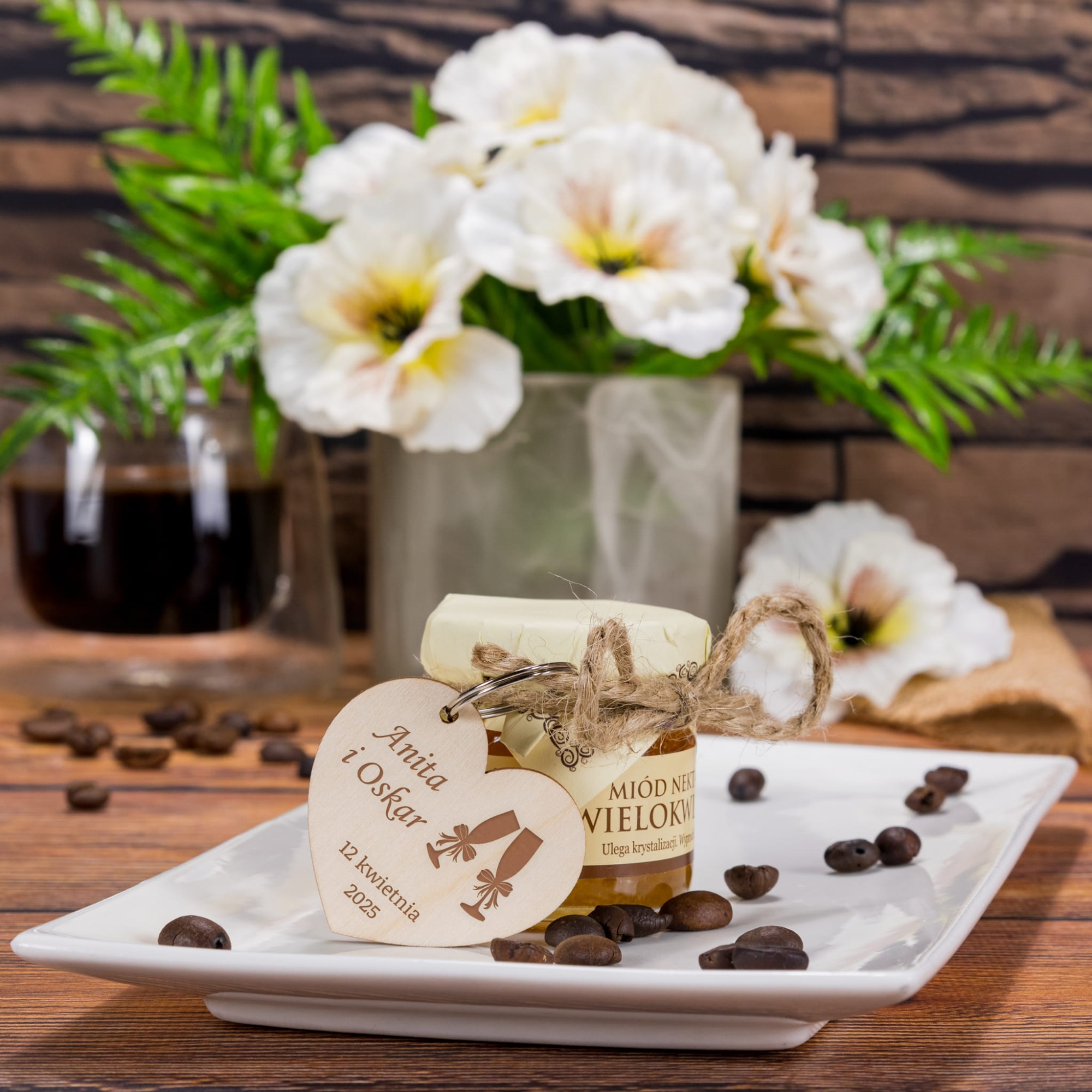 Drewniany breloczek Twój grawer i miodzik w ozdobnym woreczku super upominek dla gości na ślub