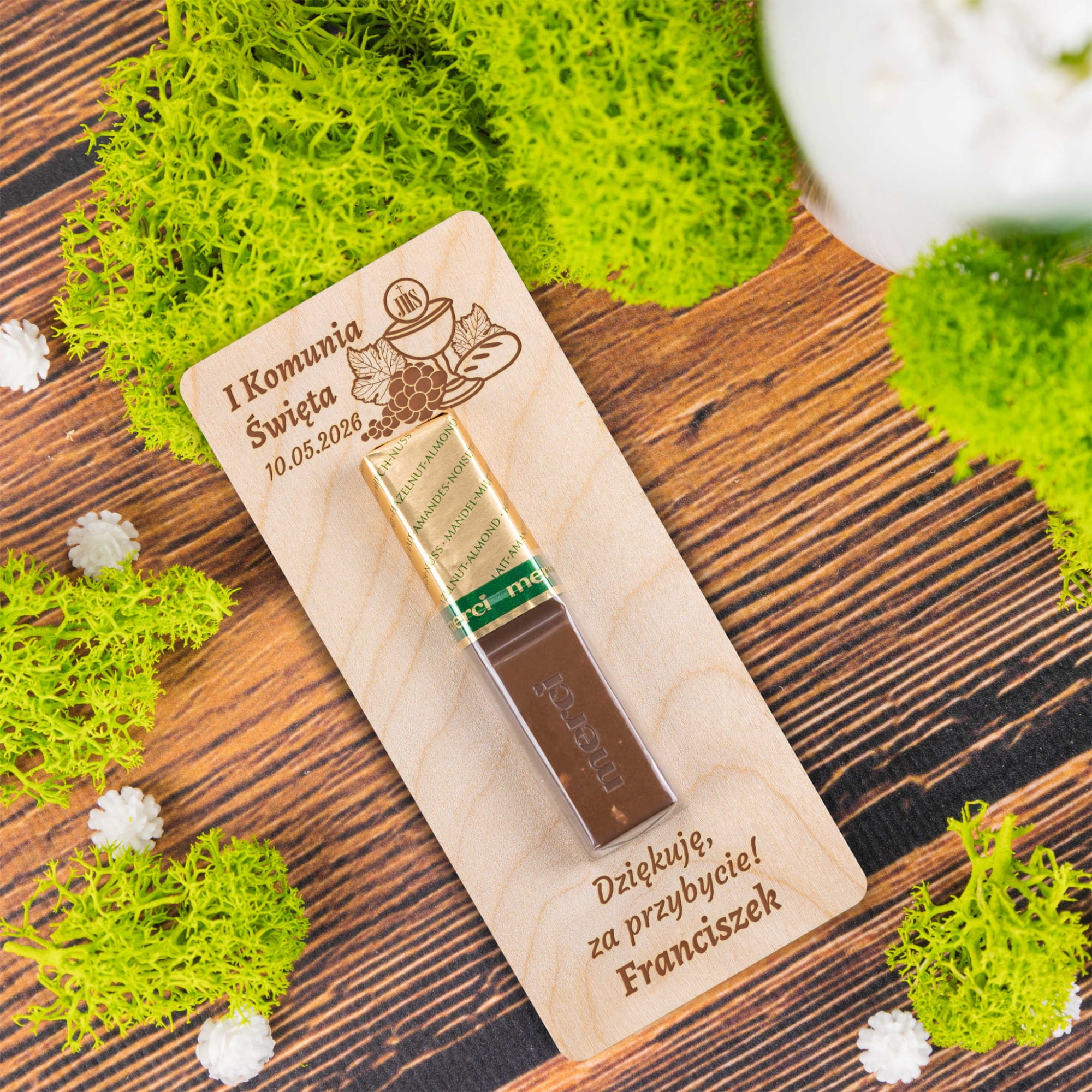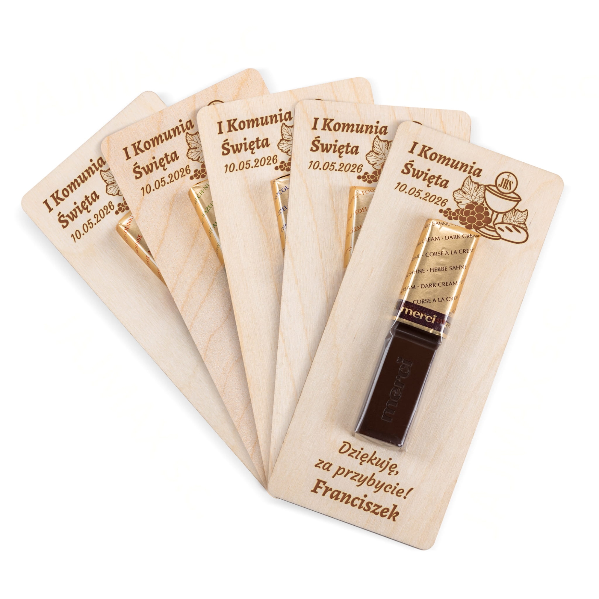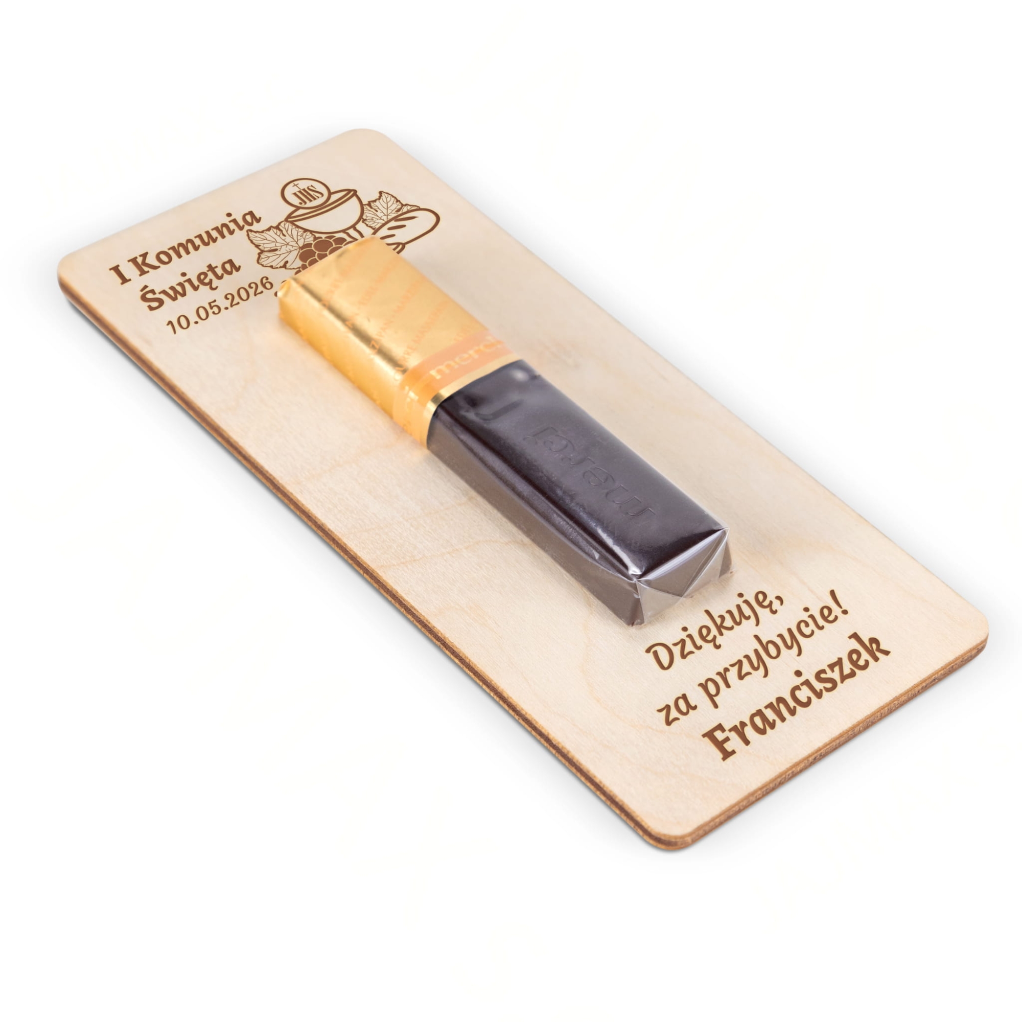 Słodkie podziękowania na komunię deseczka z Merci i imieniem