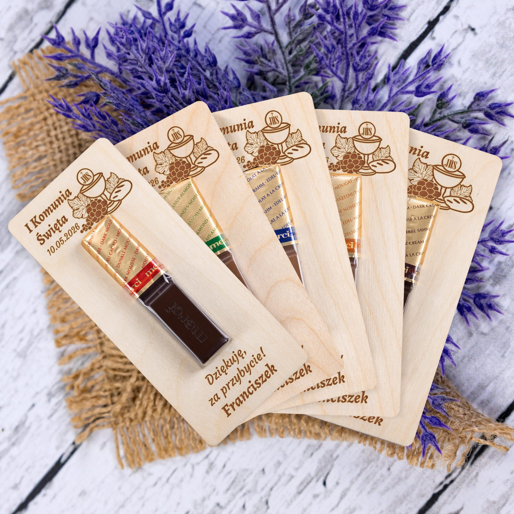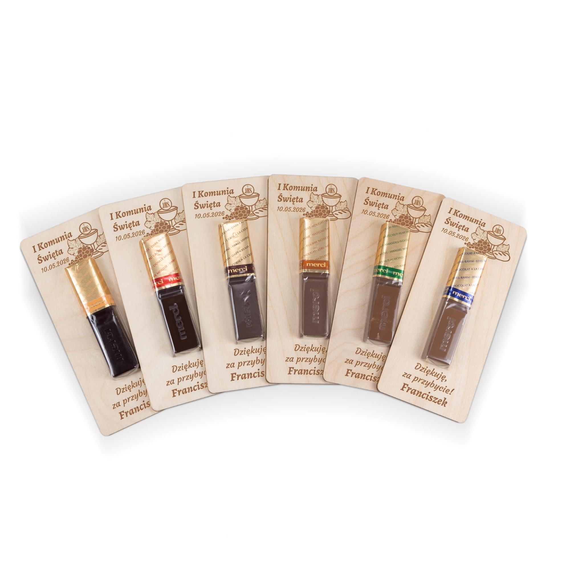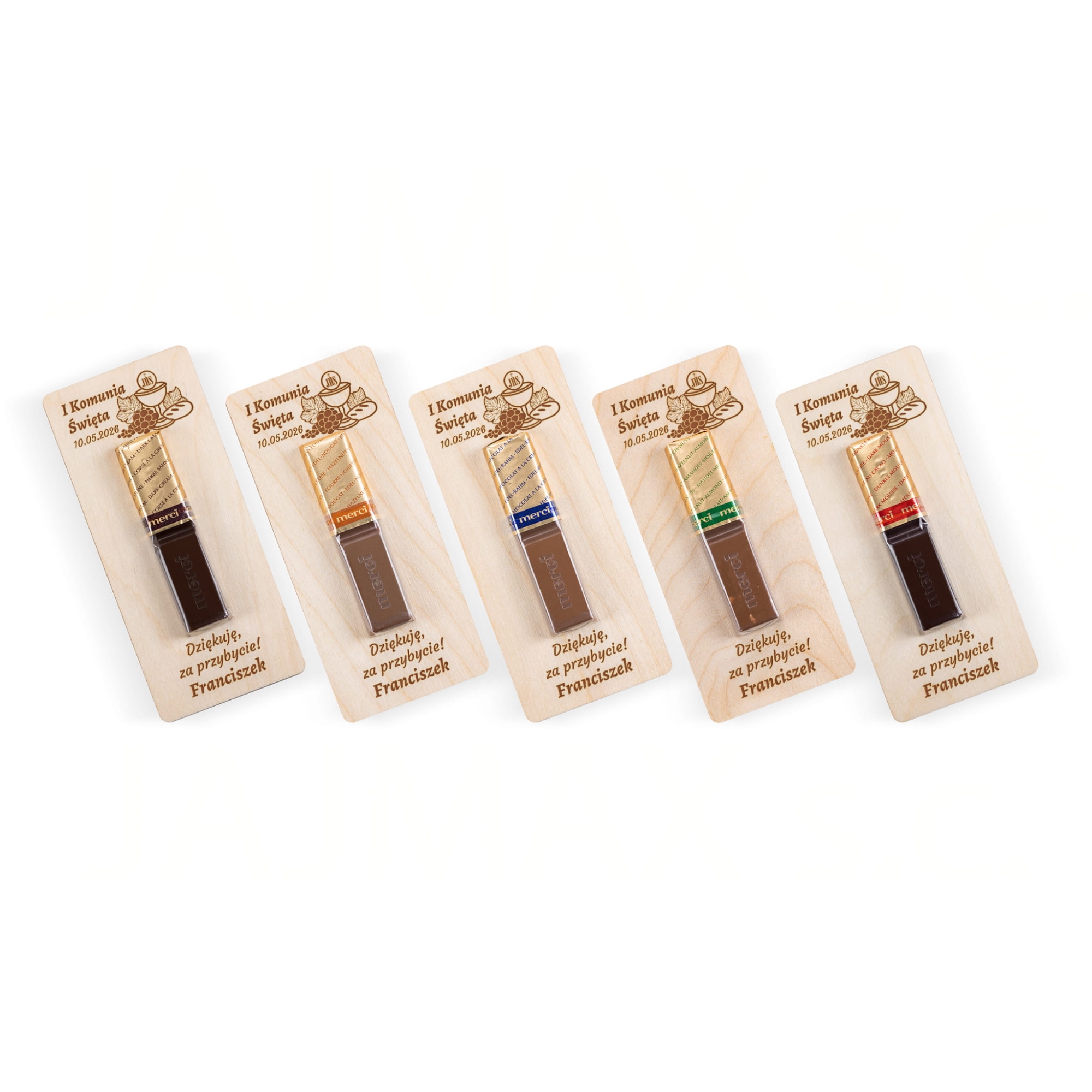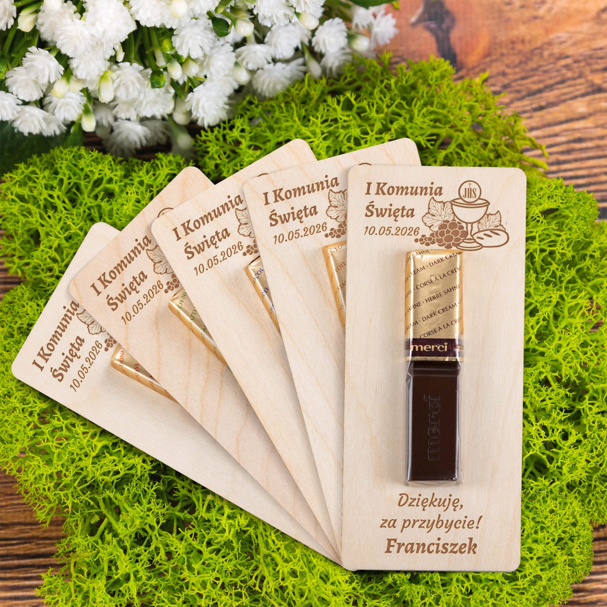 Słodkie podziękowania na komunię deseczka z Merci i imieniem