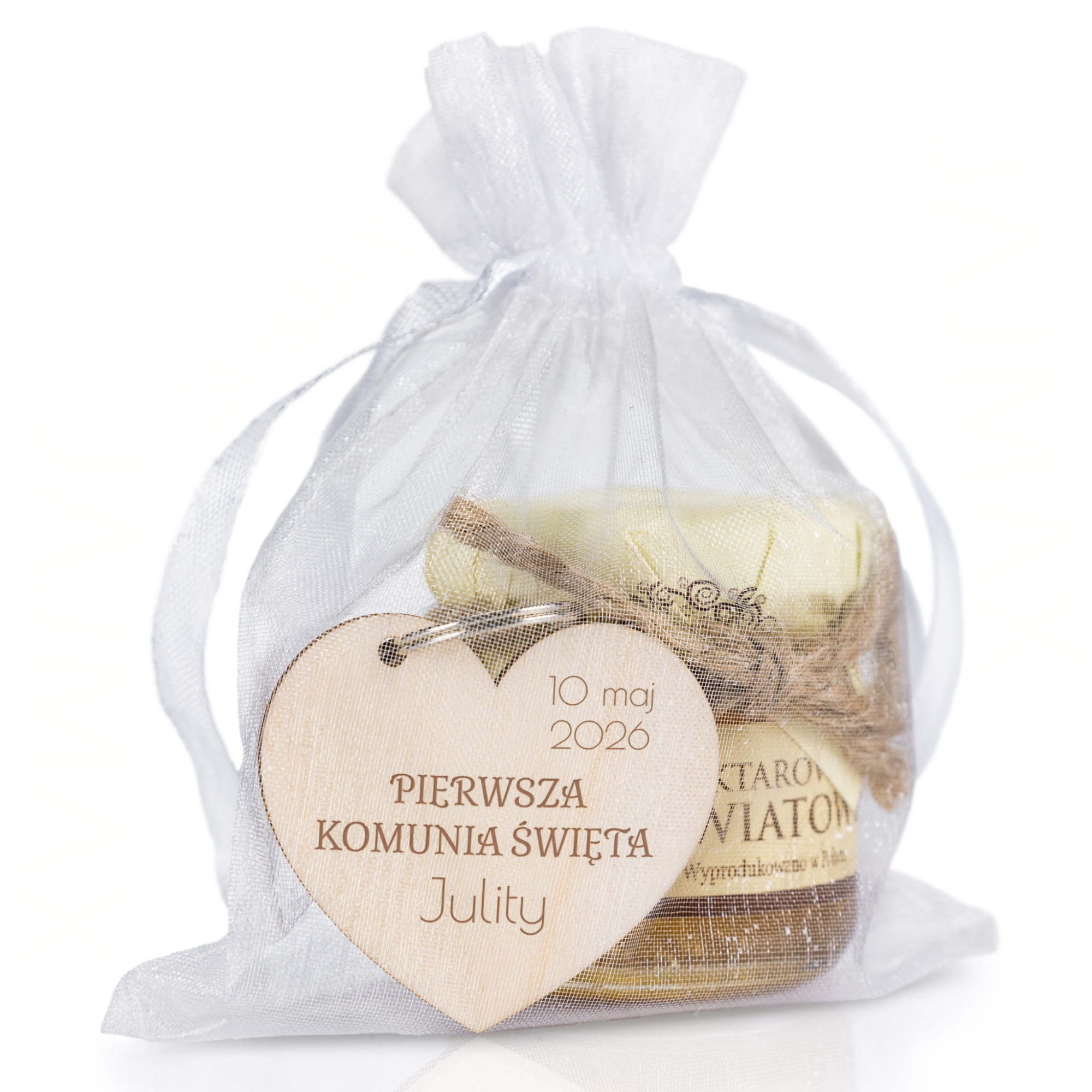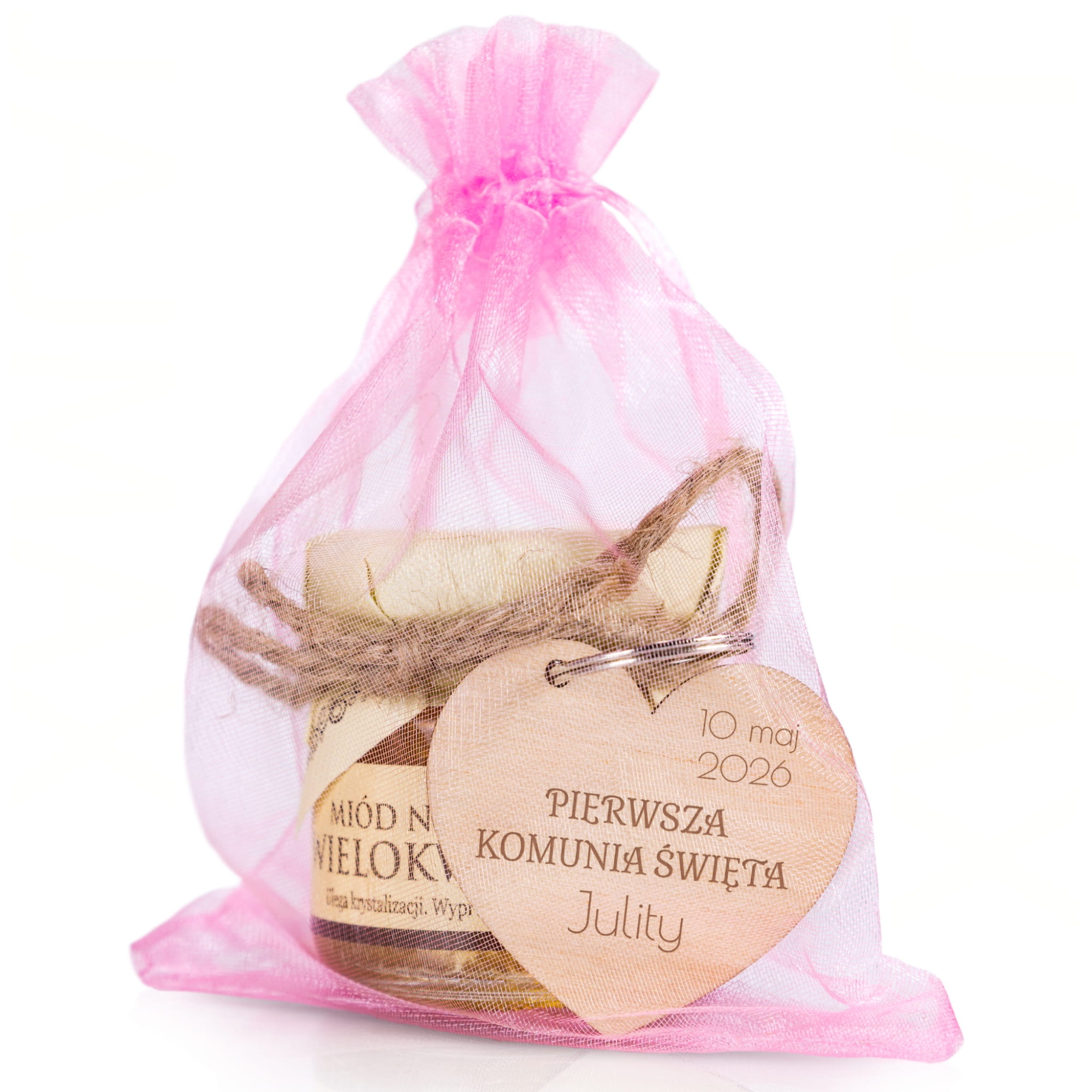 Podziękuj swoim gościom w wyjątkowy sposób. Zestaw miodu z breloczkiem to elegancka forma podziękowania na Komunię, która łączy smak naturalnej słodyczy z symbolicznym upominkiem.