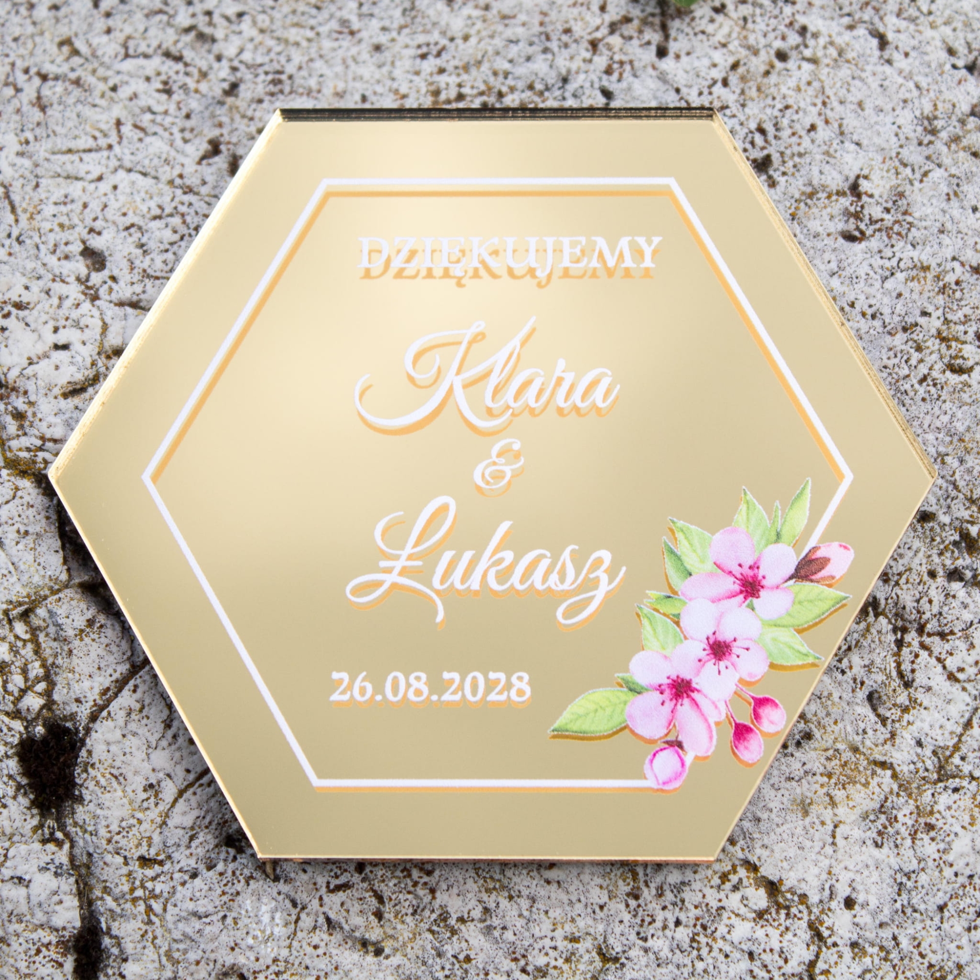 Spersonalizowane podziękowanie ślubne magnes złoty heksagon