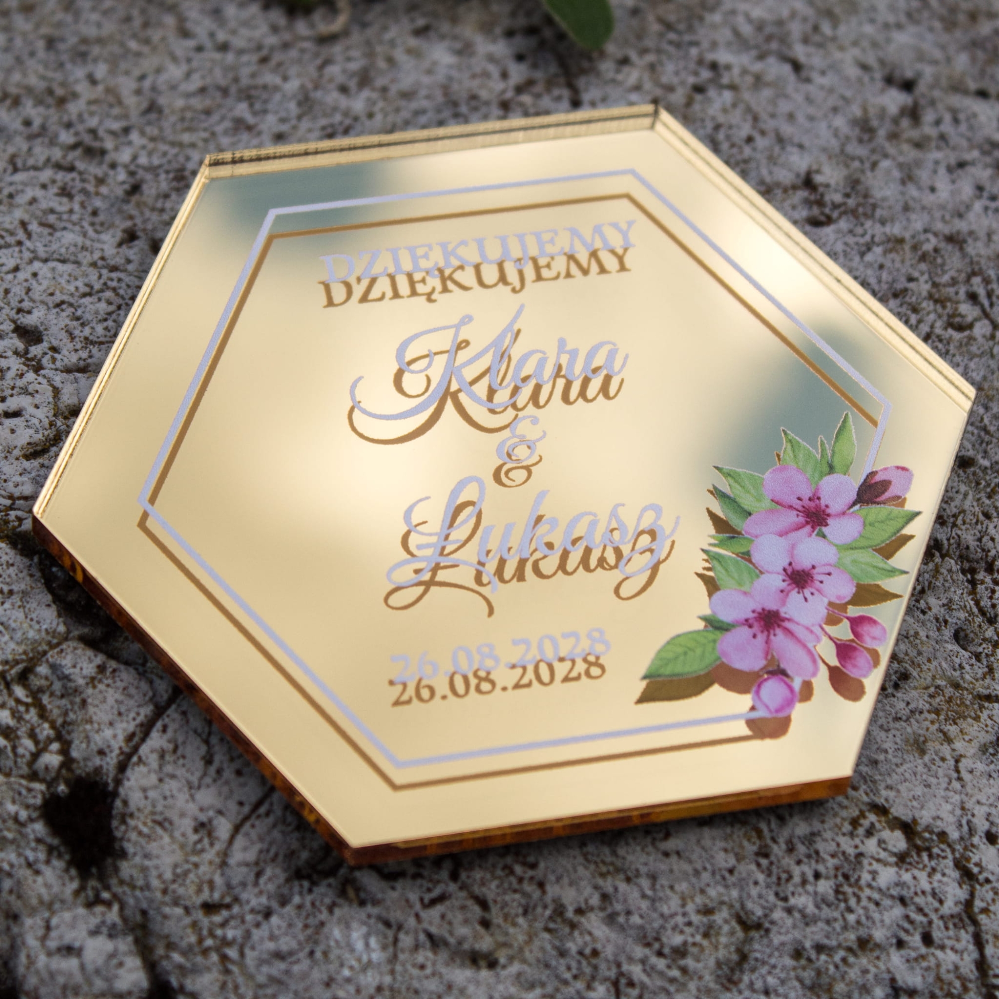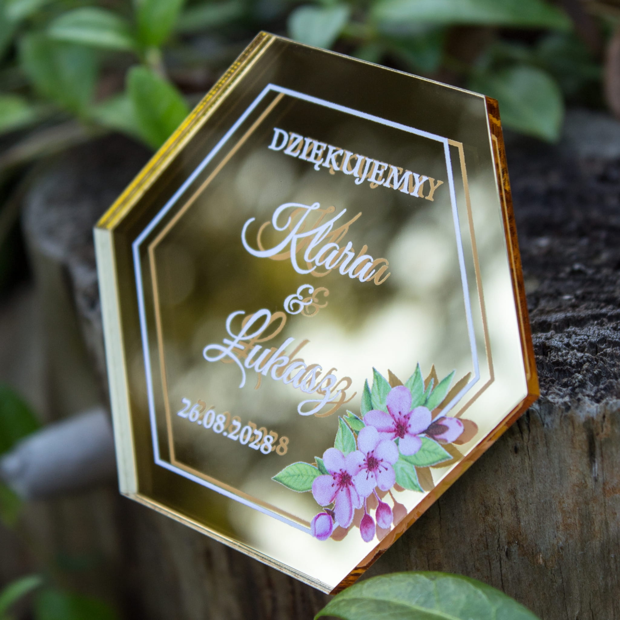 Jeśli zależy Ci na czymś oryginalnym i eleganckim – ten złoty heksagon będzie strzałem w dziesiątkę. To piękny prezent ślubny, który możesz wręczyć zarówno na zakończenie wesela, jak i przy powitaniu gości. Mała forma – ogrom emocji.