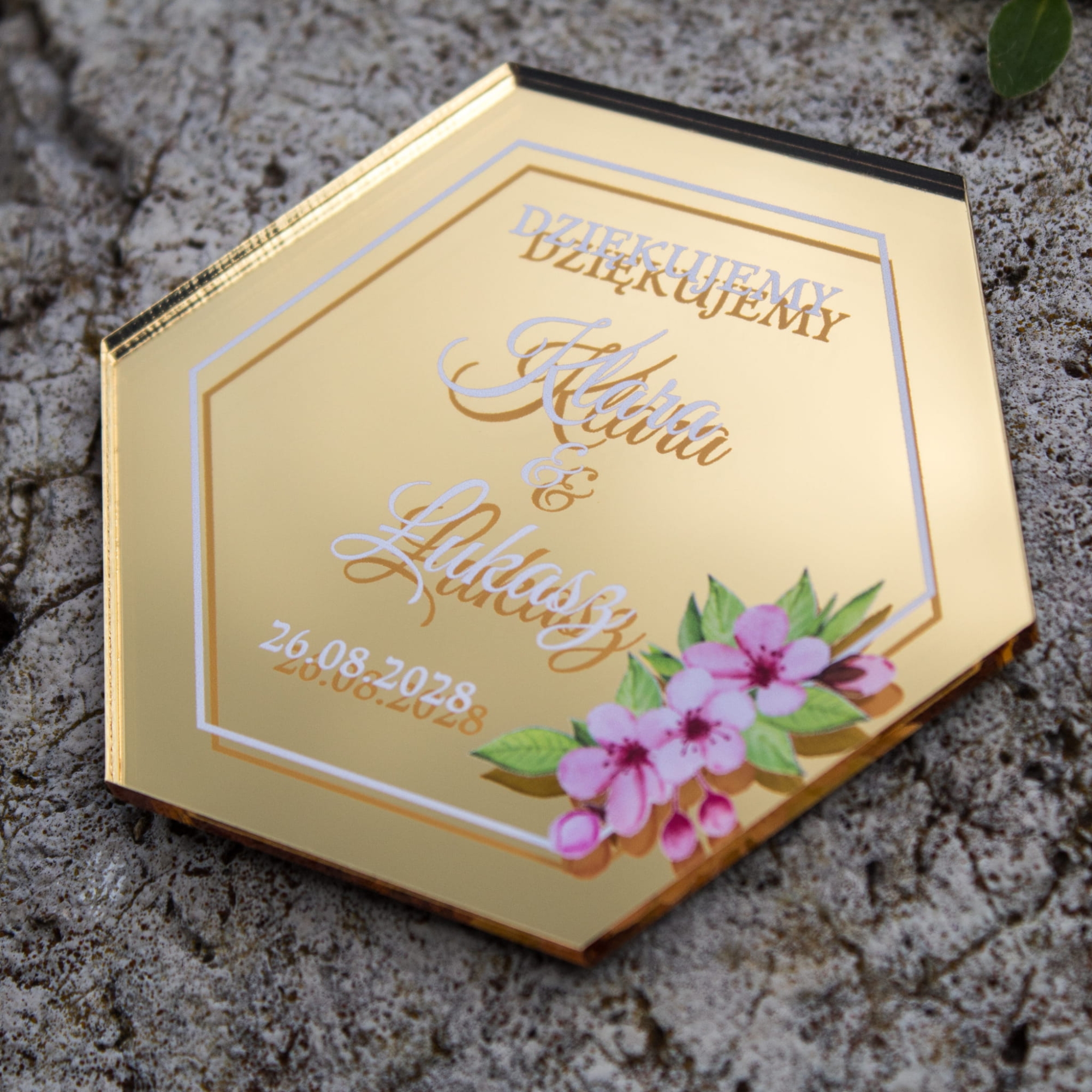 Planujesz ślub i chcesz w wyjątkowy sposób podziękować swoim bliskim za obecność w tym ważnym dniu? Złoty magnes w kształcie heksagonu to subtelny, a zarazem efektowny sposób, by wyrazić wdzięczność. Wyróżnia się nie tylko personalizacją, ale też eleganckim połyskiem i romantycznym kwiatowym zdobieniem, które dodaje mu uroku.