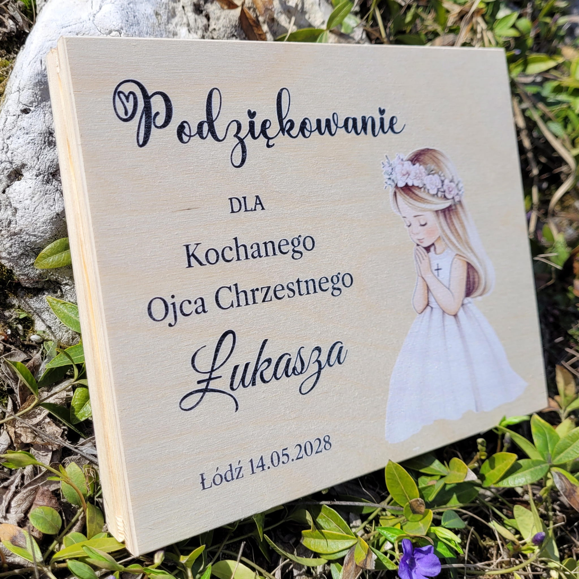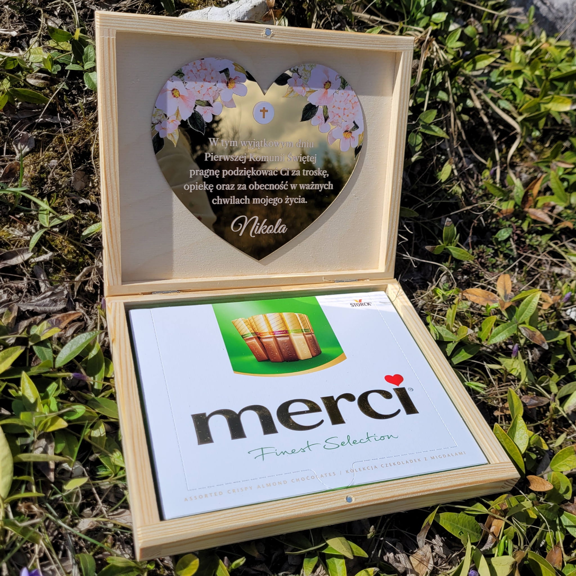 Podziękuj Ojcu Chrzestnemu za obecność, troskę i duchowe wsparcie, wręczając mu eleganckie pudełko na czekoladki Merci. To nie tylko słodki upominek, ale też wzruszające podziękowanie dla chrzestnych na komunię, zaprojektowane z myślą o emocjach i pamięci. Wykonane z drewna, z możliwością dodania imienia dziecka oraz osobistej dedykacji.