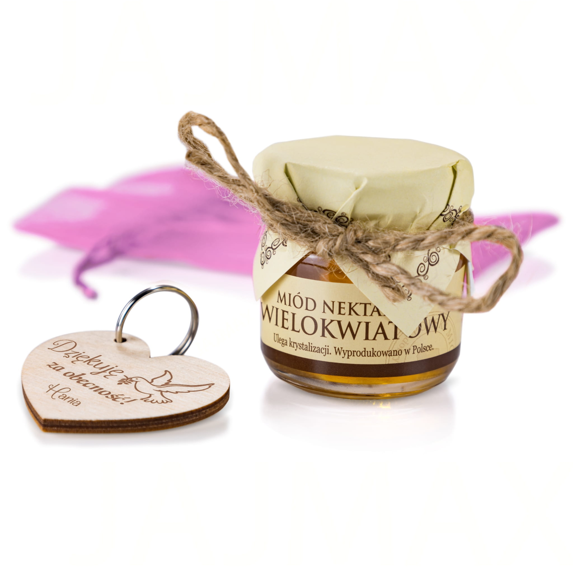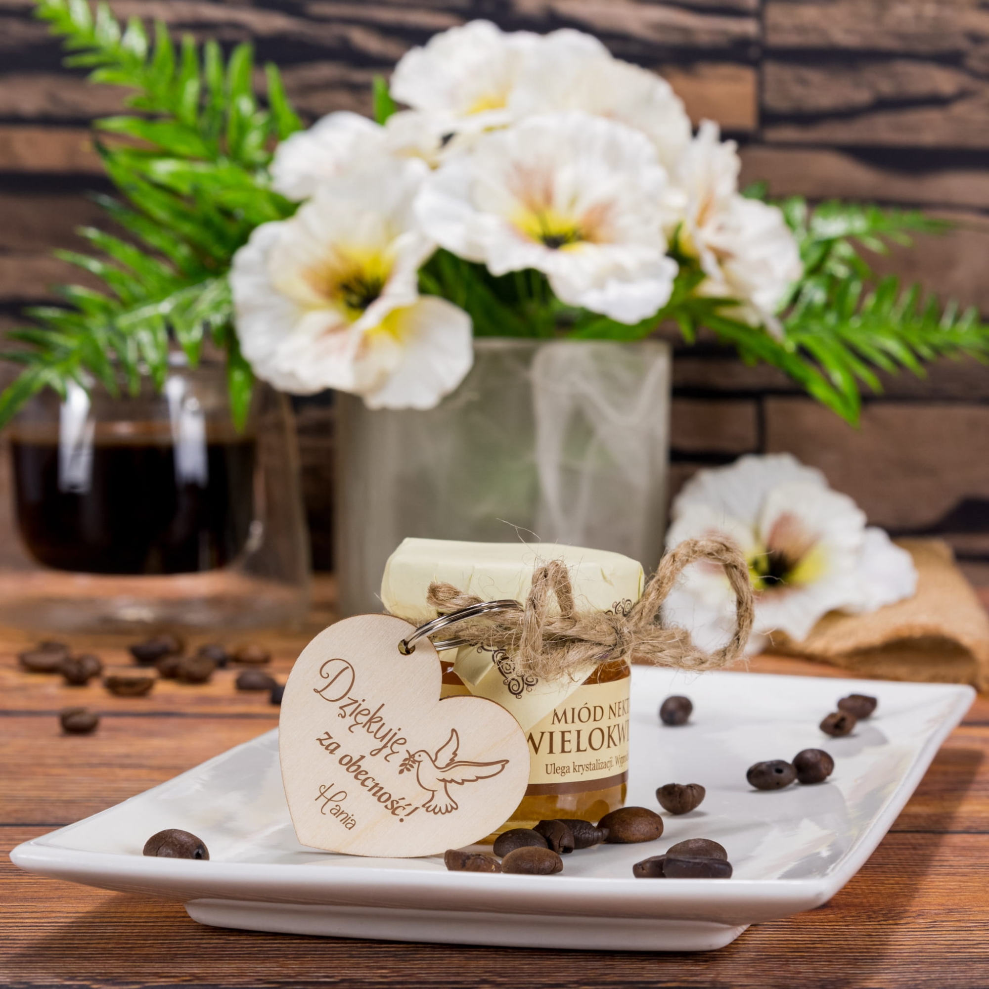 Spersonalizowany breloczek serce z miodem naturalnym na podziękowanie komunijne
