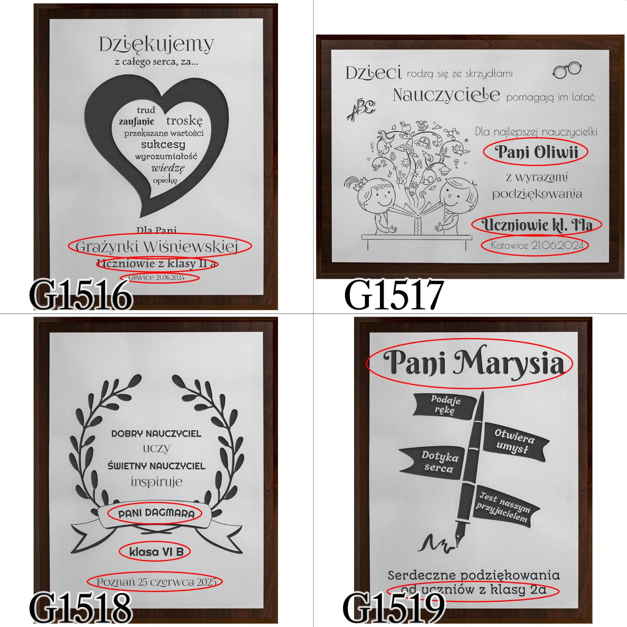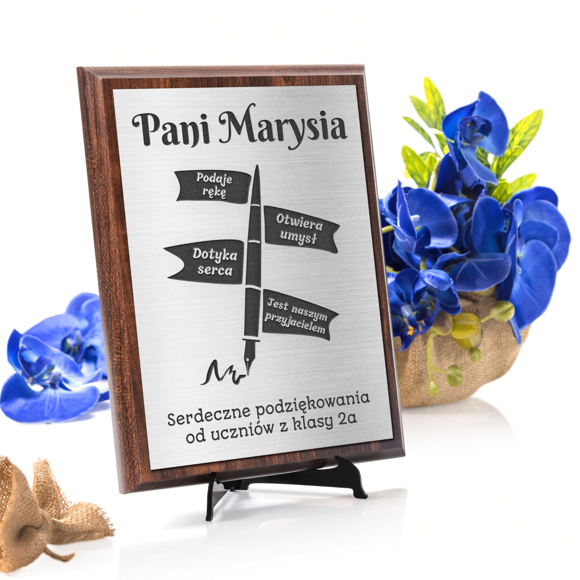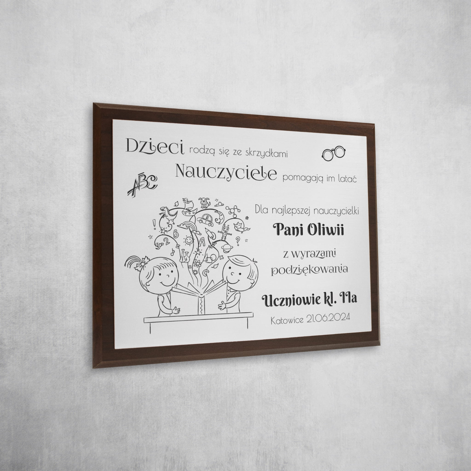 Chcesz podarować wyjątkowy prezent dla nauczyciela, którego najbardziej cenisz, aby wyróżnić go spośród innych? Chcecie wręczyć oryginalny prezent dla wychowawcy od całej klasy, ale nie wiecie co wybrać ? Specjalnie na Dzień Nauczyciela i na zakończenie roku szkolnego stworzyliśmy niepowtarzalny produkt. Dyplom dla nauczyciela z podziękowaniami to nasza wyjątkowa propozycja upominku. Piękny drewniany obrazek ze srebrną tabliczką z laminatu z Twoim indywidualnym grawerem to niepowtarzalna pamiątka dla nauczyciela. Srebrny obrazek można zawiesić na ścianie lub postawić na półce, dzięki temu każdy nauczyciel będzie mógł znaleźć dla niego odpowiednie miejsce.