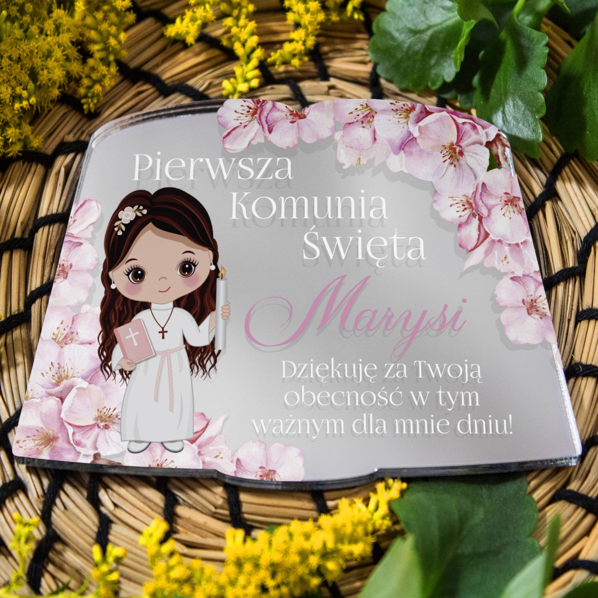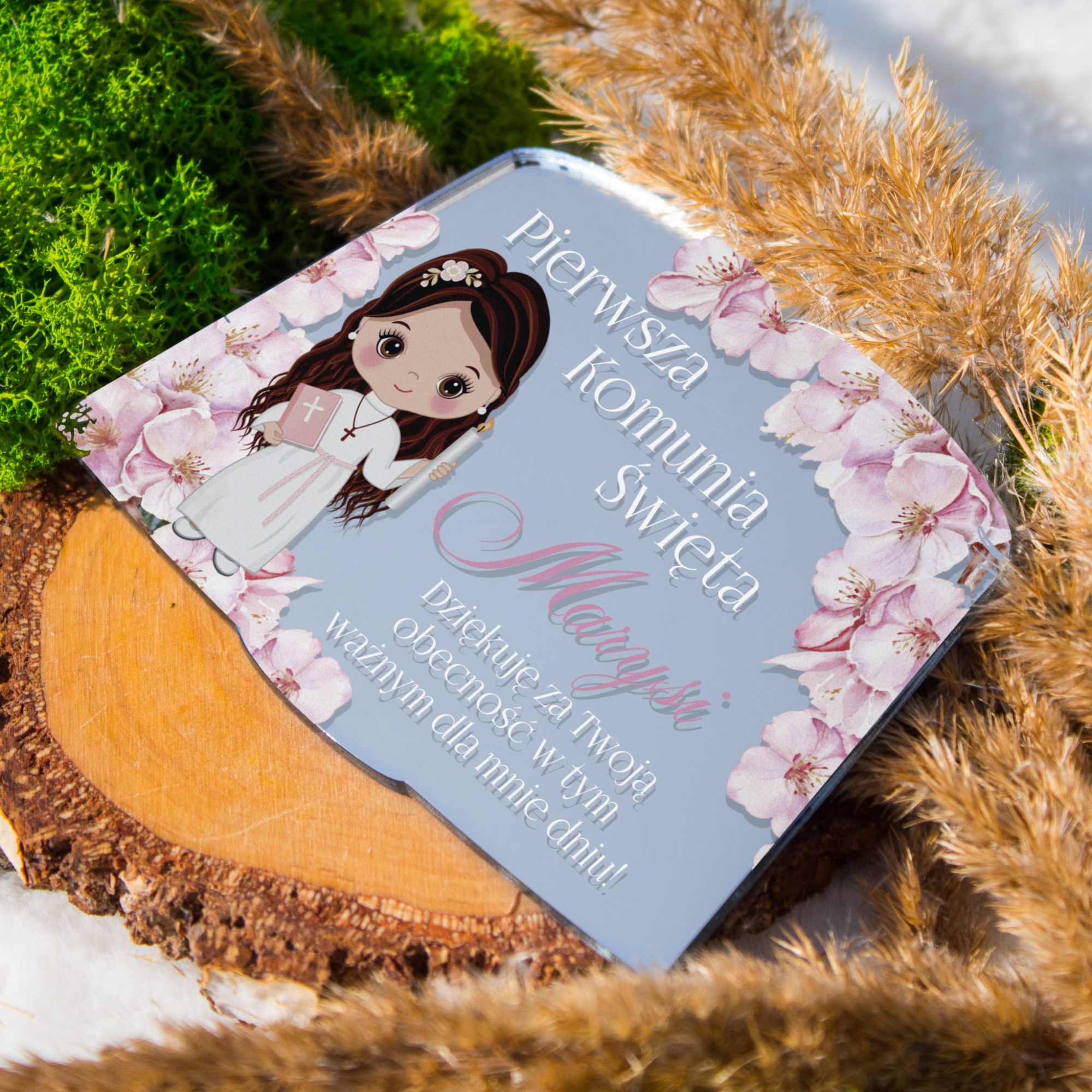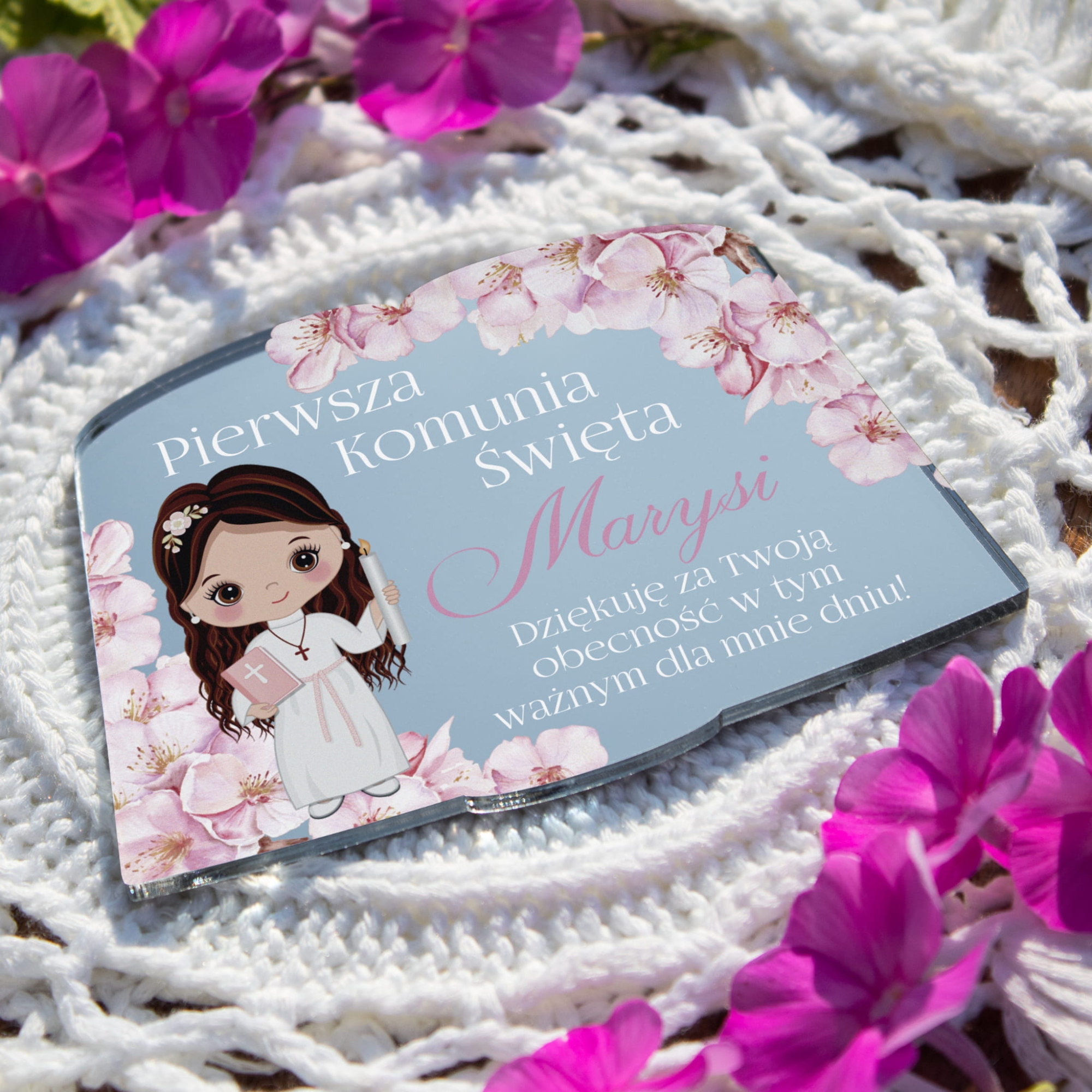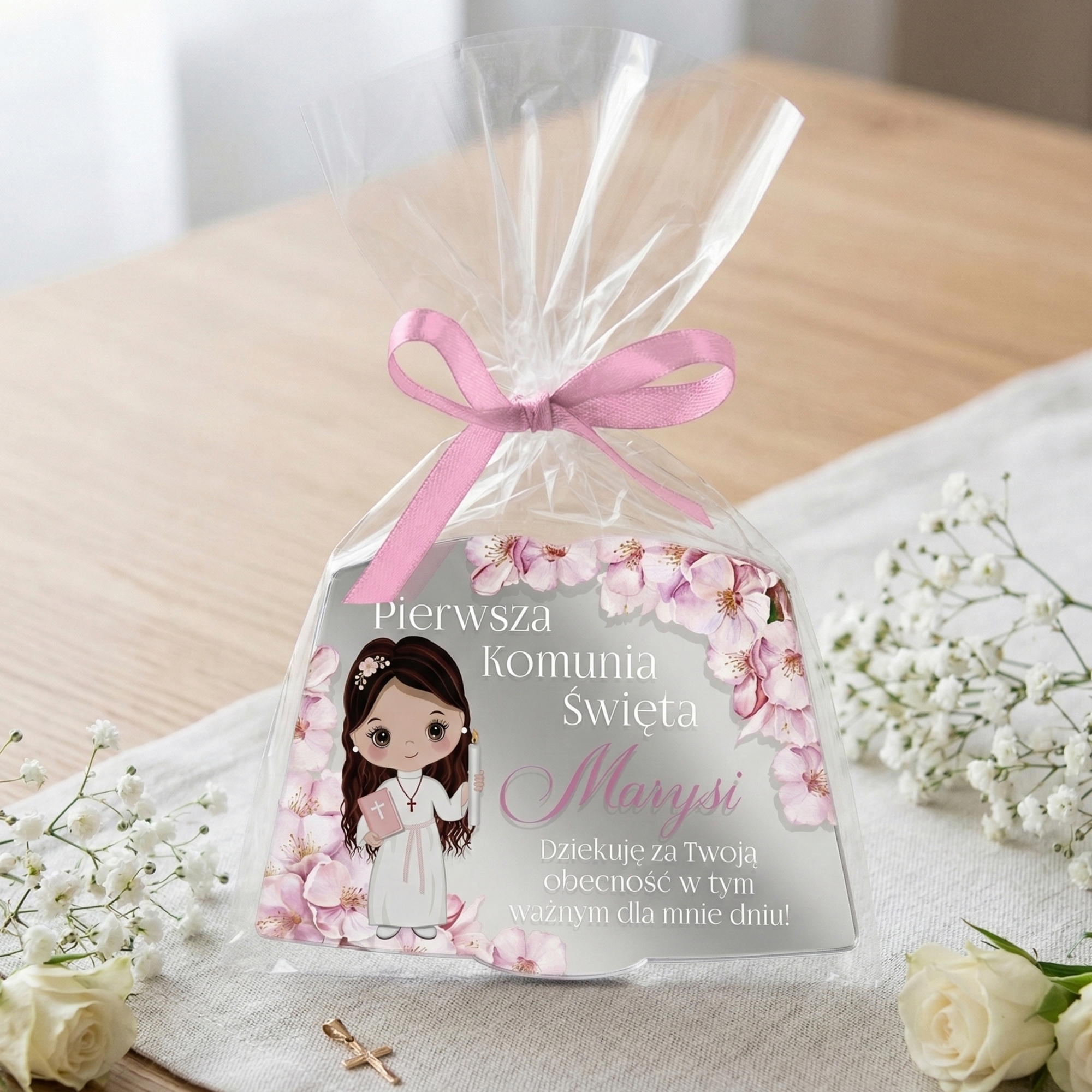 Metaliczny magnes to wyjątkowo nowoczesna forma podziękowania dla gości Pierwszej Komunii Świętej. Subtelne srebrne wykończenie i prosty design nadają mu uniwersalnego charakteru.