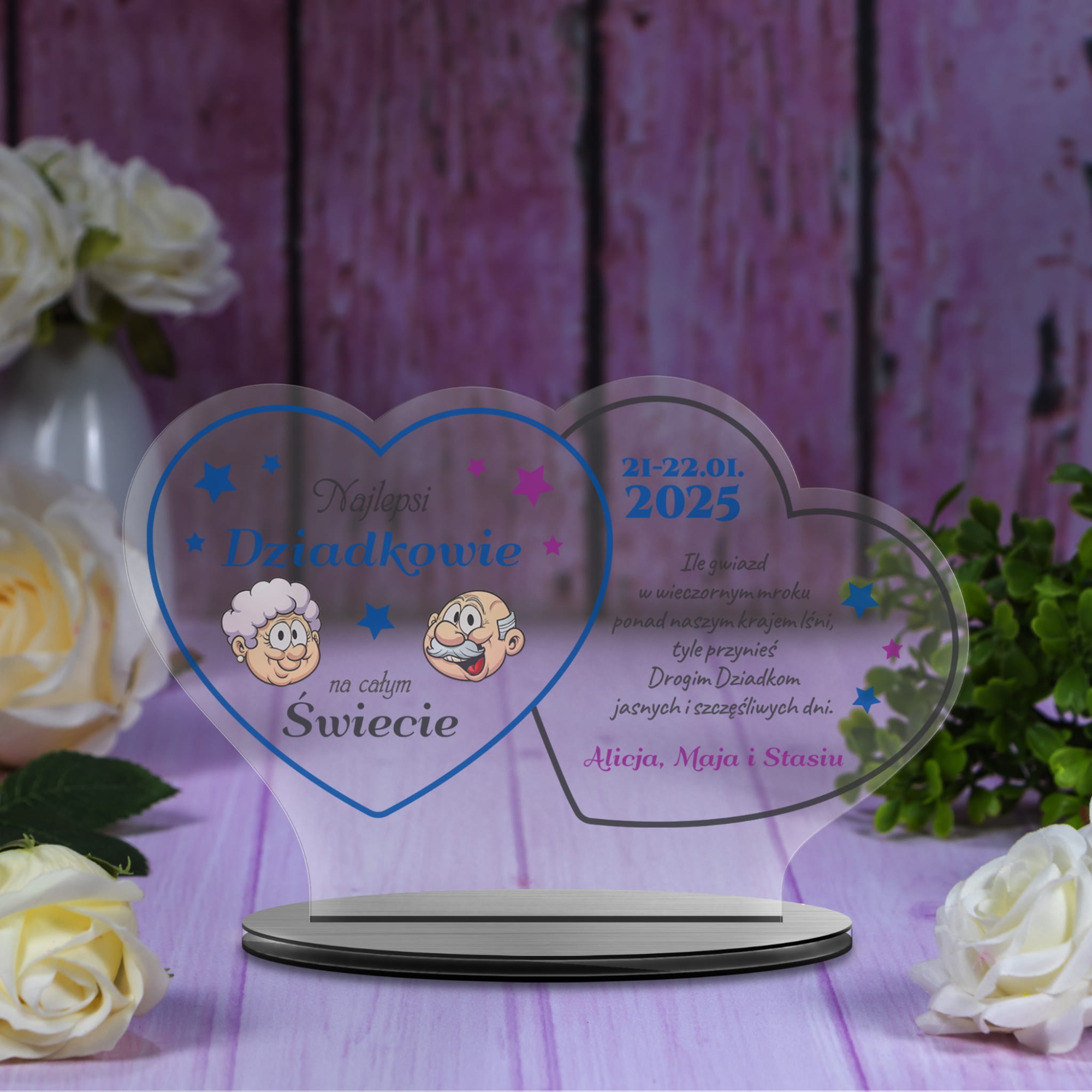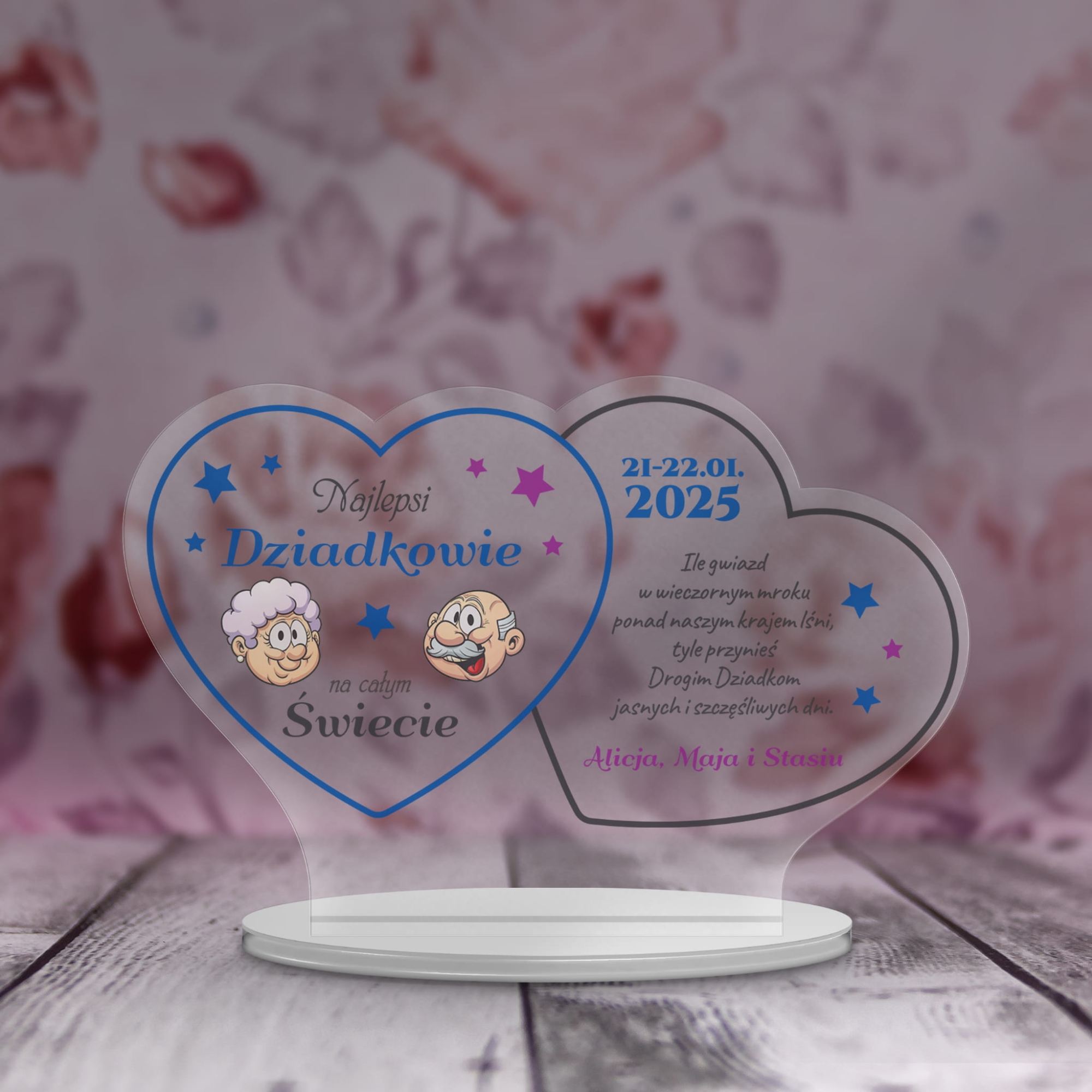 Statuetka dwa serca z indywidualnym nadrukiem życzenia dla dziadków