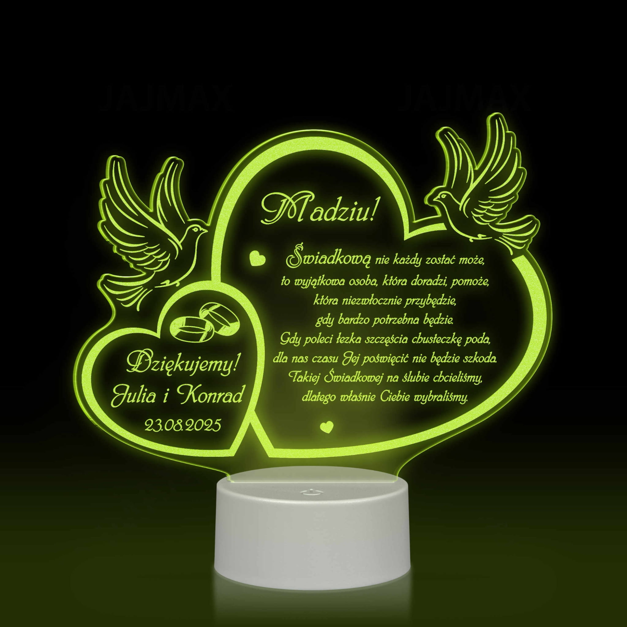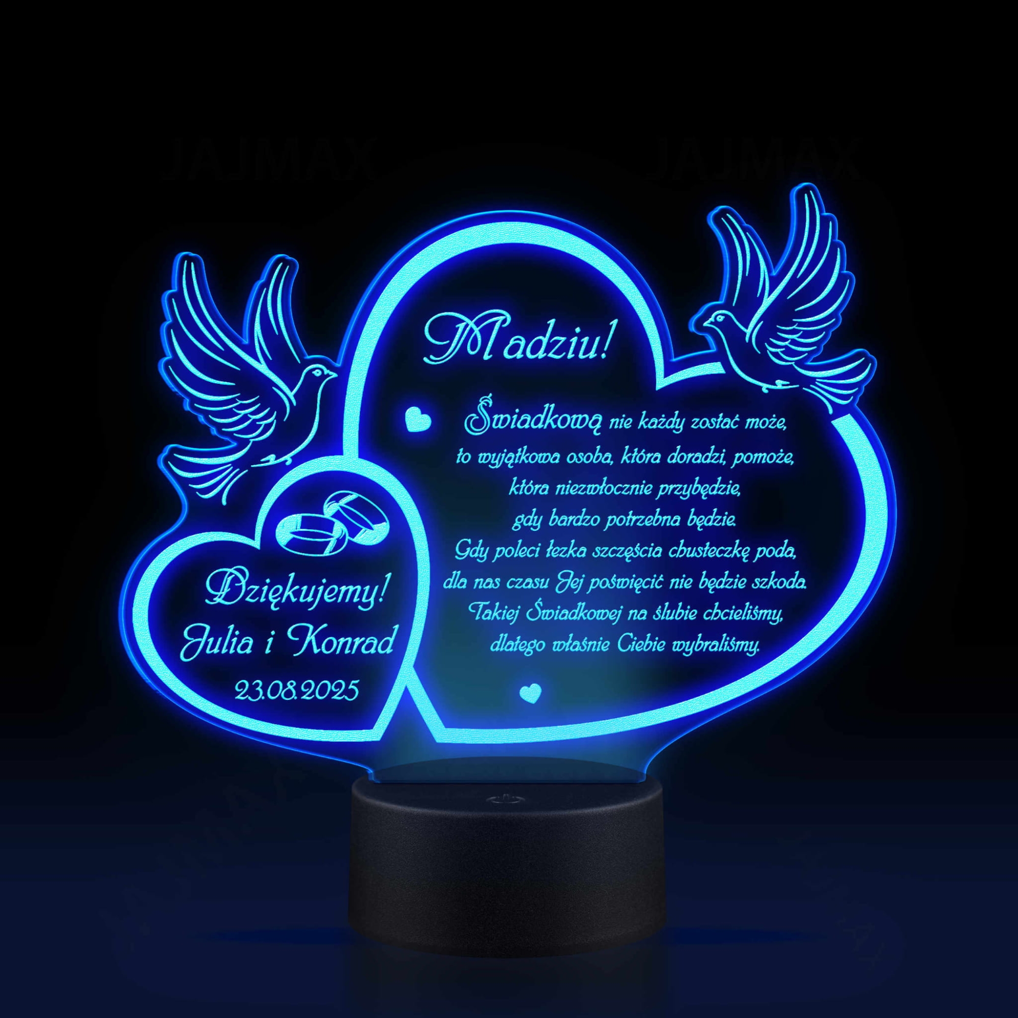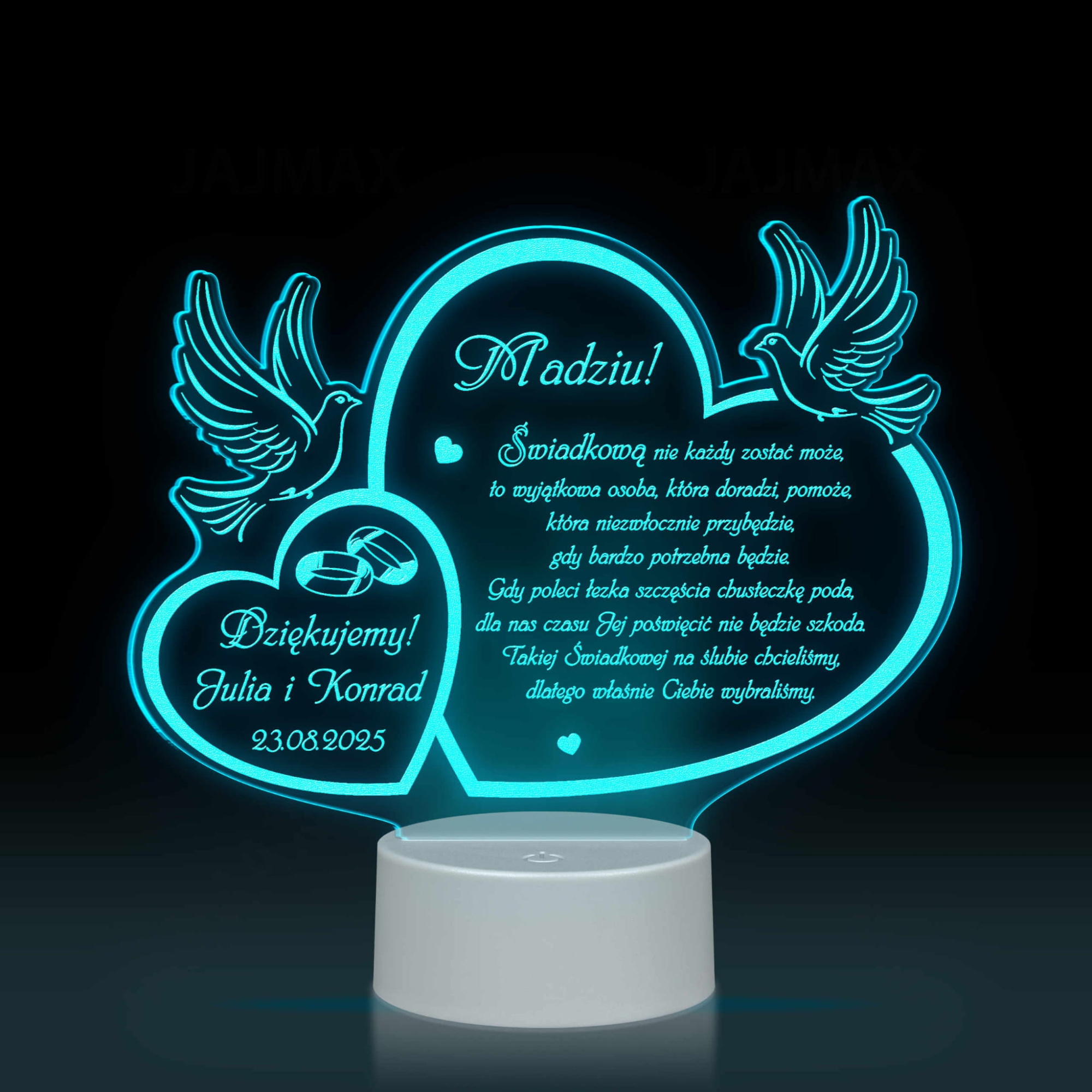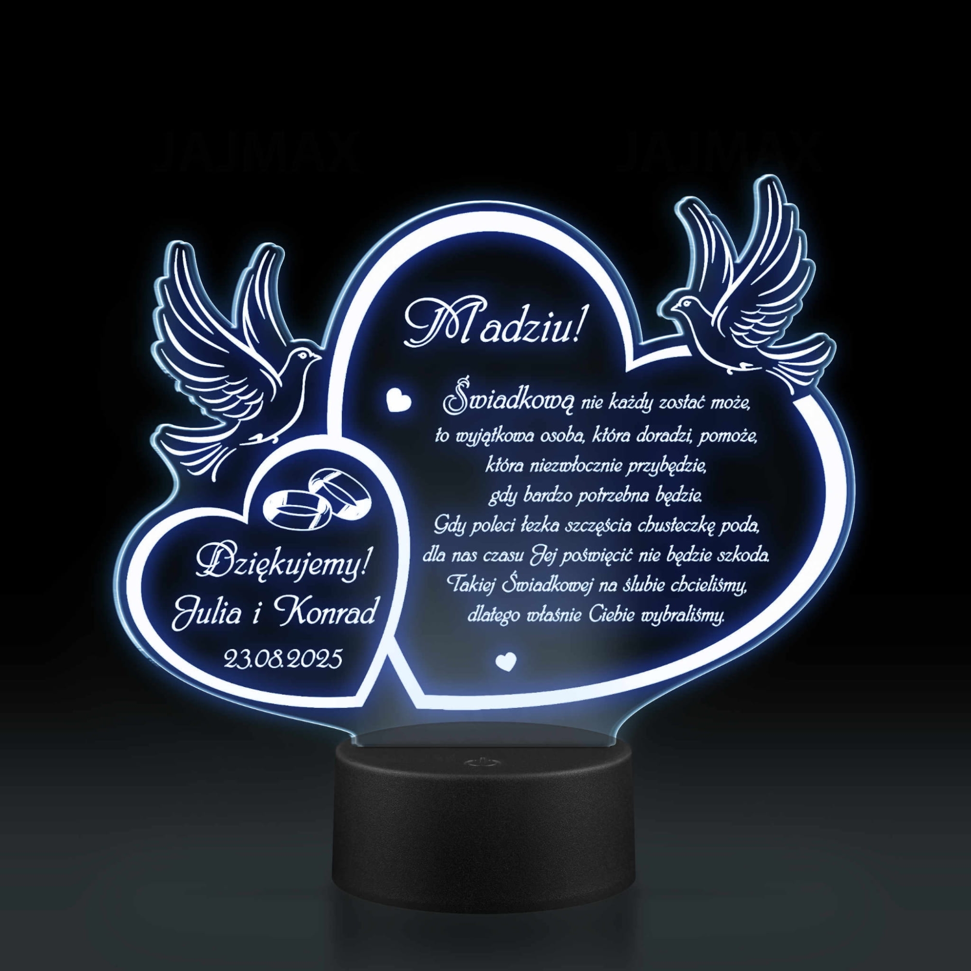 Tradycją praktycznie na każdym ślubie są podziękowania dla rodziców, podziękowania dla chrzestnych, podziękowania dla dziadków, podziękowania dla świadków. Zazwyczaj są to po prostu kwiaty lub dobry alkohol. Jeśli jednak chcesz podarować swoim najbliższym bardziej wyszukany prezent jako podziękowania dla gościw dniu ślubu zachęcamy do zakupu naszych akrylowych statuetek. Spersonalizowana statuetka LED z indywidualnym grawerem to wyjątkowa pamiątka i piękny sposób na podziękowania za trud włożony w wychowanie i pomoc w organizacji ślubu i wesela. Kształt proponowanej statuetki w formie dwóch serc i gołąbków idealnie wpisuje się w symbolikę uroczystości zawarcia związku małżeńskiego. Do wyboru mamy dwa kolory podstawek: biały i czarny. Statuetki wycinane i grawerowane są na sprzęcie wysokiej klasy, dlatego możesz mieć pewność, że kupując w naszym sklepie internetowym otrzymasz produkt najwyższej jakości. Statuetka LED z pięknym tekstem i waszą dedykacją to unikatowa pamiątka ślubna, która z pewnością ozdobi mieszkania waszych najbliższych i będzie przypominać o tym wyjątkowym dniu przez długie lata.