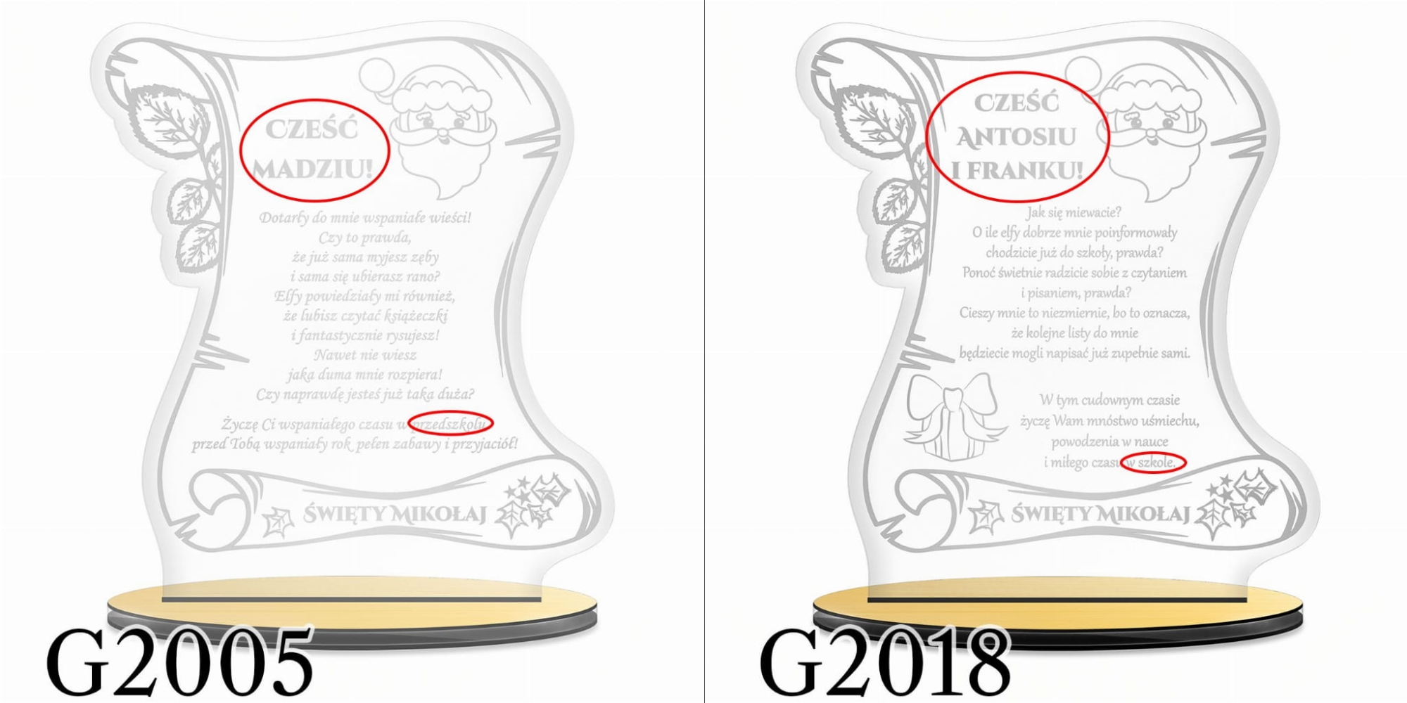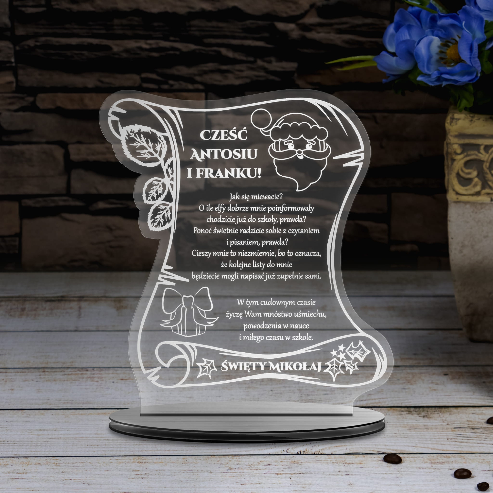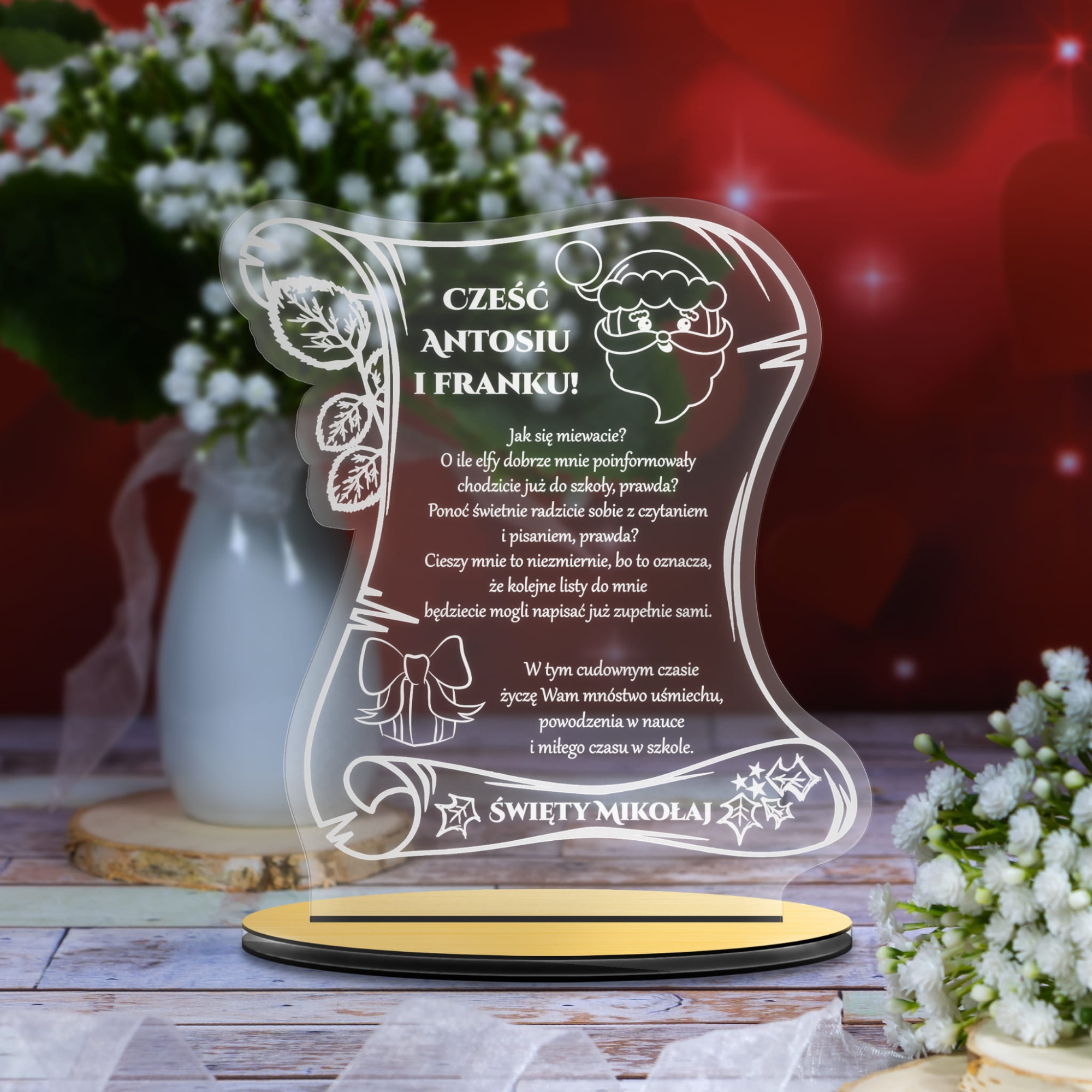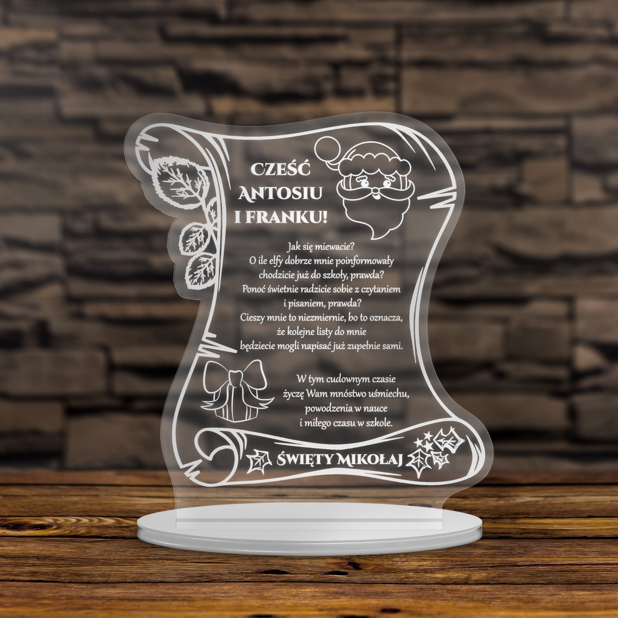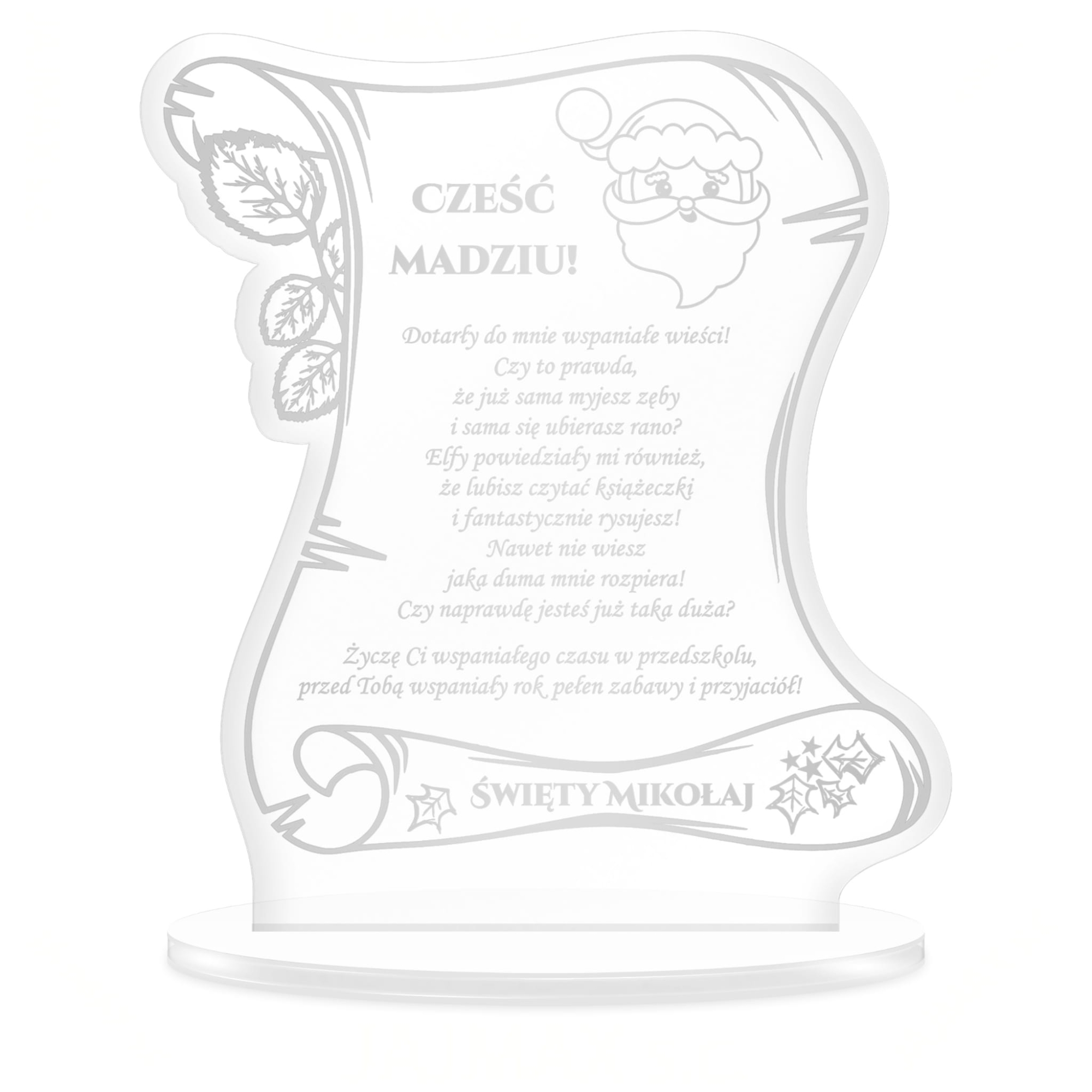 Wiara dzieci w Świętego Mikołaja to coś szczególnego, co naszym zdaniem warto pielęgnować. Większość dzieci do pewnego momentu w swoim życiu wierzy w tego Pana z workiem prezentów i saniami z reniferami. Podaruj dziecku szczególny prezent na Mikołajki czyli list od Świętego Mikołaja. Nasza akrylowa statuetka z grawerem w formie listu z dedykacją to wyjątkowy prezent na Mikołajki. Dzieci piszą listy do Mikołaja, ale wyobraźmy sobie jaka byłaby radość małego obywatela gdyby otrzymał odpowiedź. List od Świętego Mikołaja z personalizacją w postaci imienia dziecka to wyjątkowa pamiątka na wiele lat.