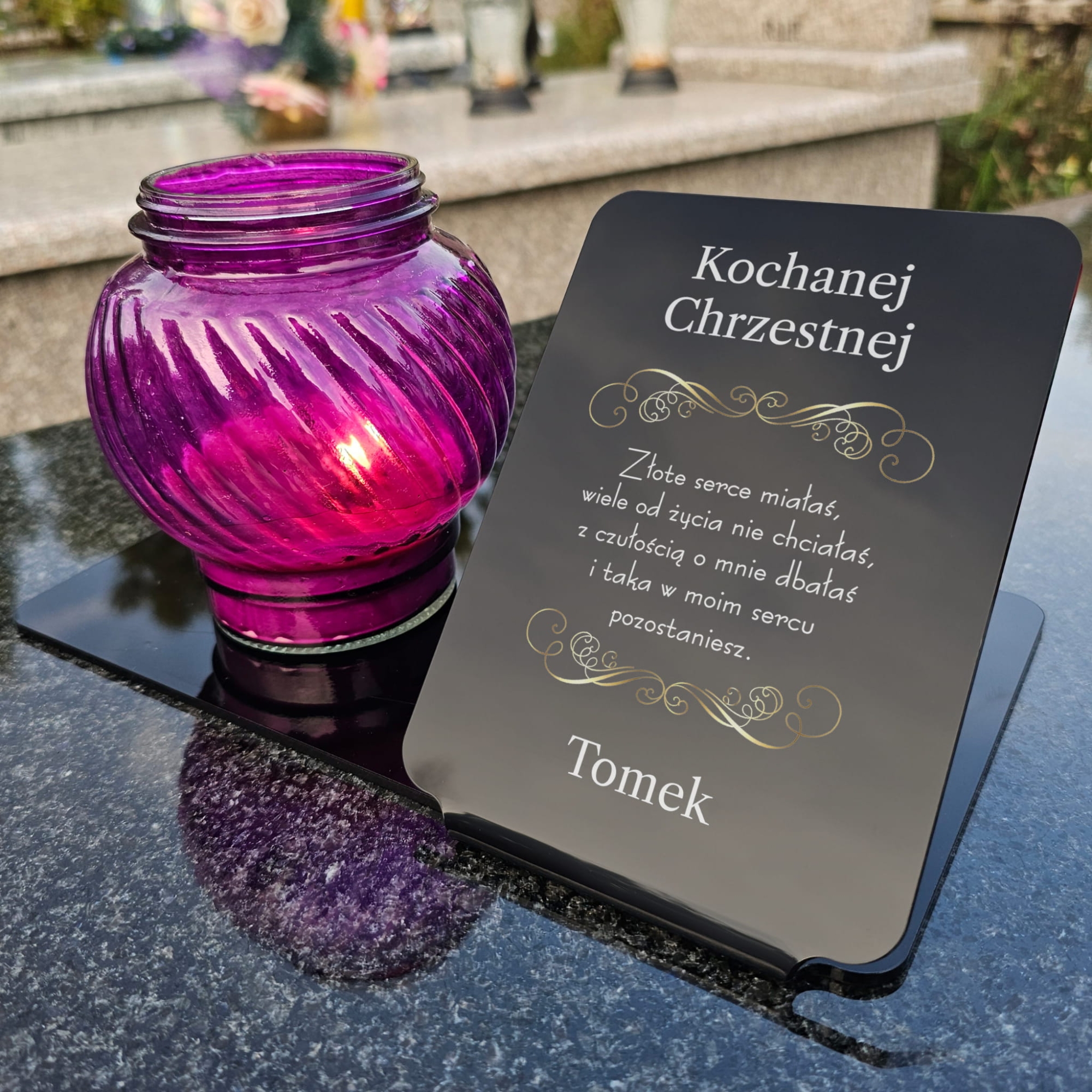 Statuetka pod znicze z nadrukiem dedykacja dla Chrzestnych i podpis