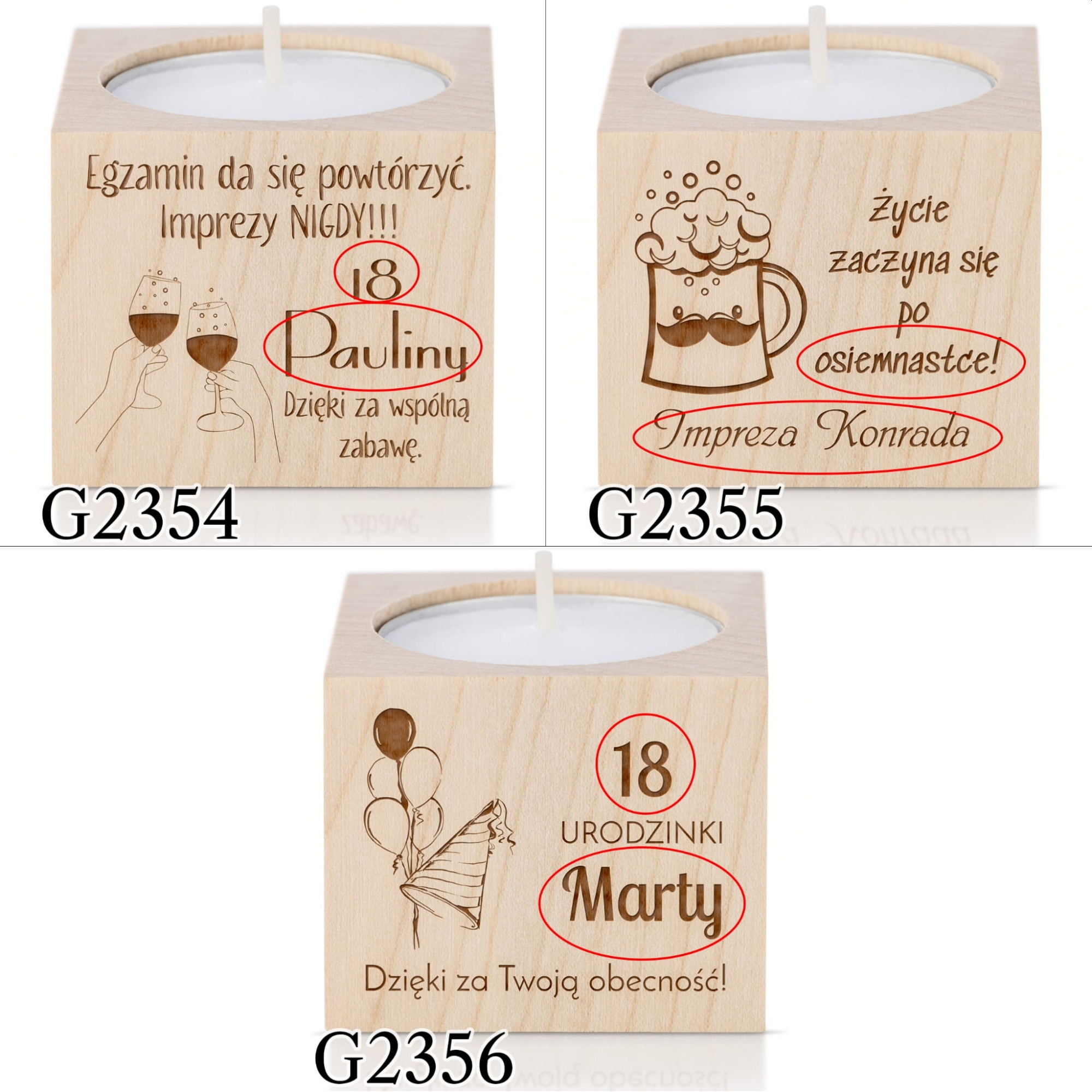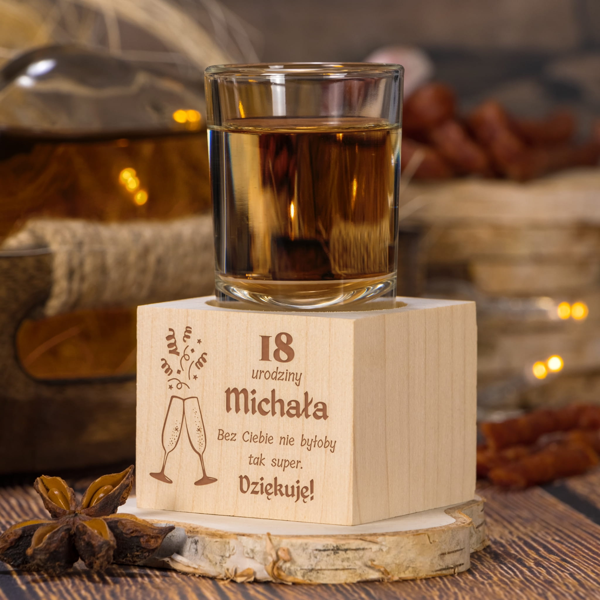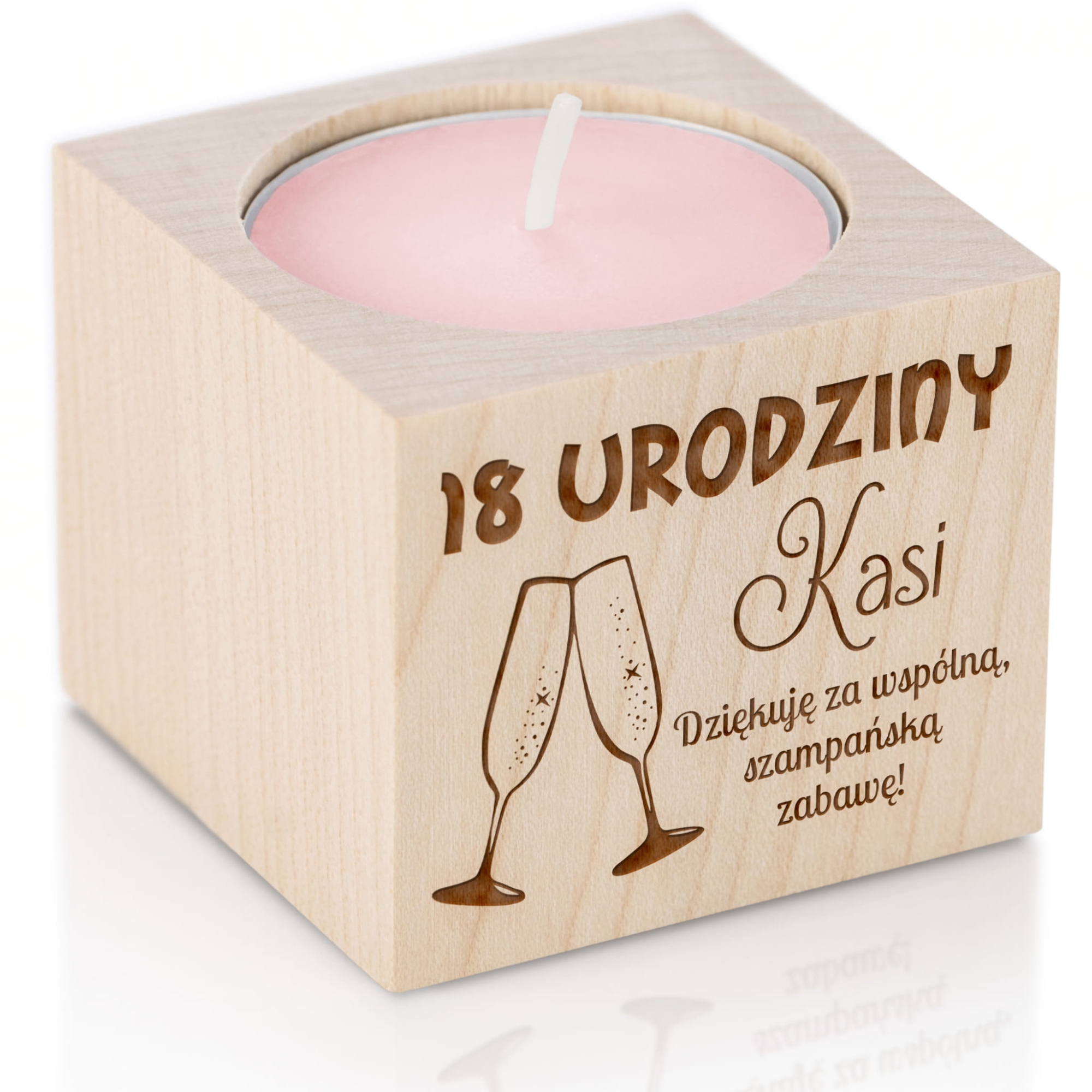 Oryginalne podziękowania dla gości za przybycie na imprezę urodzinową z okazji 18stki. Drewniany świecznik z grawerem to doskonałe upominki dla gości na 18 urodziny. Jak wiadomo każda osiemnastka to huczna impreza, dzięki upominkom goście będą ją wspominać jeszcze dłużej. Szampański nastrój przenieśliśmy na nasze wzory graficzne, które świetnie będą pasować do każdej 18stki. Świeczniki upominki dla gości doskonale sprawdzą się również jako podstawka pod kieliszek, otwór pasuje idealnie.