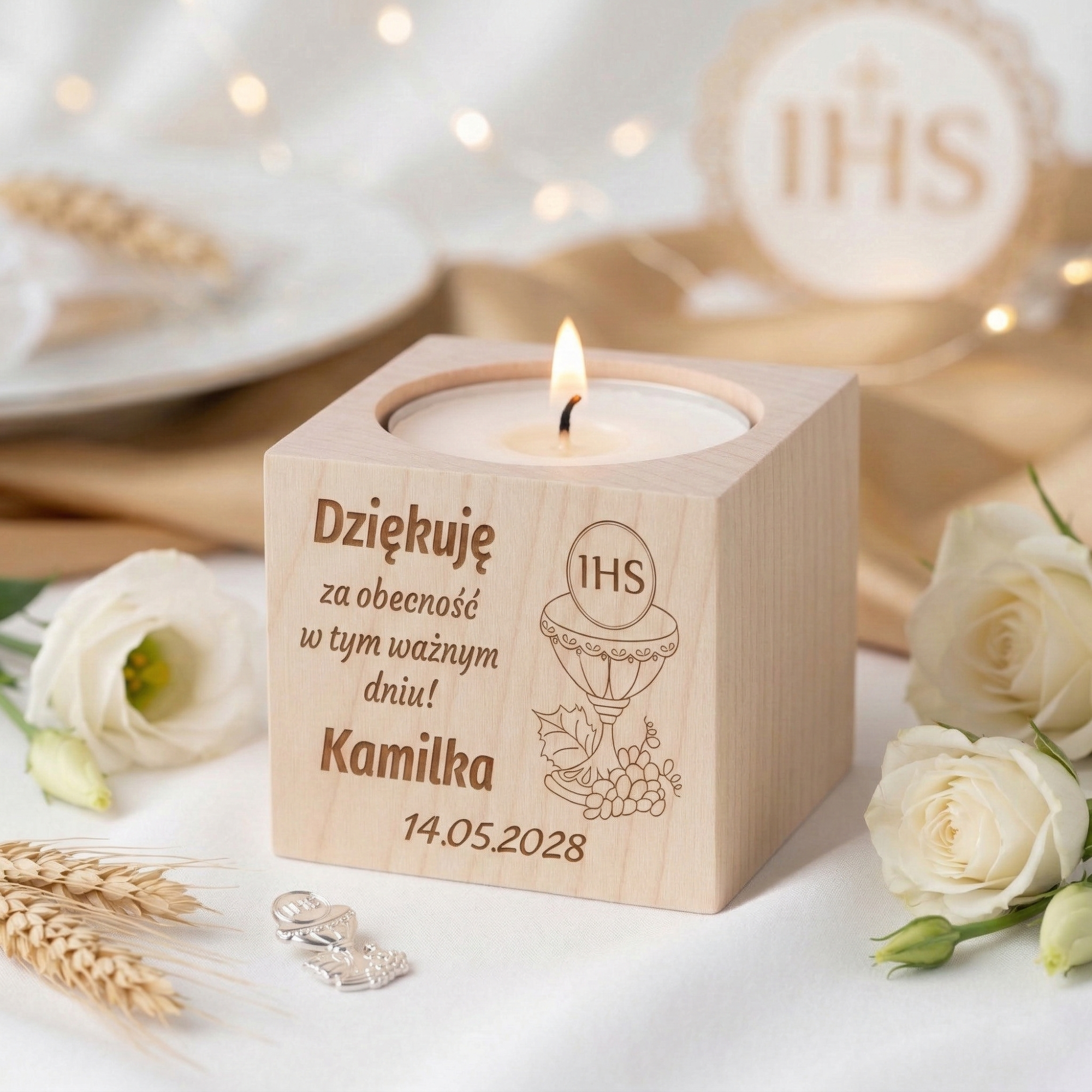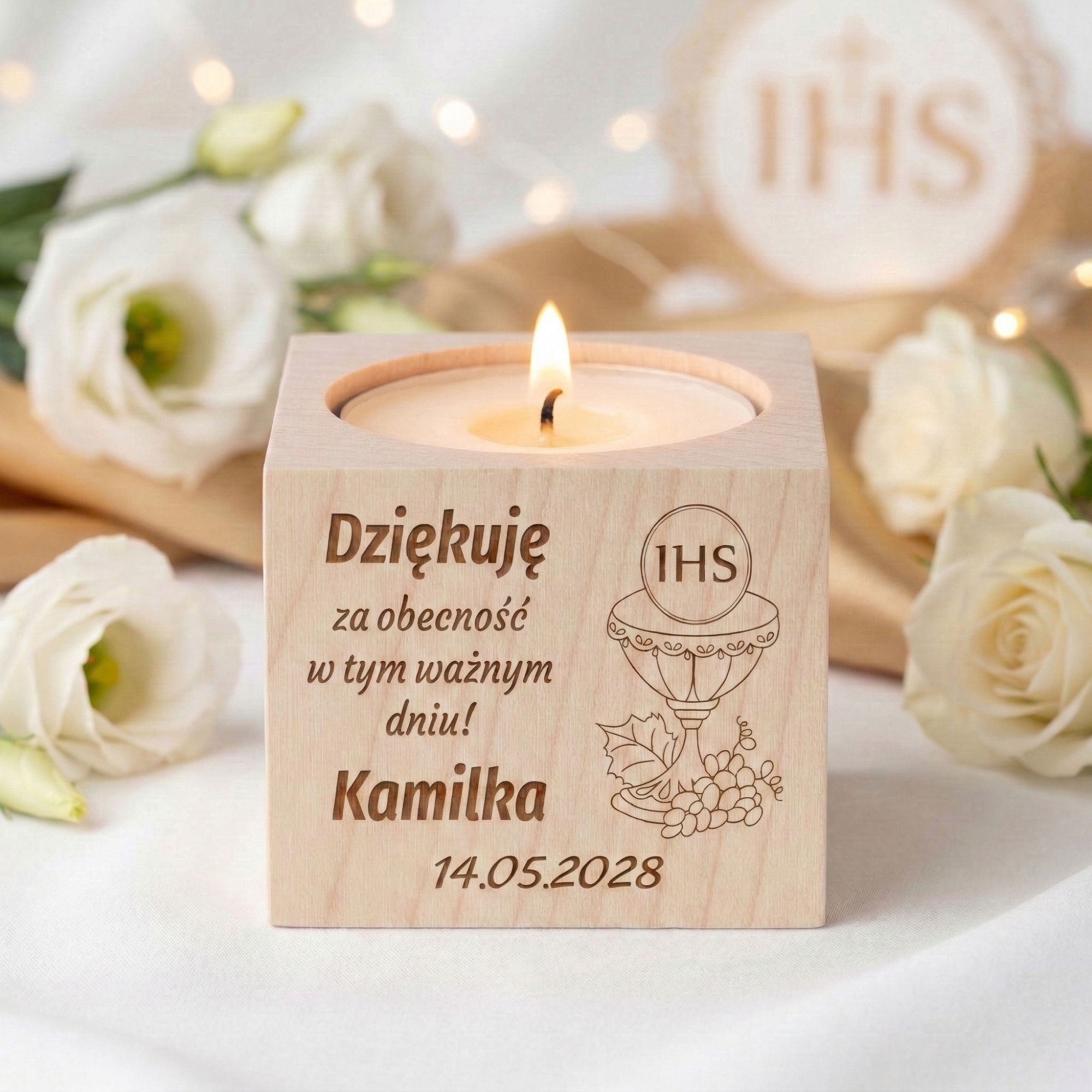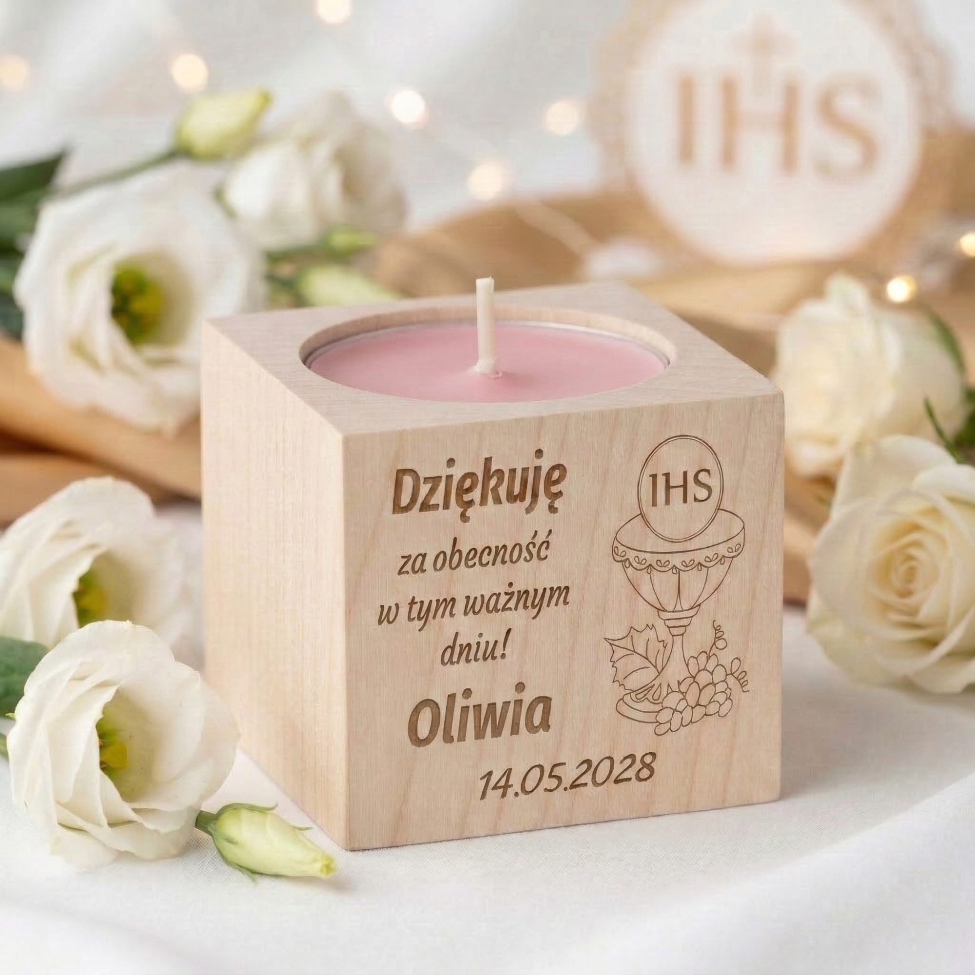 Świecznik na tealight z grawerem, podziękowanie dla gości komunijnych