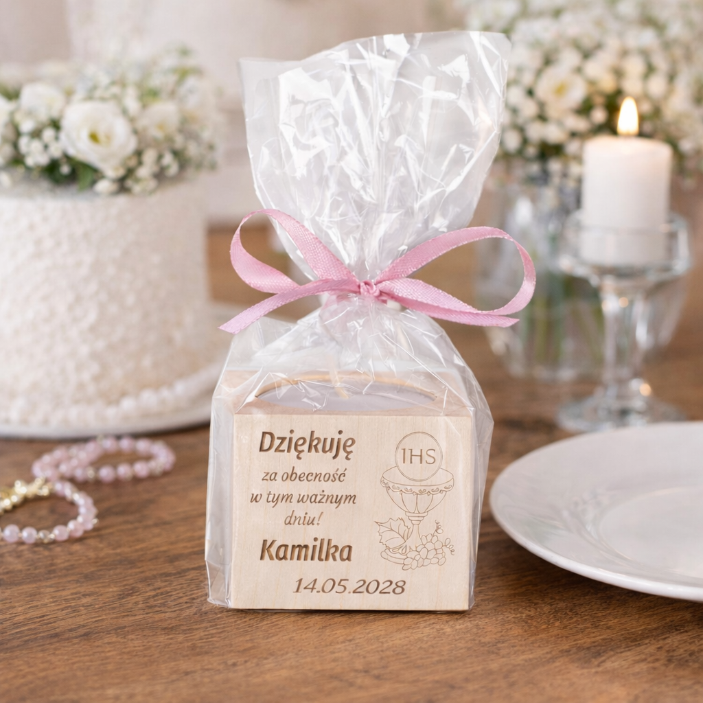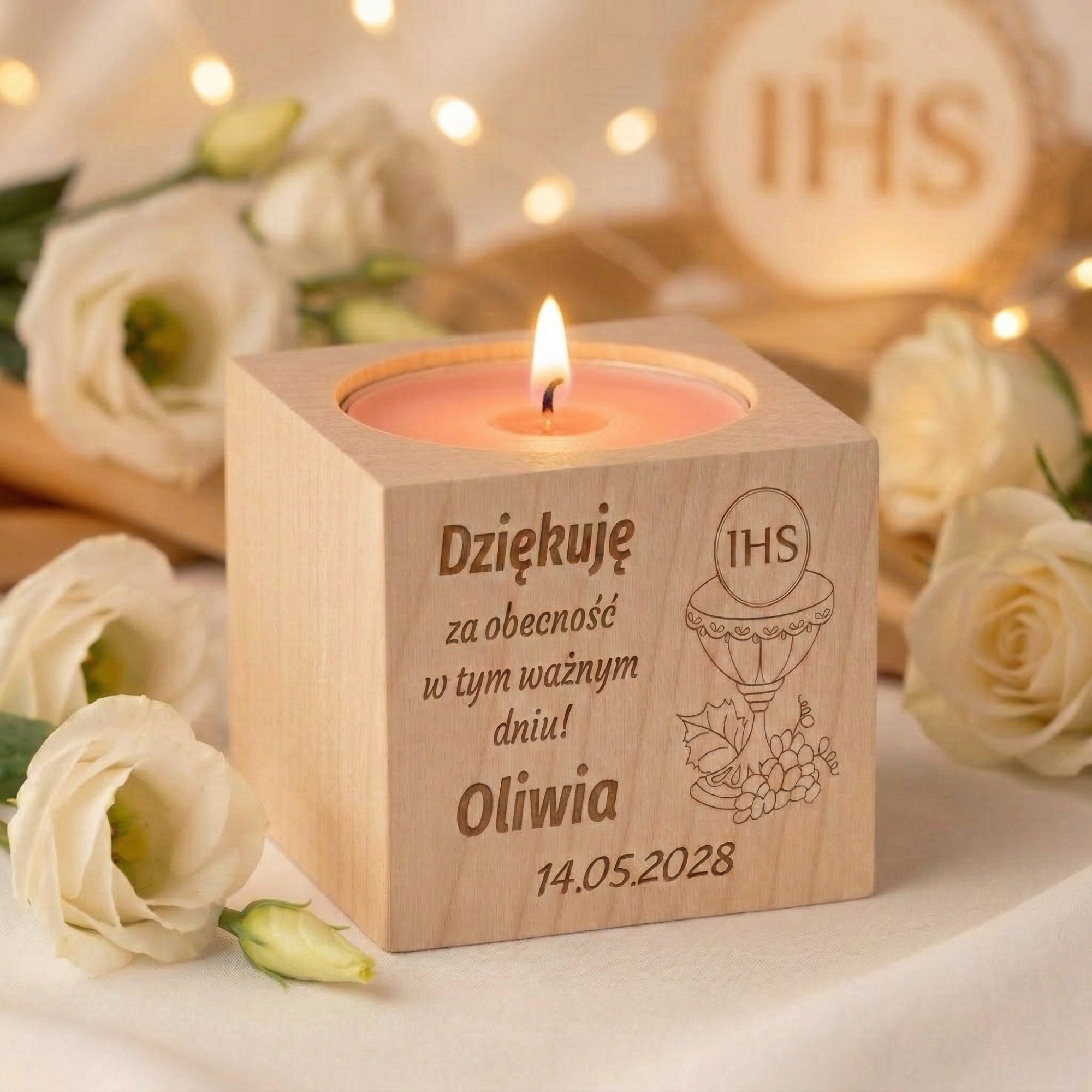 Pierwsza Komunia Święta to bardzo ważne wydarzenie w życiu dziecka jak i jego najbliższych. W ostatnich latach popularne na każdym przyjęciu stały się podziękowania dla gości komunijnych. Jeśli organizujesz przyjęcie komunijne i szukasz wyjątkowego i oryginalnego upominku dla gości nasze świeczniki sprawdzą się idealnie. Dzięki Twojej personalizacji prezenty dla gości będą jedyne w swoim rodzaju.
