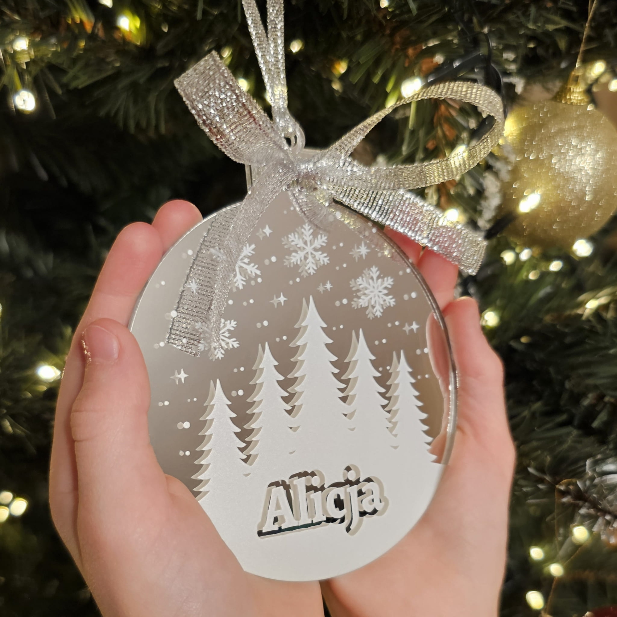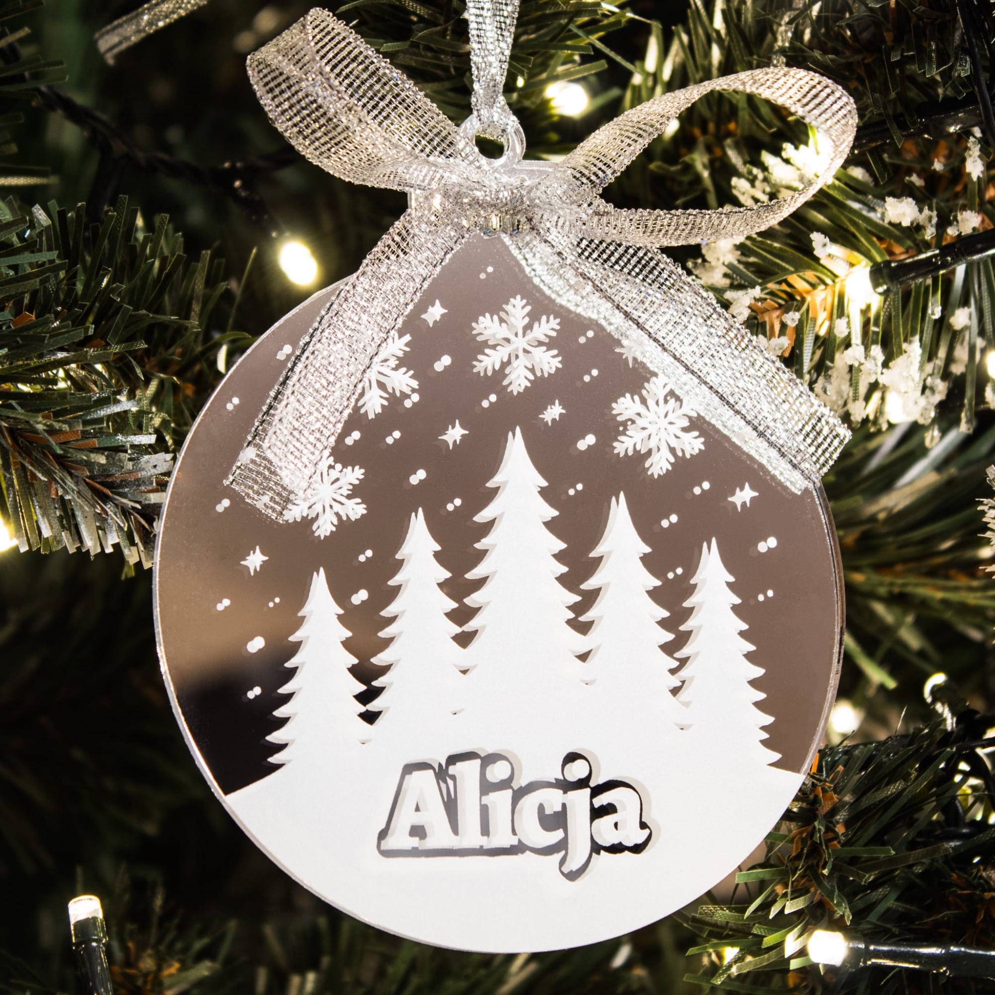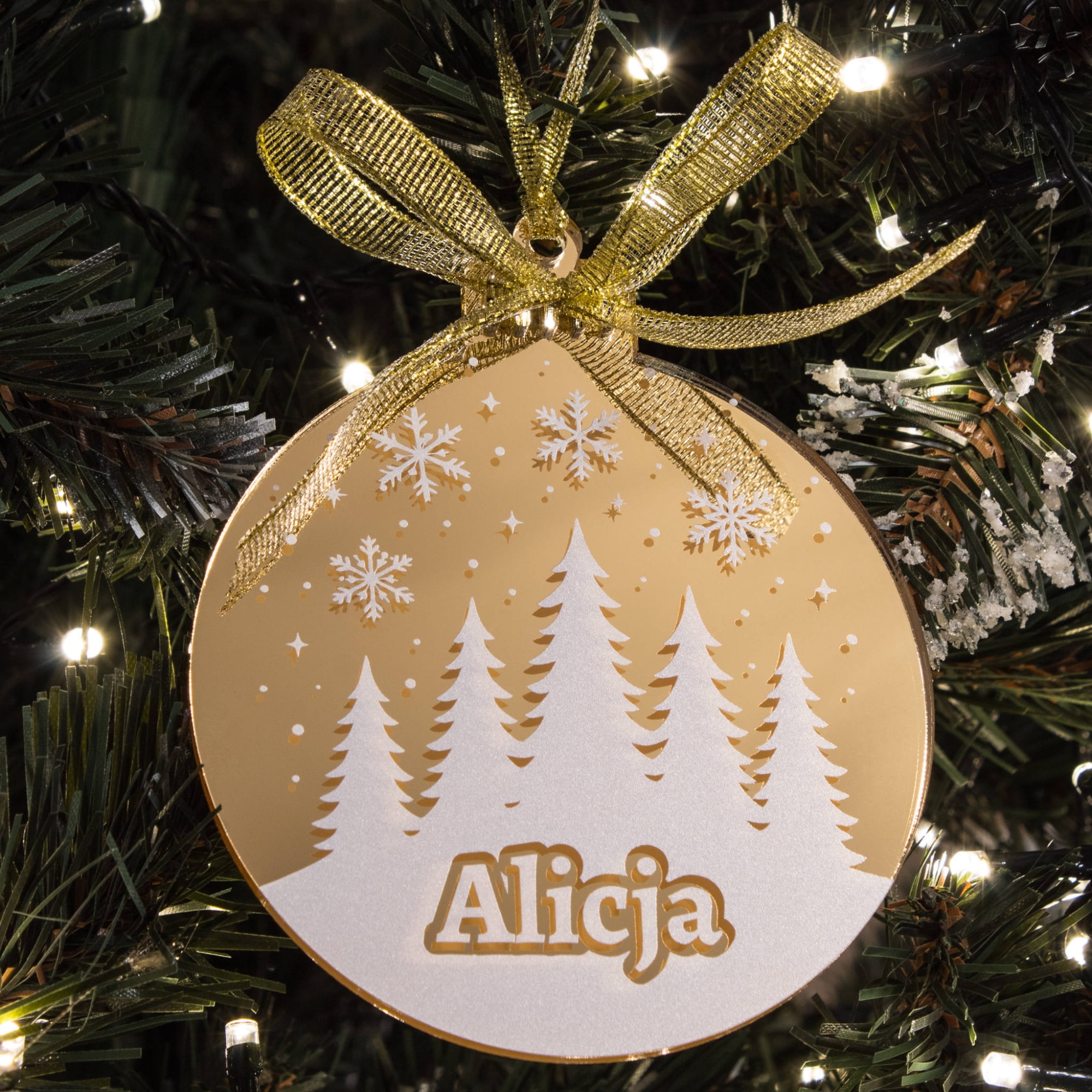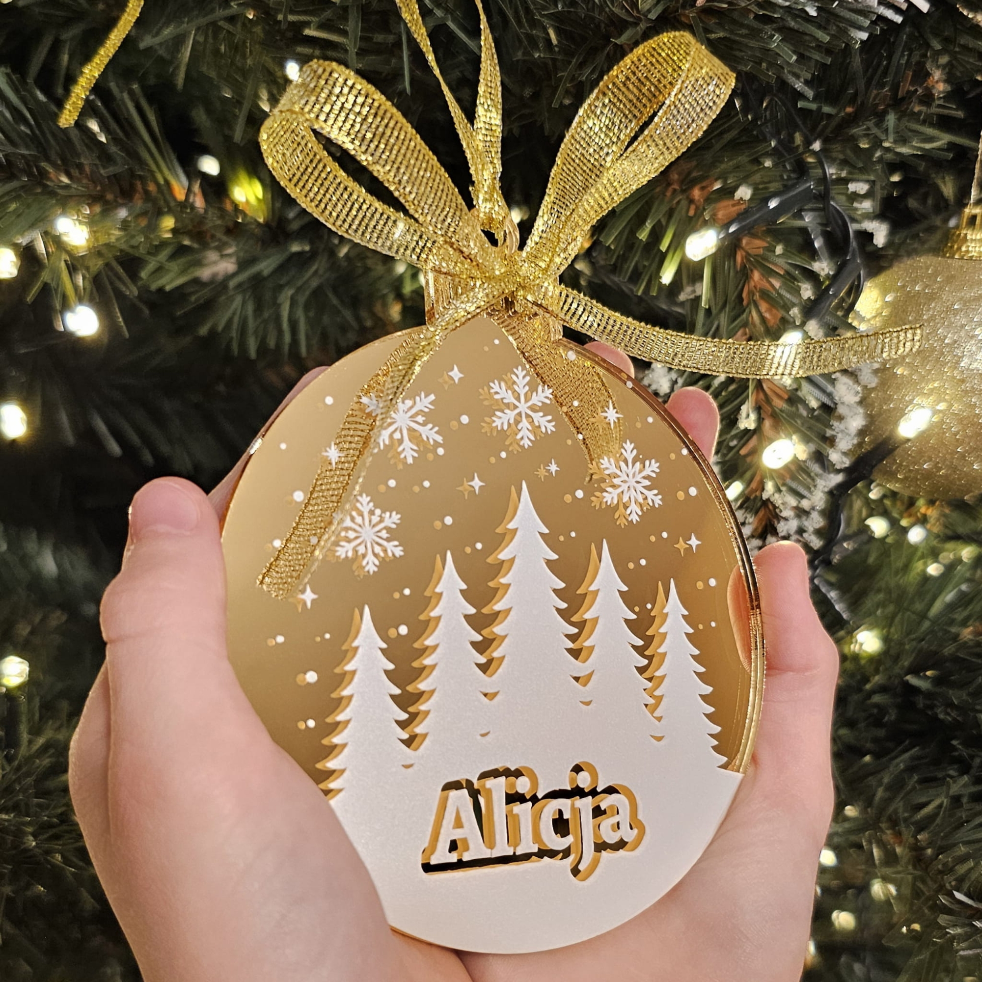 Imię umieszczone jest w dolnej części bombki i tworzy delikatny efekt 3D – wygląda, jakby było wycięte ze śniegu. Dzięki temu napis nie ginie wśród światełek, ale staje się centralnym punktem całej ozdoby. To idealny wybór, jeśli szukasz personalizowanej bombki na choinkę, która będzie się wyróżniać, a jednocześnie pozostanie elegancka i ponadczasowa.