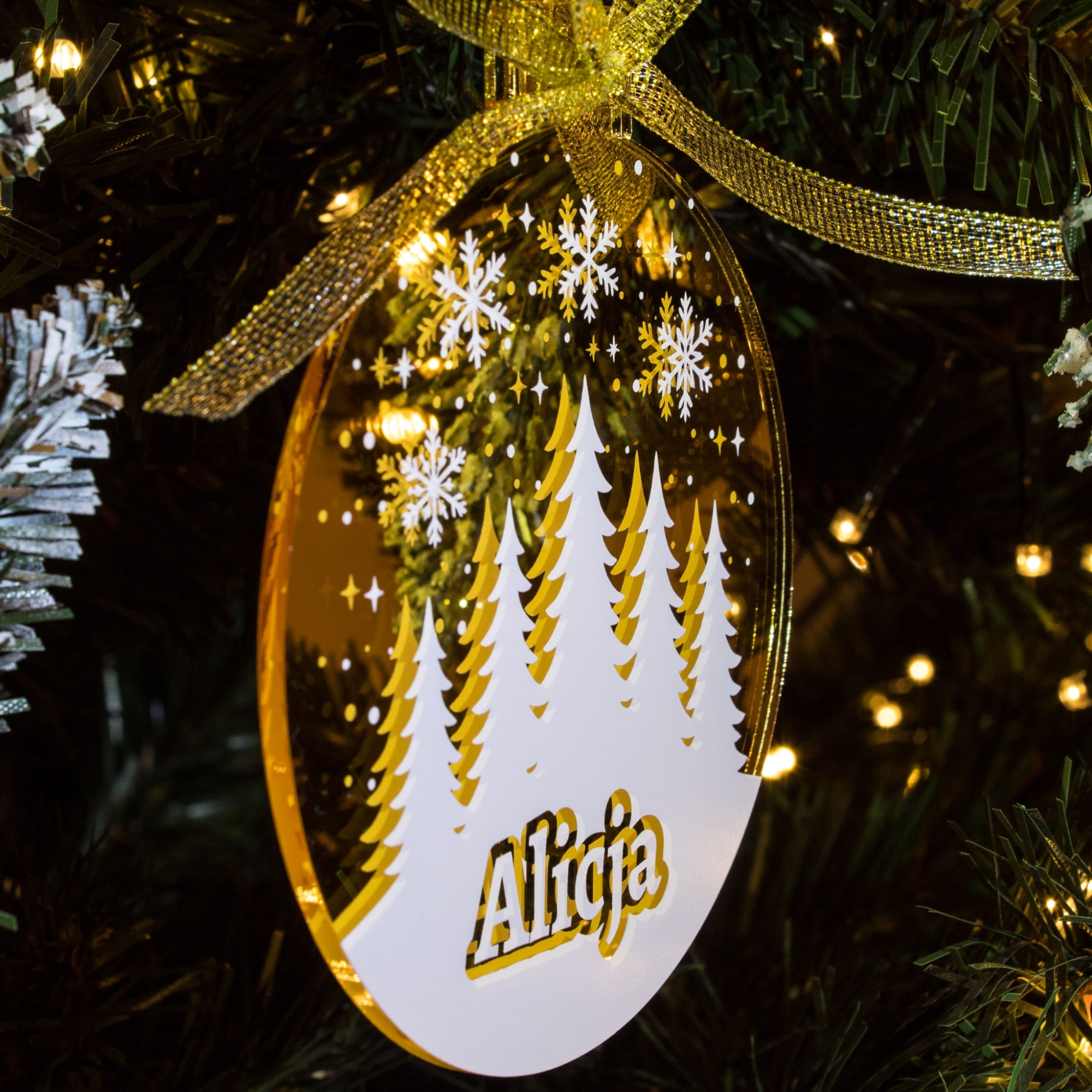 Wyobraź sobie świąteczny wieczór, migoczące lampki i choinkę, na której wśród zwykłych ozdób pojawia się jedna wyjątkowa – szklana bombka choinkowa z imieniem. Złote lub srebrne tło odbija światło jak lustro, nad białym, zimowym lasem wirują śnieżynki, a na pierwszym planie widać imię Twojego dziecka, wnuczki, partnera lub całej rodziny. To ozdoba, która od razu przyciąga wzrok i sprawia, że choinka staje się naprawdę Wasza.