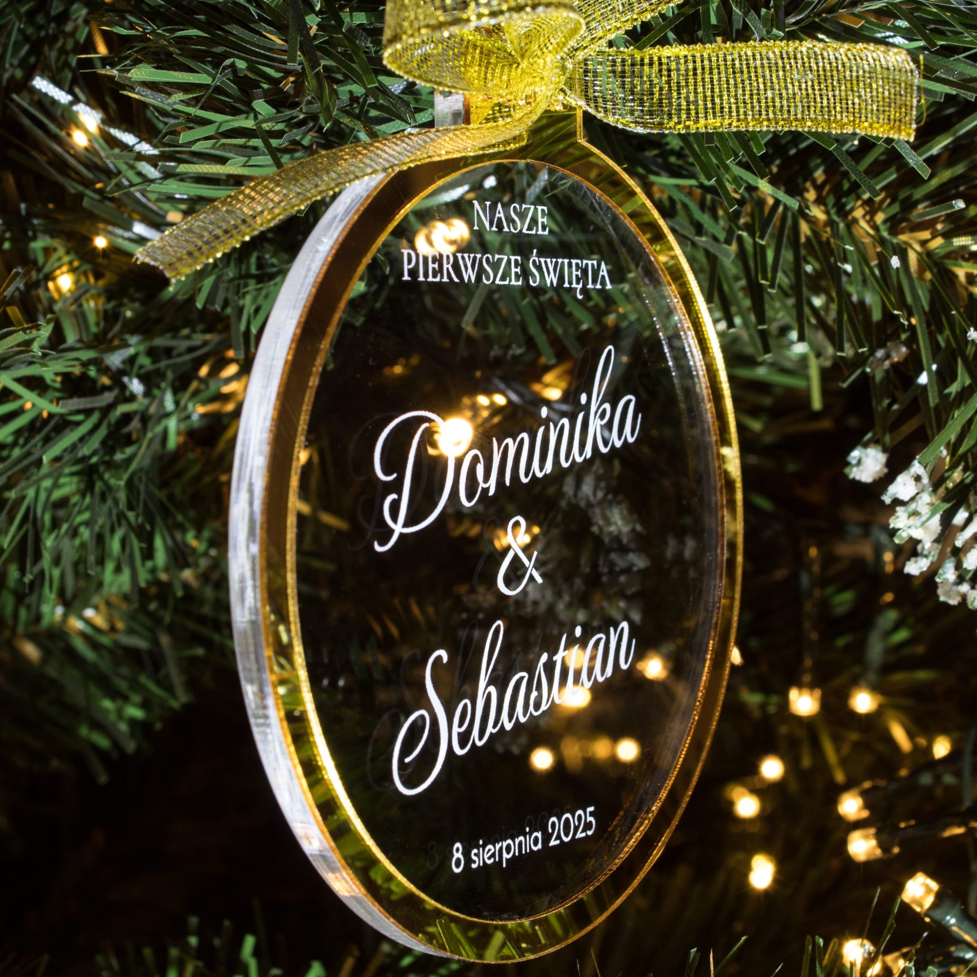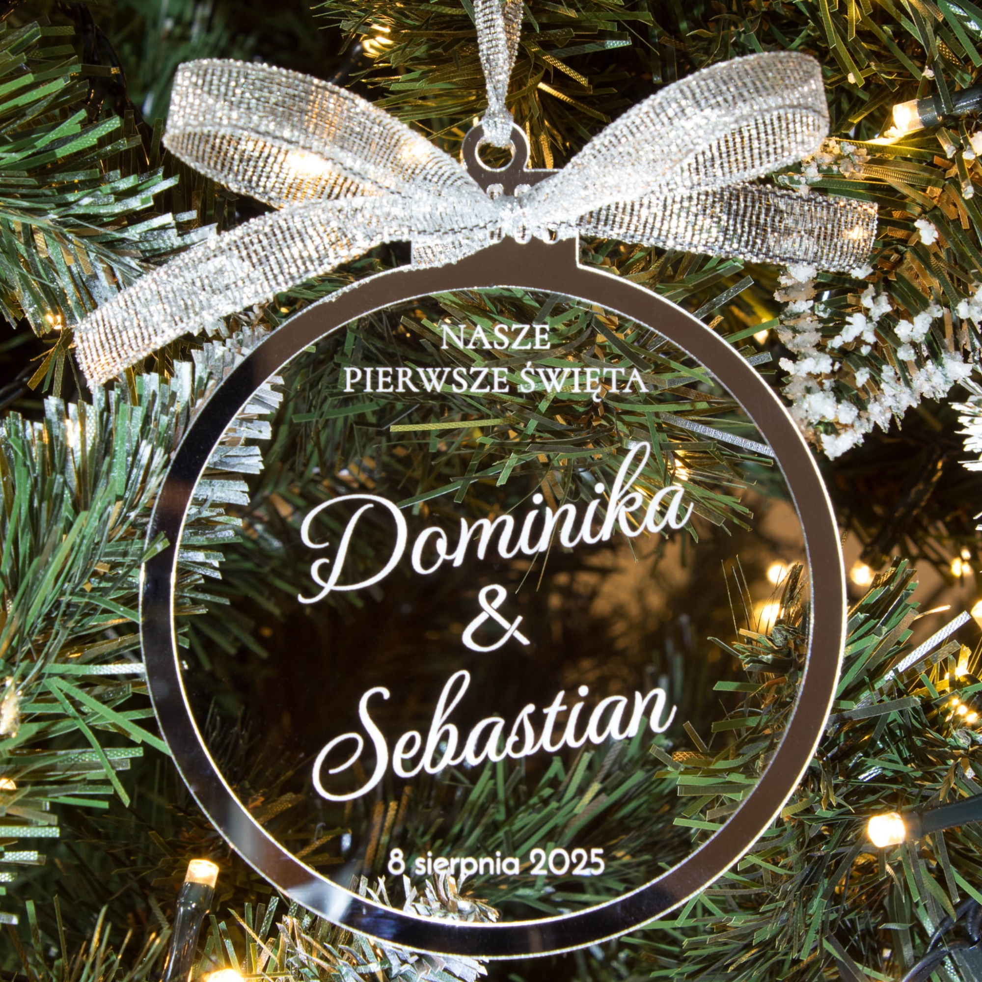 To Ty decydujesz, co dokładnie pojawi się na bombce. W górnej części możesz umieścić nagłówek, np. „Nasze pierwsze święta”, „Pierwsza Wigilia jako małżeństwo” czy „Święta w nowym domu”. W centralnym miejscu wpisujemy Wasze imiona, a na dole ważną datę – dzień ślubu, zaręczyn, przeprowadzki albo po prostu rok, który chcecie zapamiętać na zawsze. Dzięki temu powstaje osobista pamiątka dla pary, która będzie do Was wracać co roku, gdy sięgniecie po ozdoby świąteczne.
