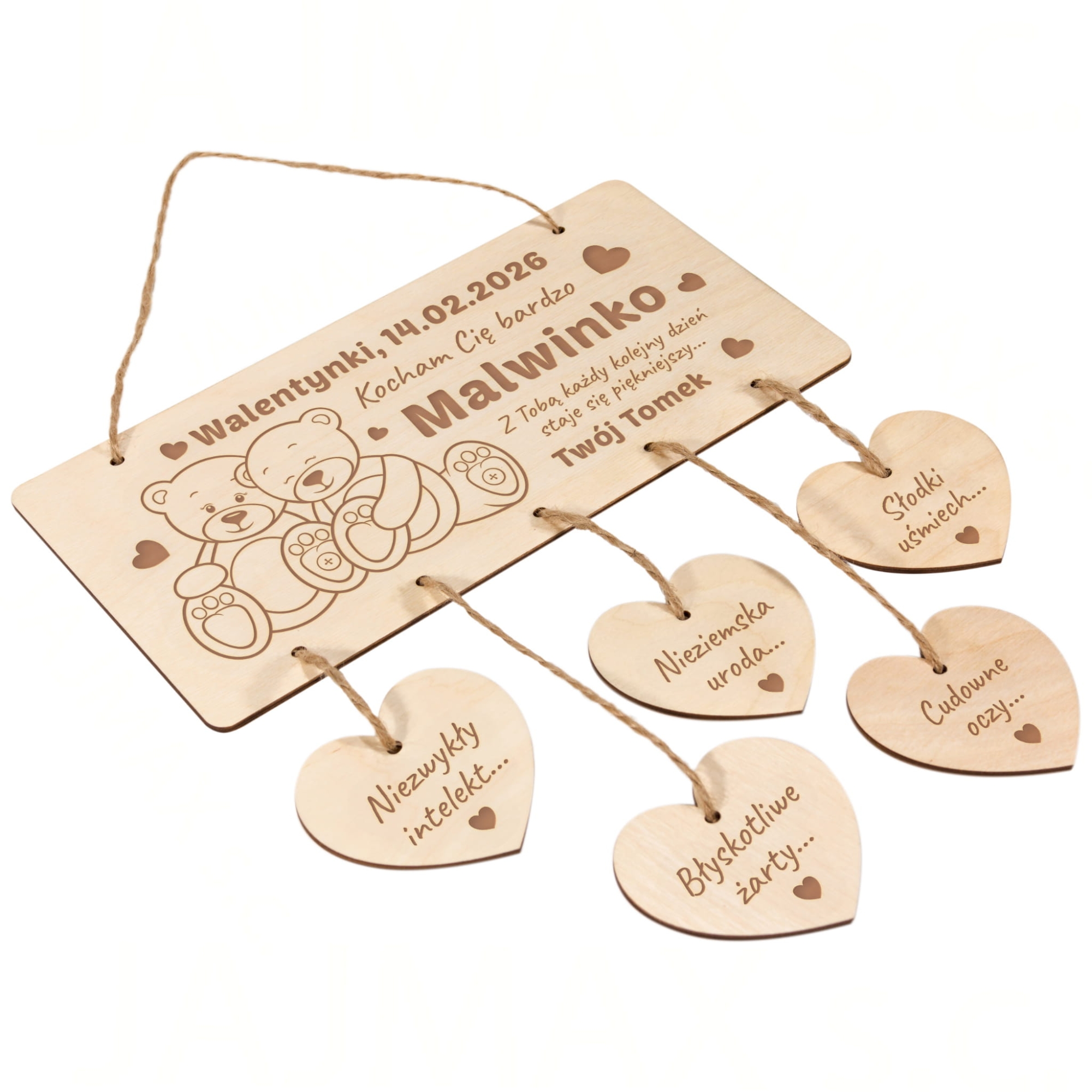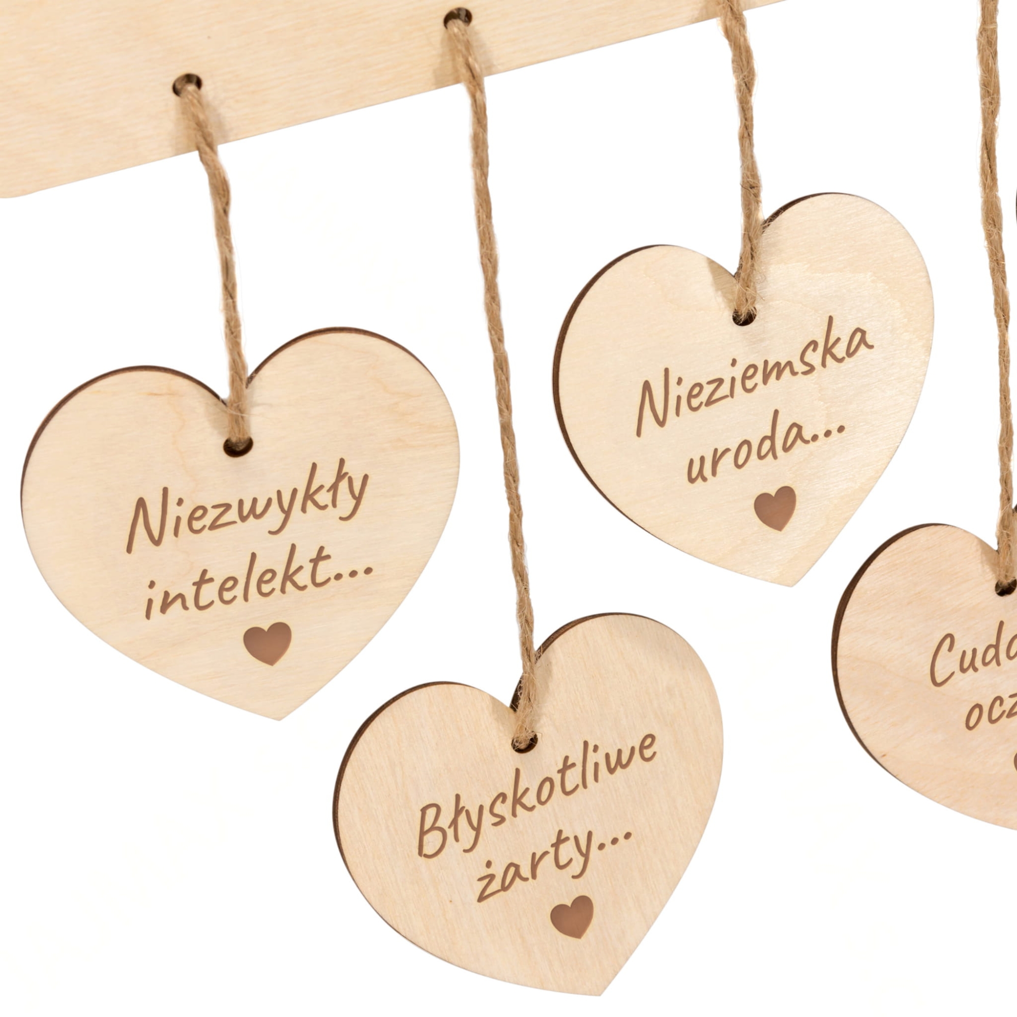 - W zestawie: tabliczka z indywidualnym grawerem, 5 drewnianych serc z grawerem, sznurek jutowy do zawieszenia