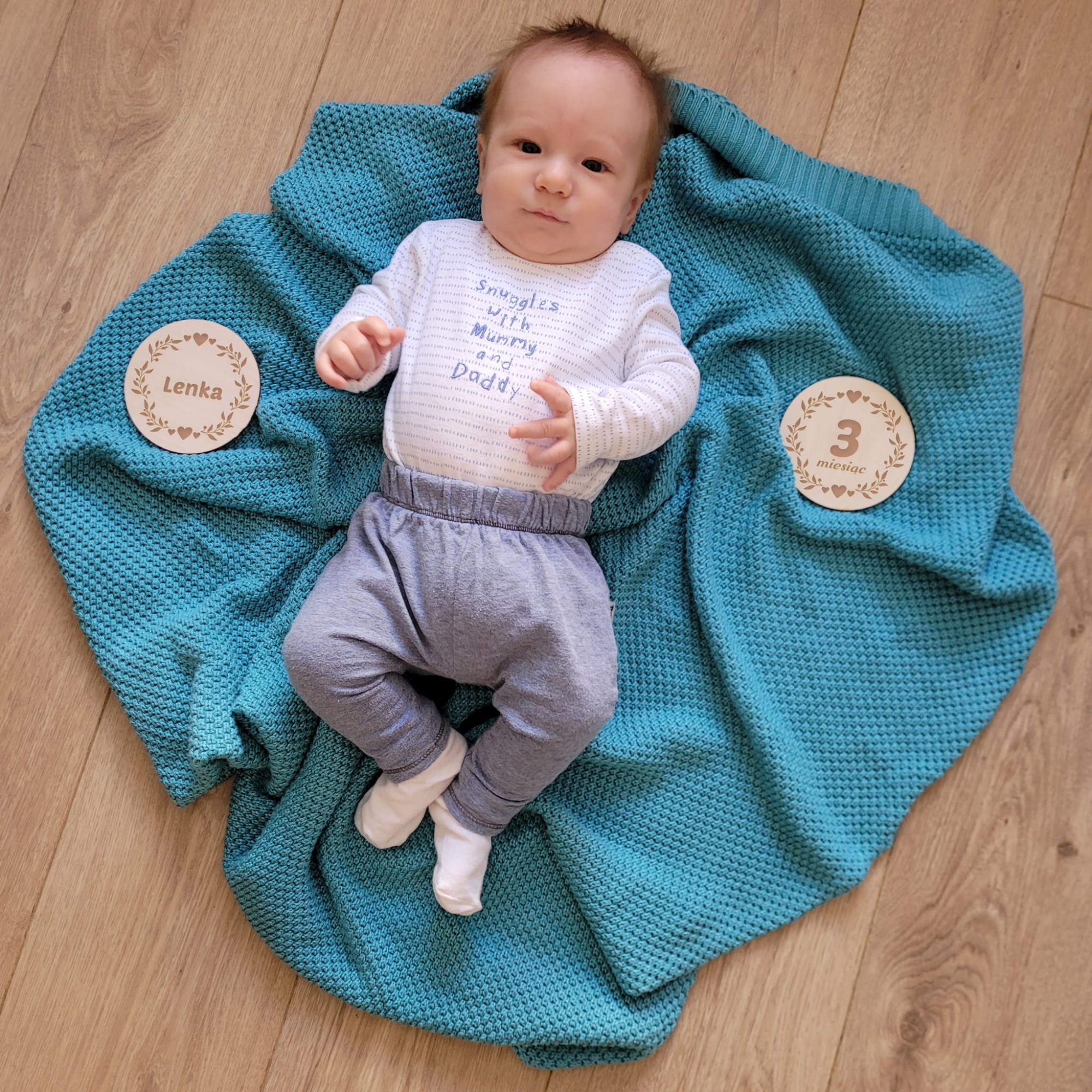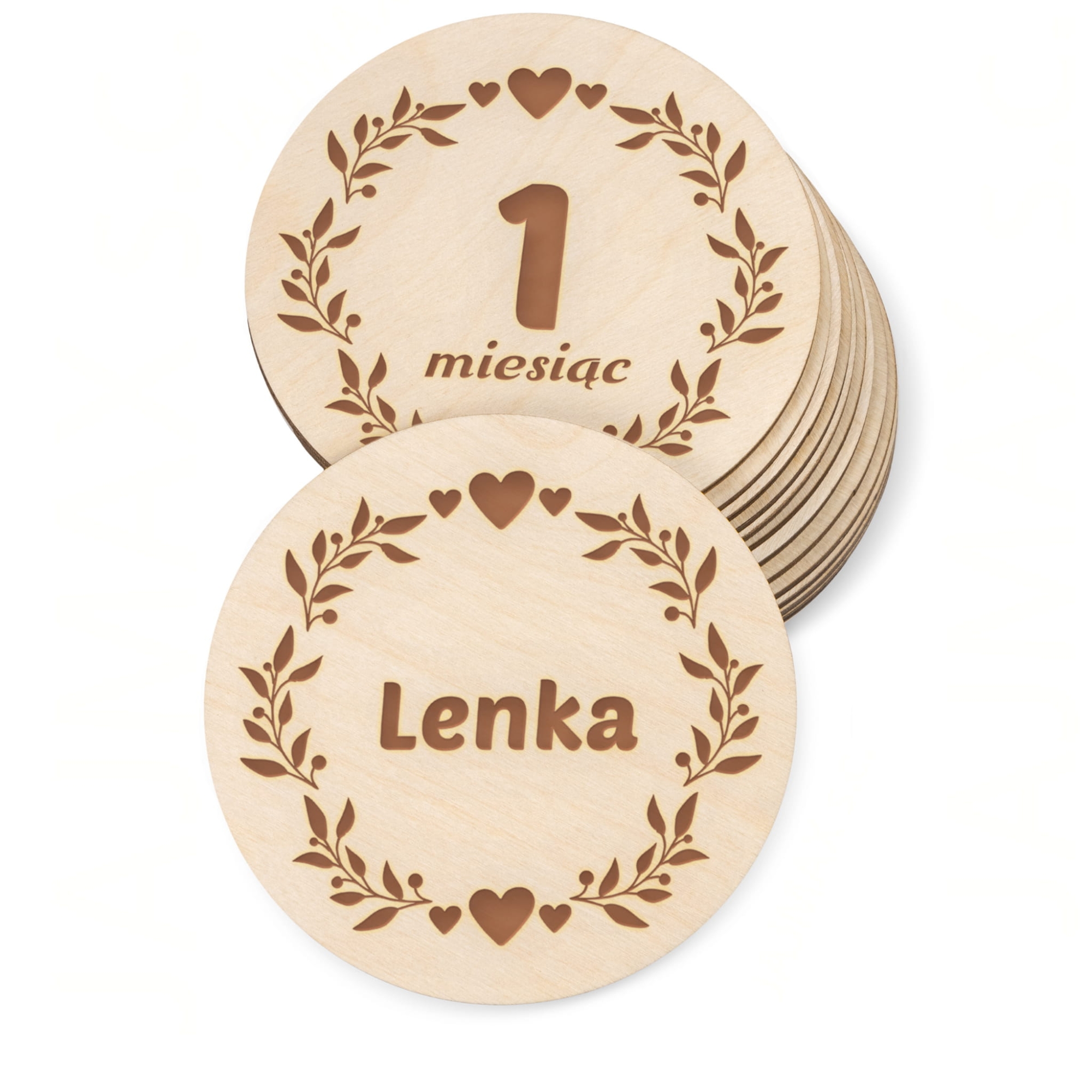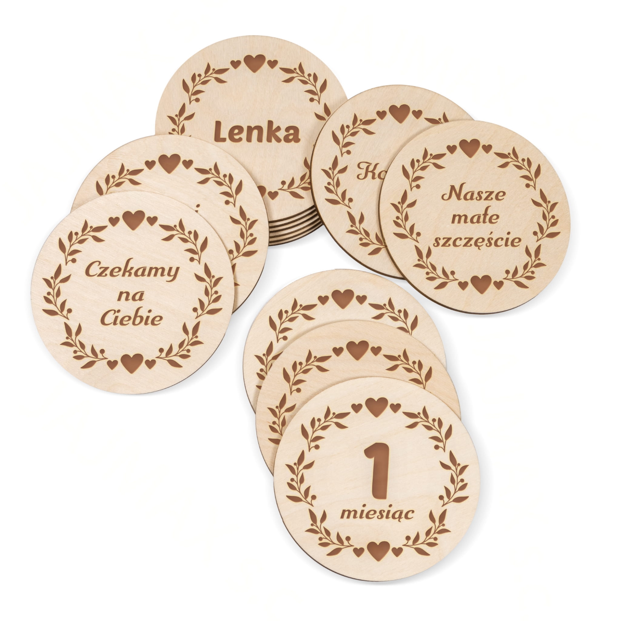 Drewniane tabliczki do zdjęć z miesiącami dla dziecka to sposób na uwiecznienie na fotografiach poszczególnych miesięcy życia dziecka. Tabliczki do zdjęć dla dziecka z grawerem pozwolą wykonać piękne, pamiątkowe zdjęcia z okresu 12 miesięcy pociechy. W zestawie aż 18 tabliczek, oprócz tabliczek do zdjęć z miesiącami w komplecie także tabliczki z krótkimi tekstami i jedna tabliczka spersonalizowana z imieniem dziecka. Wykonaj wyjątkowe zdjęcia w zaciszu swojego domu lub na profesjonalnej sesji zdjęciowej, takie tabliczki do zdjęć to hit ostatnich lat. Nasze tabliczki wykonaliśmy w formie kół o średnicy 10 cm, dzięki temu litery są duże i będą doskonale widoczne na zdjęciach. Tabliczki do zdjęć doskonale sprawdzą się jako prezent na babyshower lub prezent z okazji narodzin dziecka od bliskich.