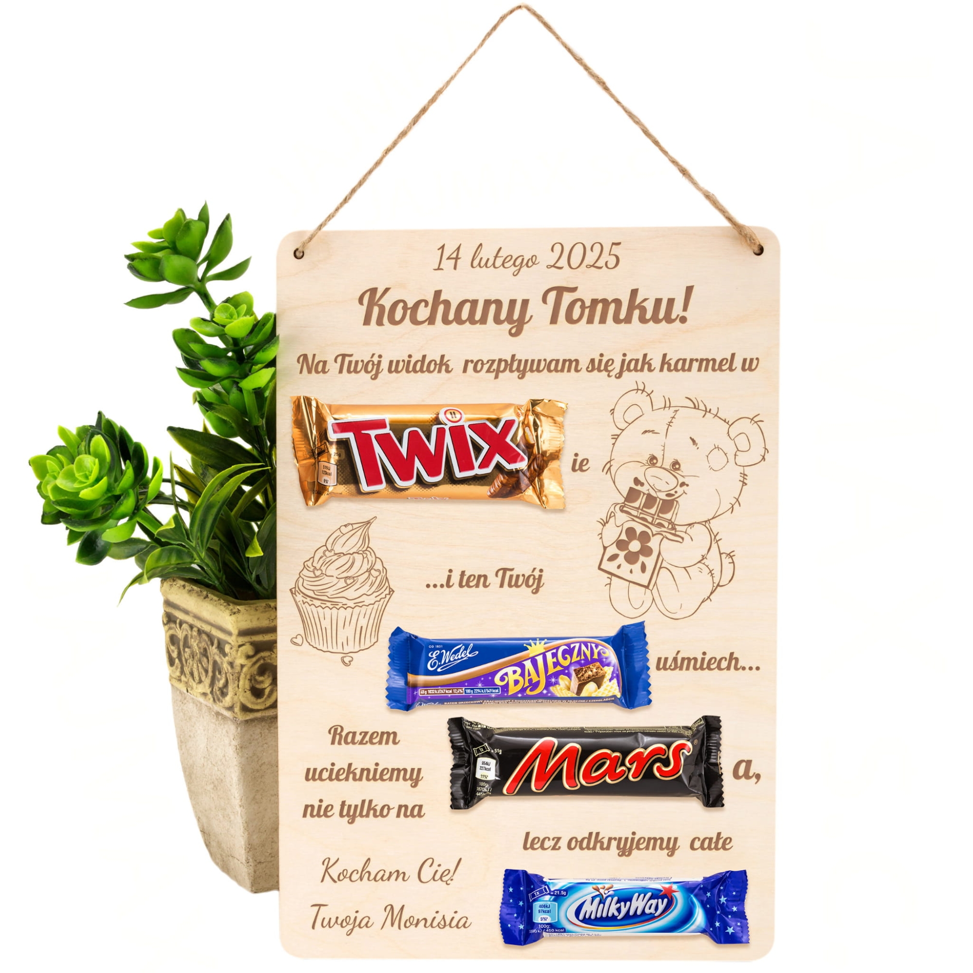 Drewniana tabliczka na słodycze i życzenia to nasz topowy pomysł na oryginalny prezent na Walentynki dla dziewczyny lub chłopaka. Istnieje wiele sposobów na wyrażanie uczuć bliskiej osobie. Jednak nie ma wątpliwości, że to właśnie słodkości i życzenia płynące z głębi serca są najbardziej rozczulające i wartościowe. Pomysłowo wykonana tabliczka na słodycze i życzenia to oryginalny prezent na Walentynki, który zaskoczy każdego. Powiedz ,,kocham Cię’’ w szczególny i błyskotliwy sposób. Gwarantujemy, że słodkie wyznanie miłości będzie zapamiętane na długie lata!