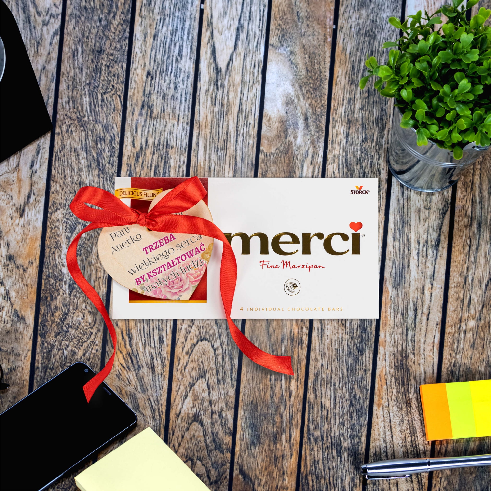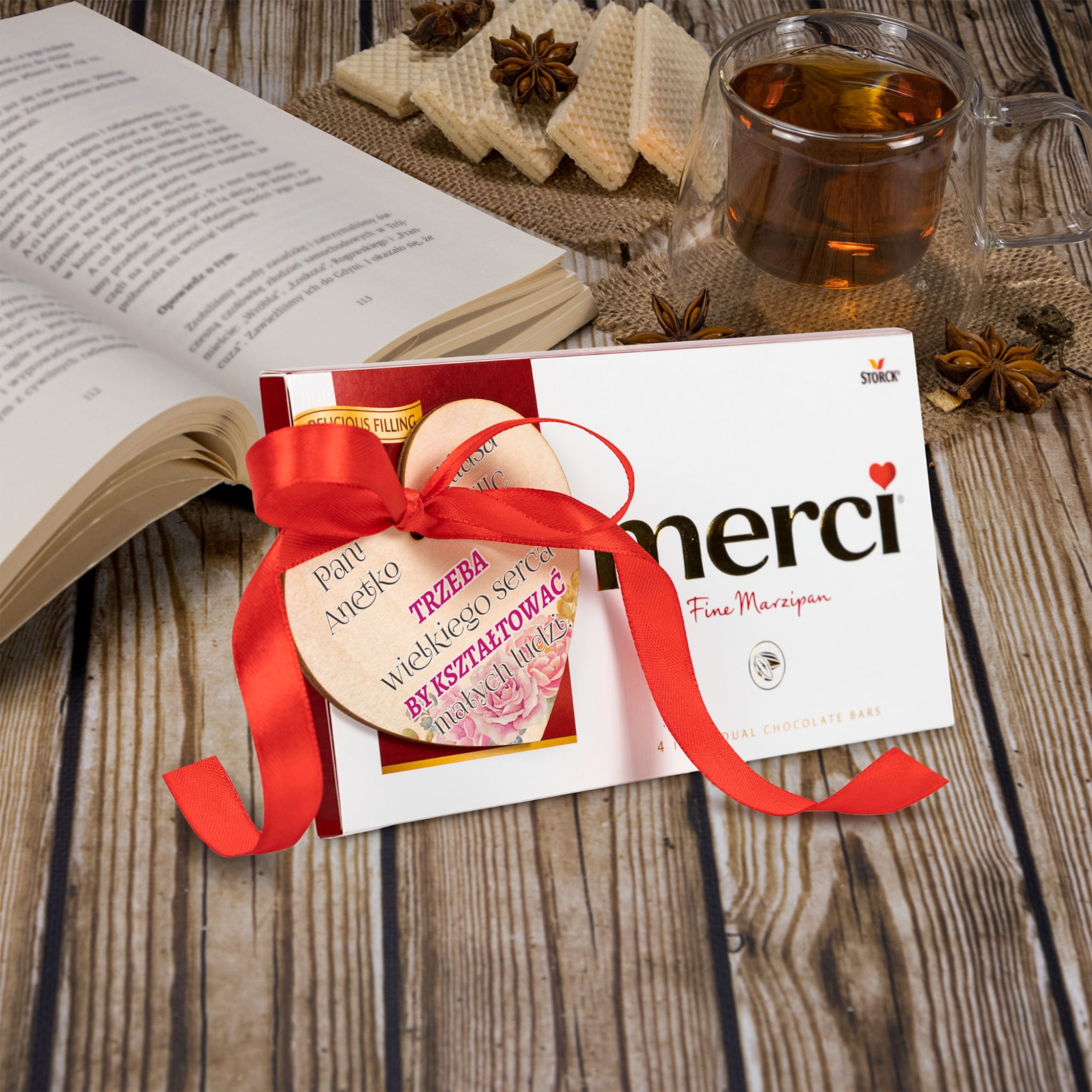 | Zawartość zestawu: | czekolada Merci 100 g, drewniane serce z taśmą dwustronną i wstążką |