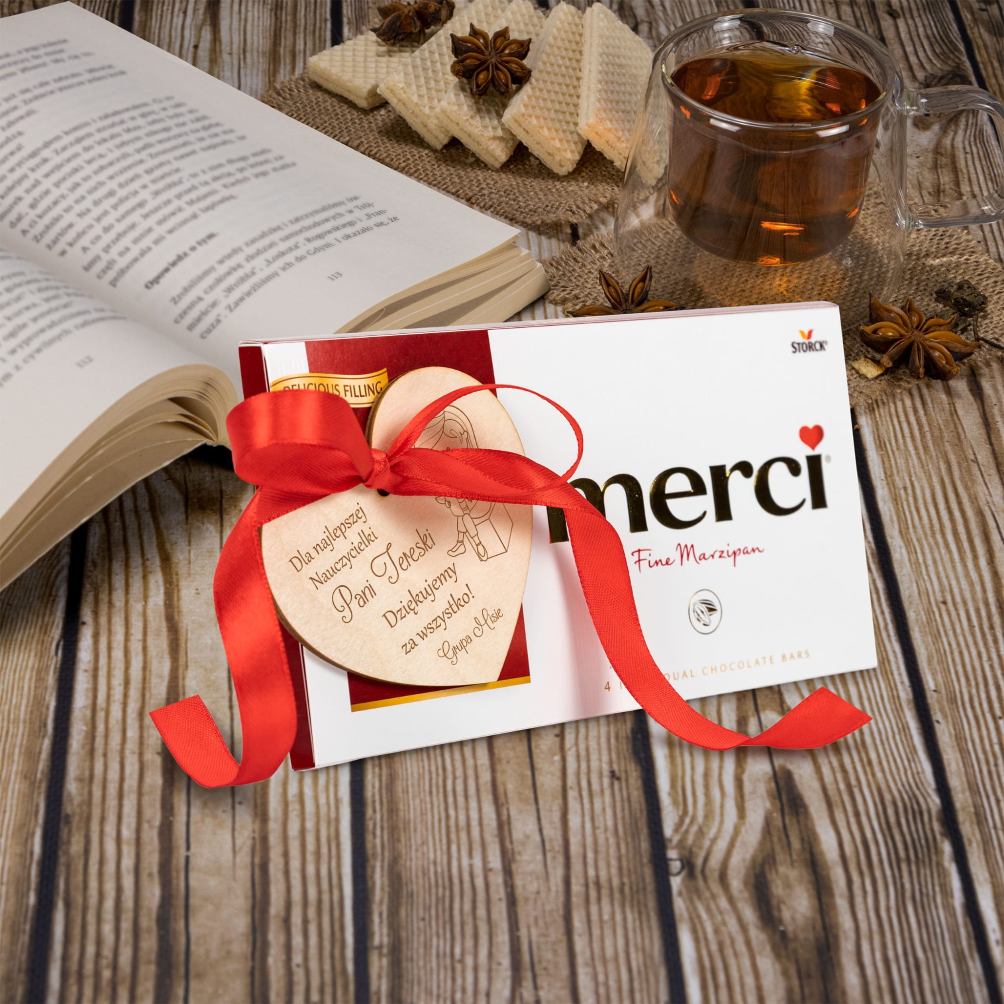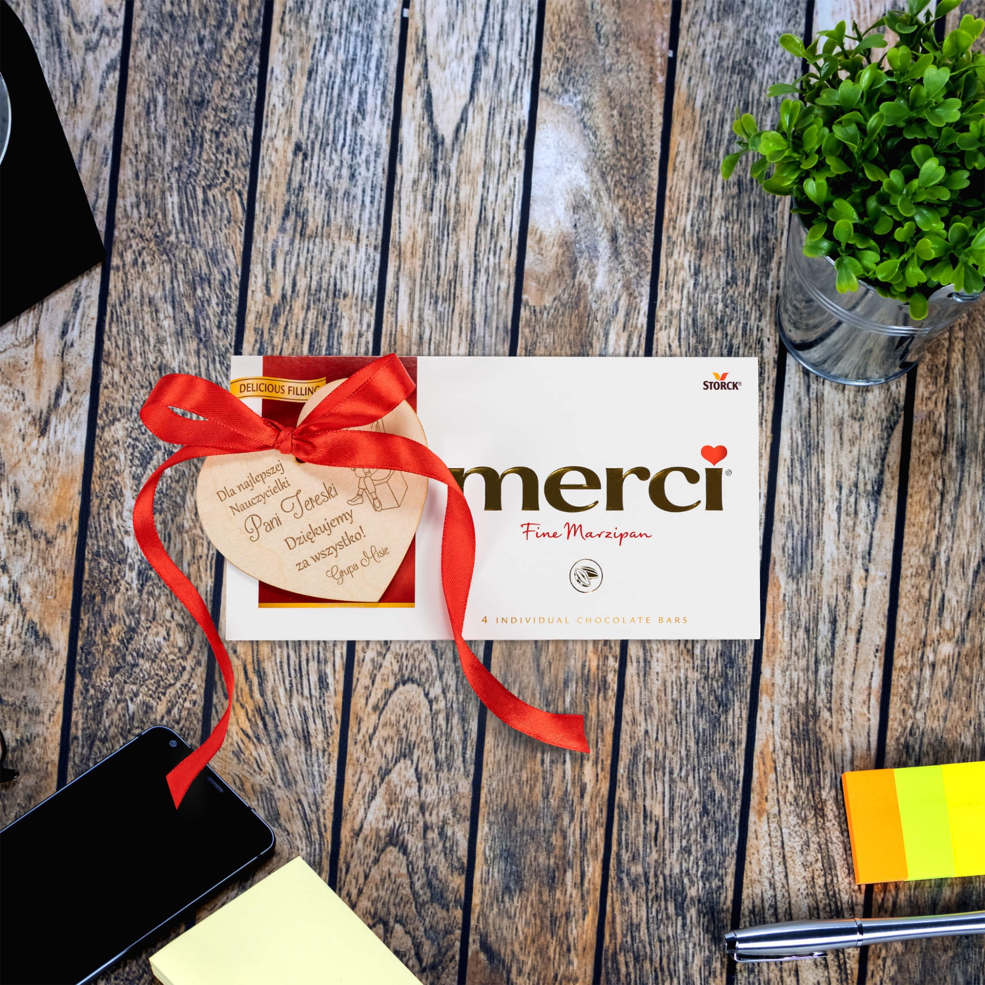 Słodki upominek zestaw czekolada Merci serduszko i wstążka na Dzień Nauczyciela