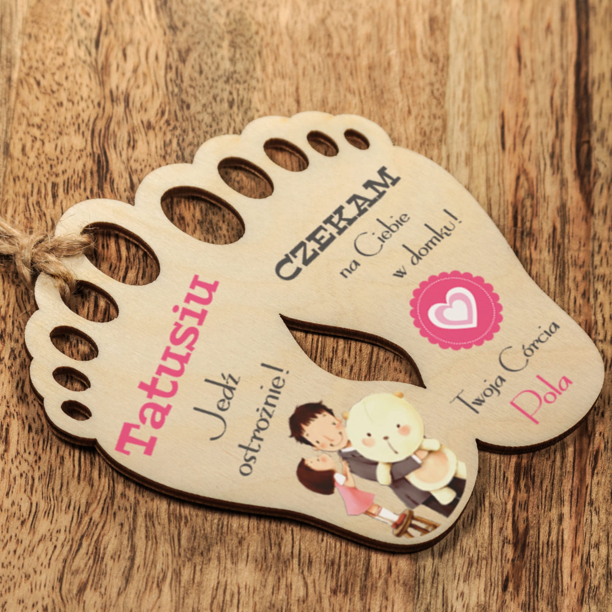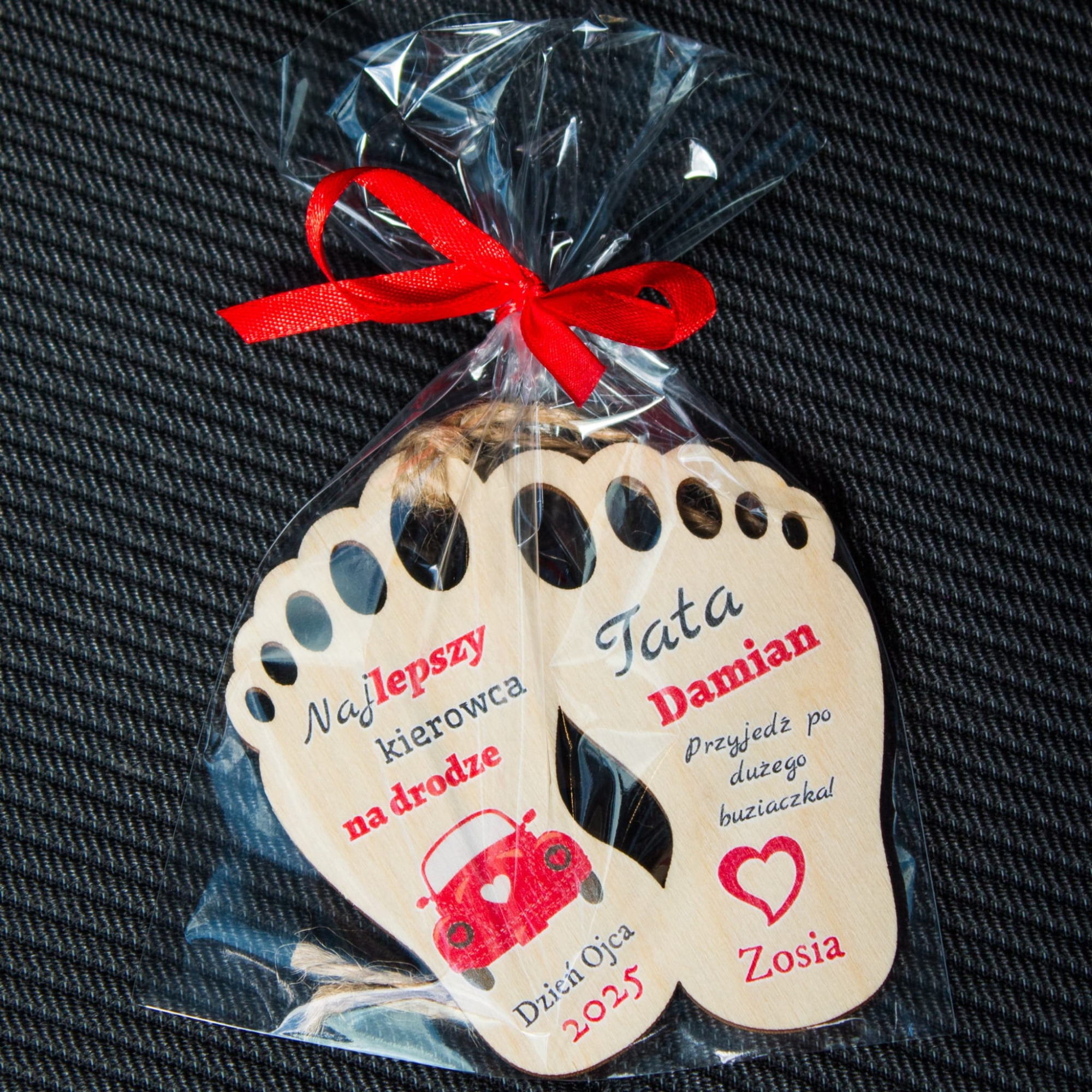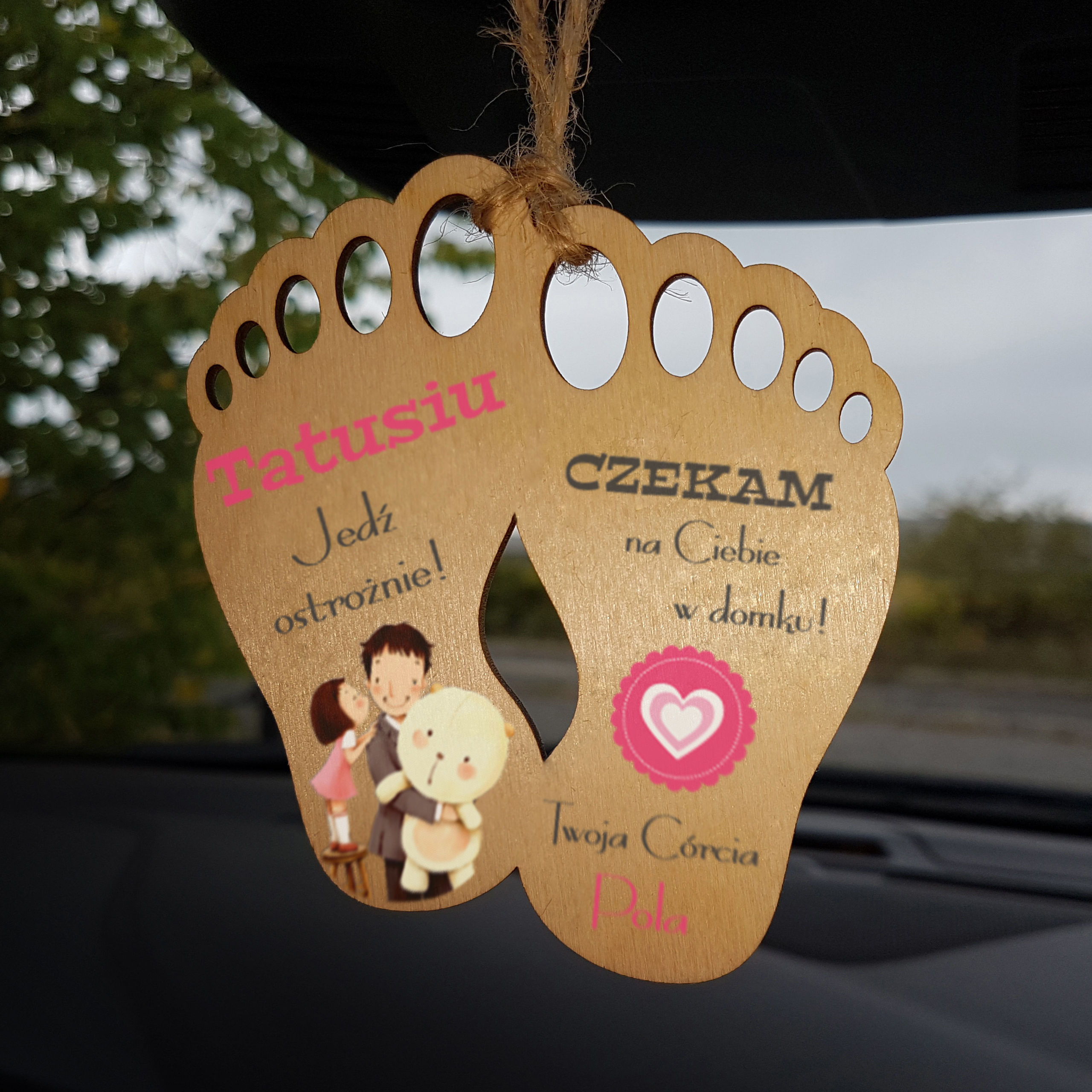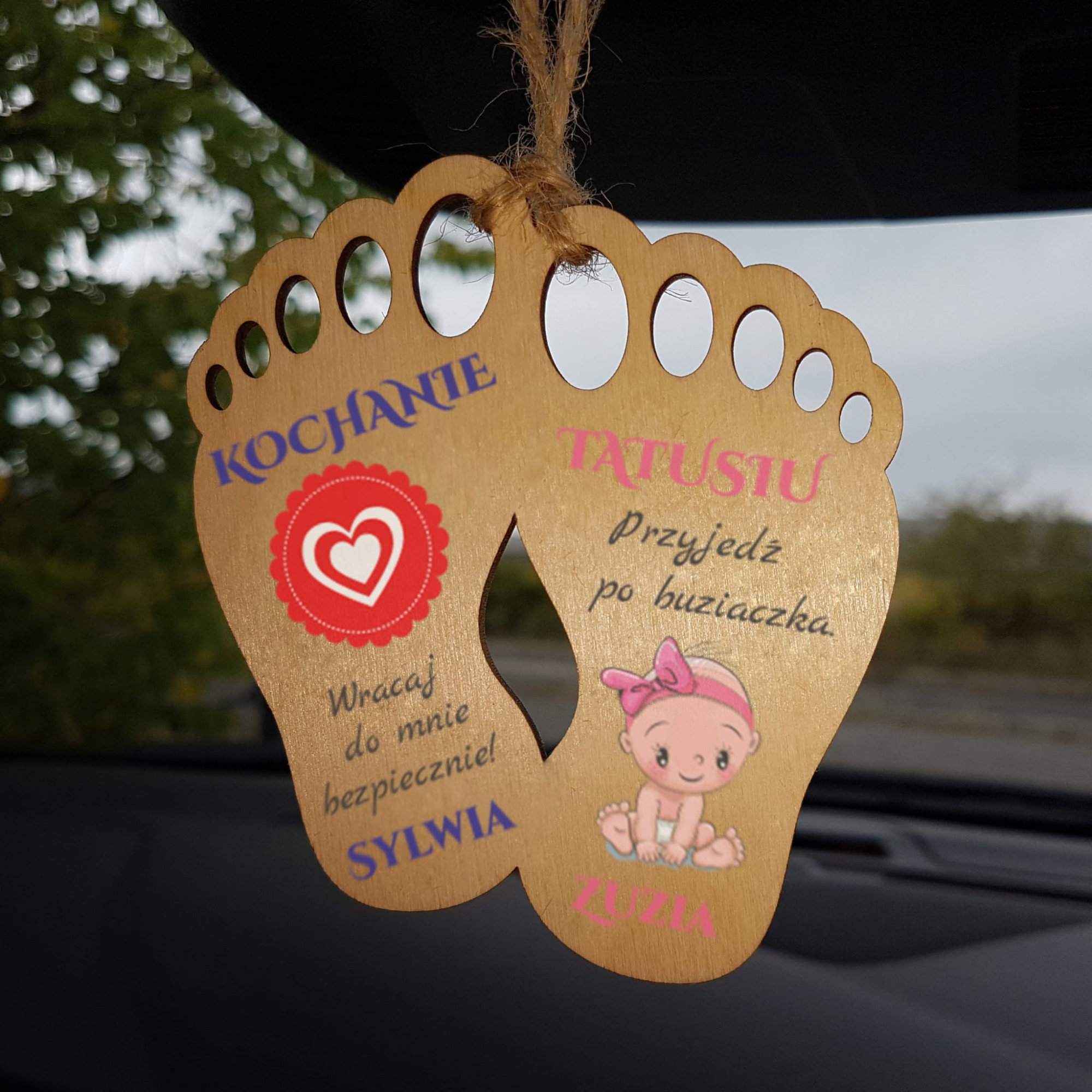 Drewniana zawieszka do samochodu stopki z indywidualnym nadrukiem