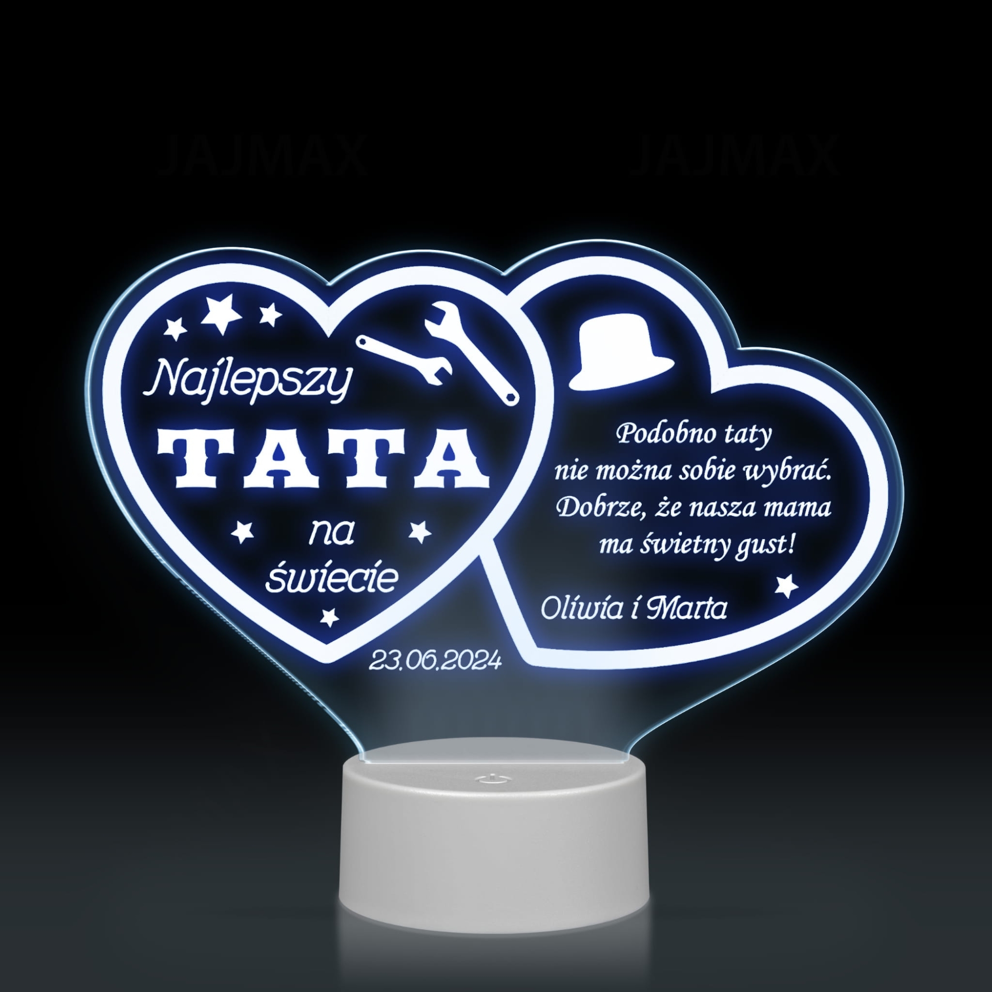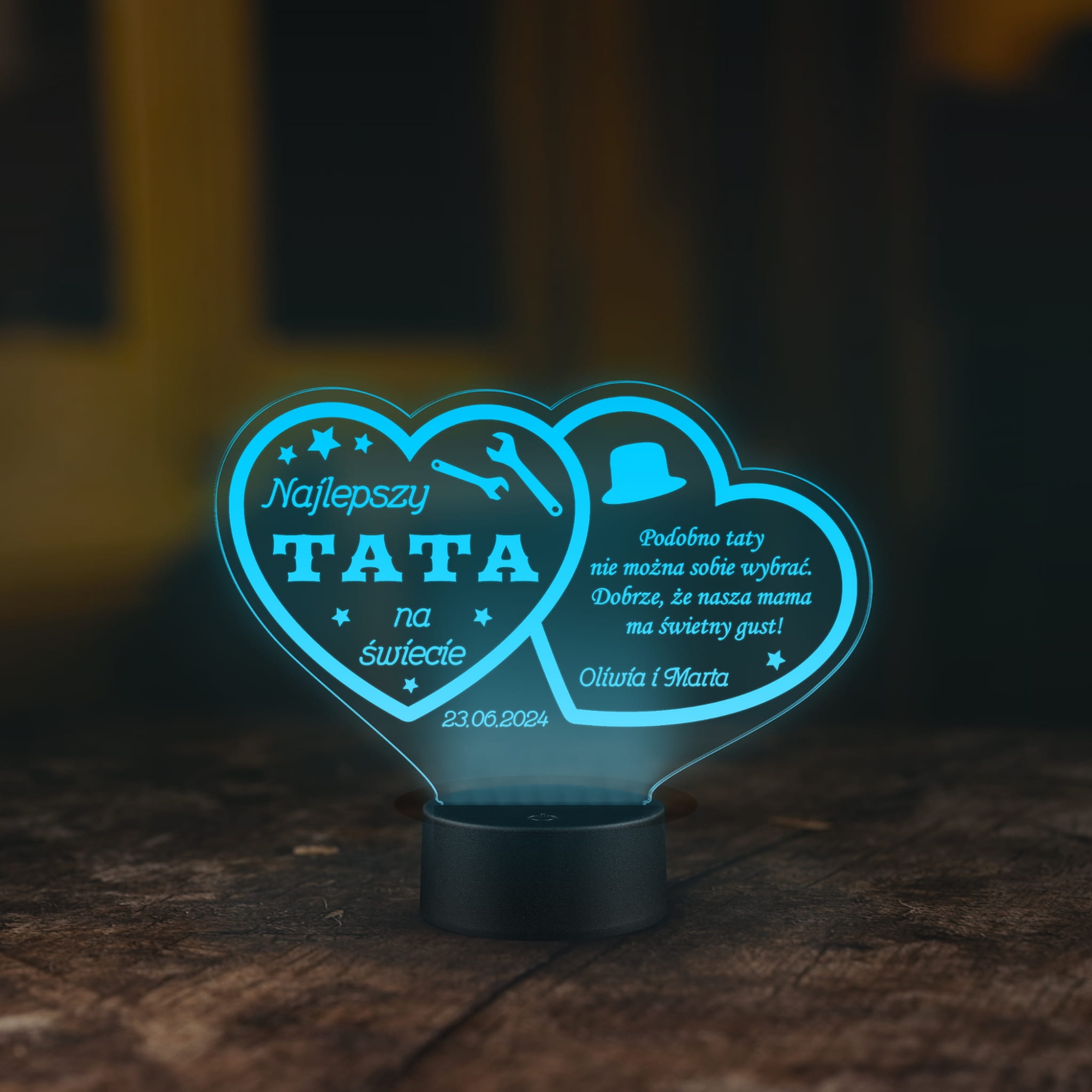Lampka nocna LED dwa serca z personalizacją prezent dla tatusia