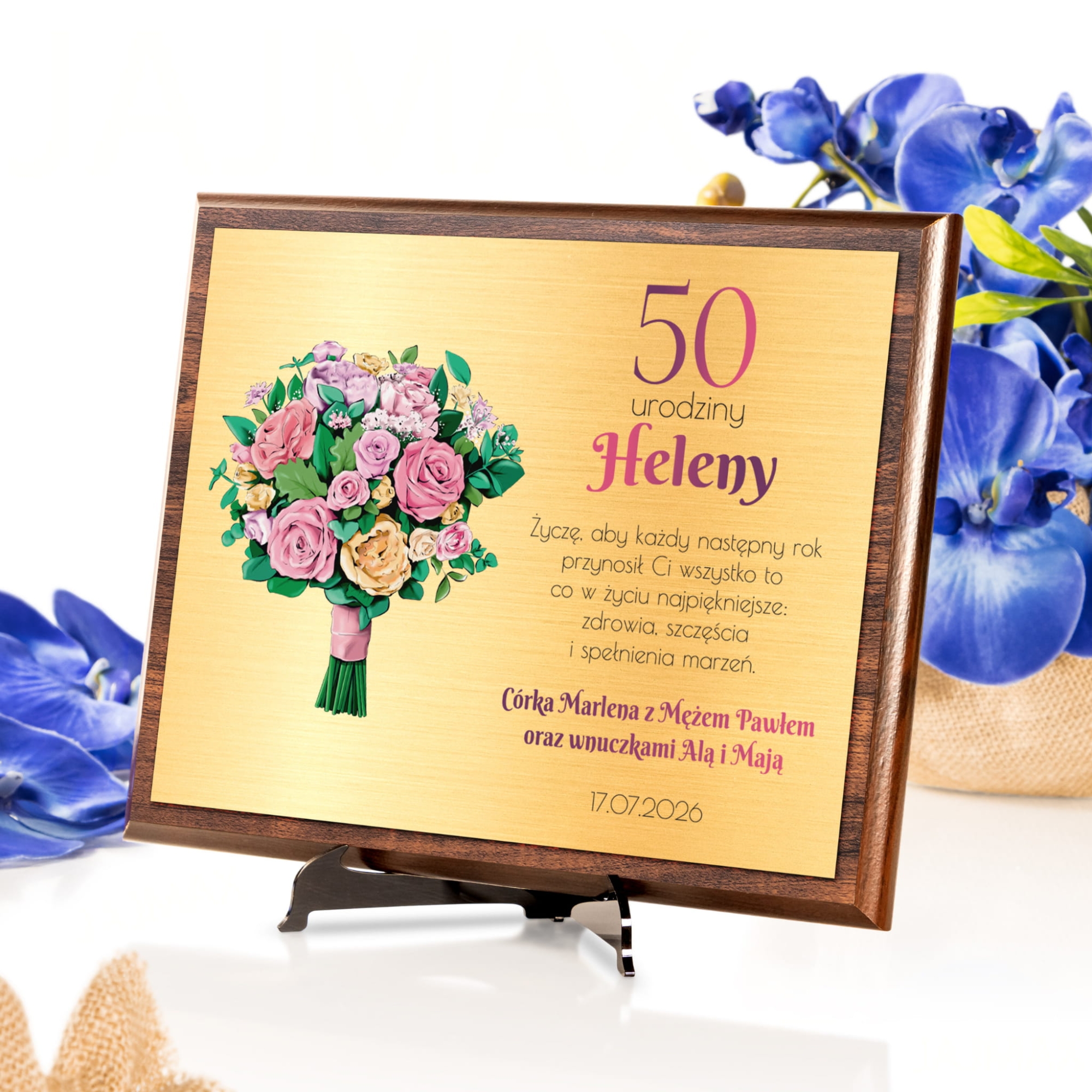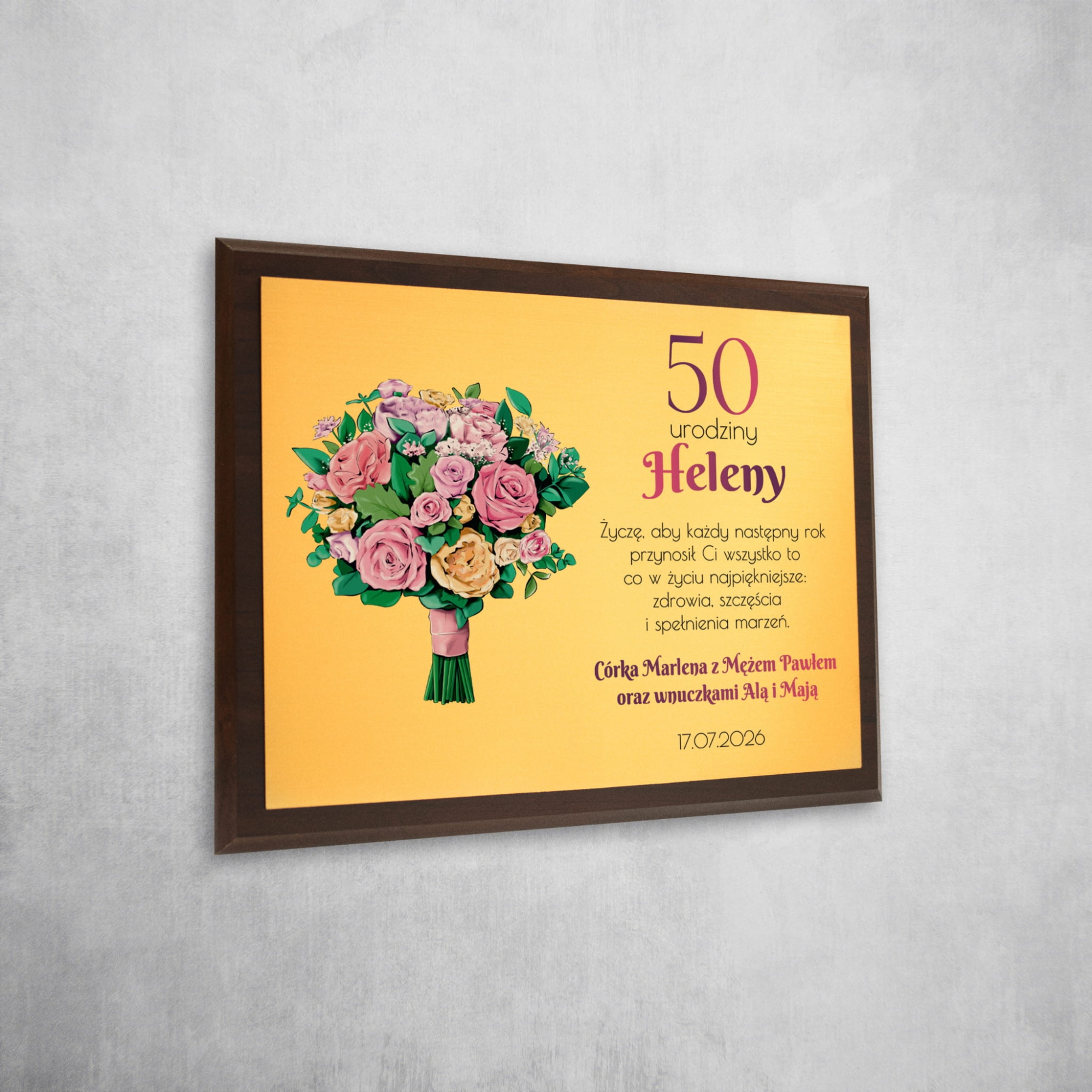 Drewniany złoty obrazek z laminatem elegancki prezent urodzinowy