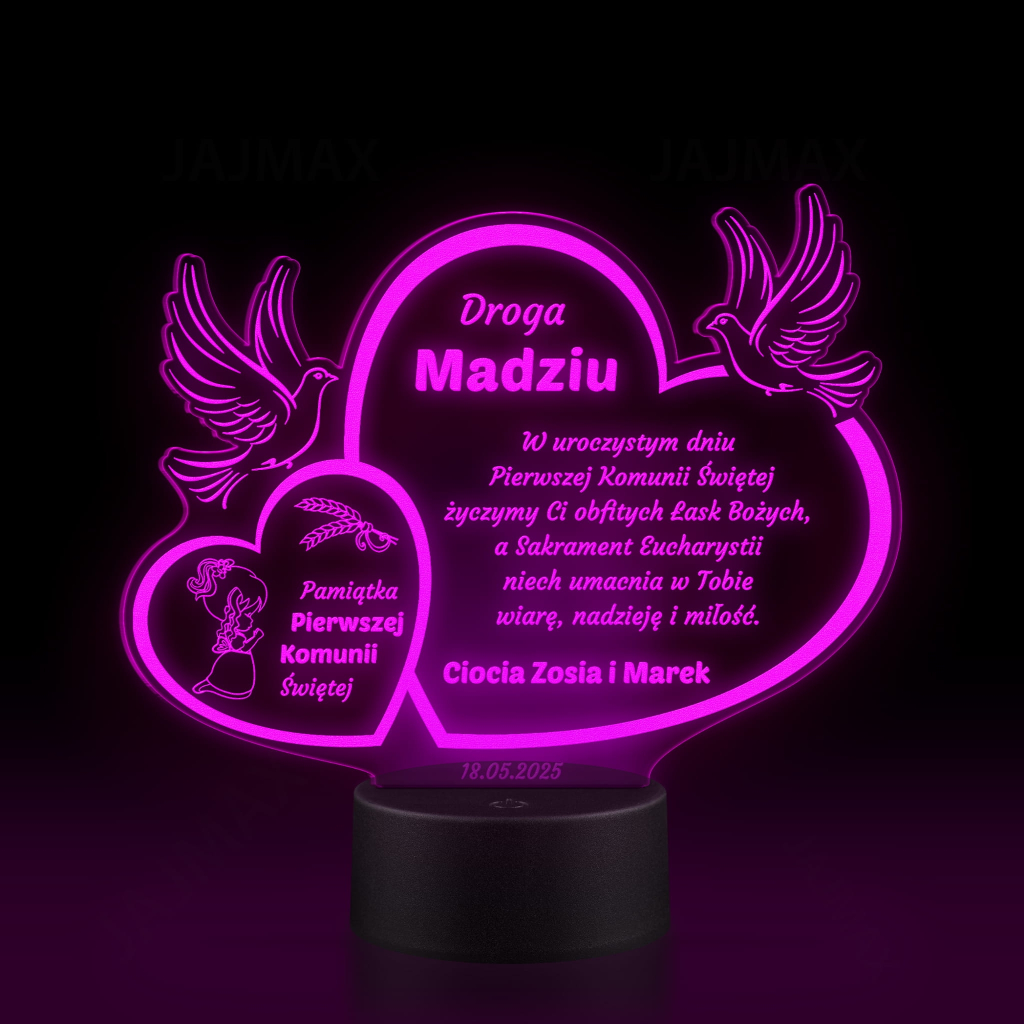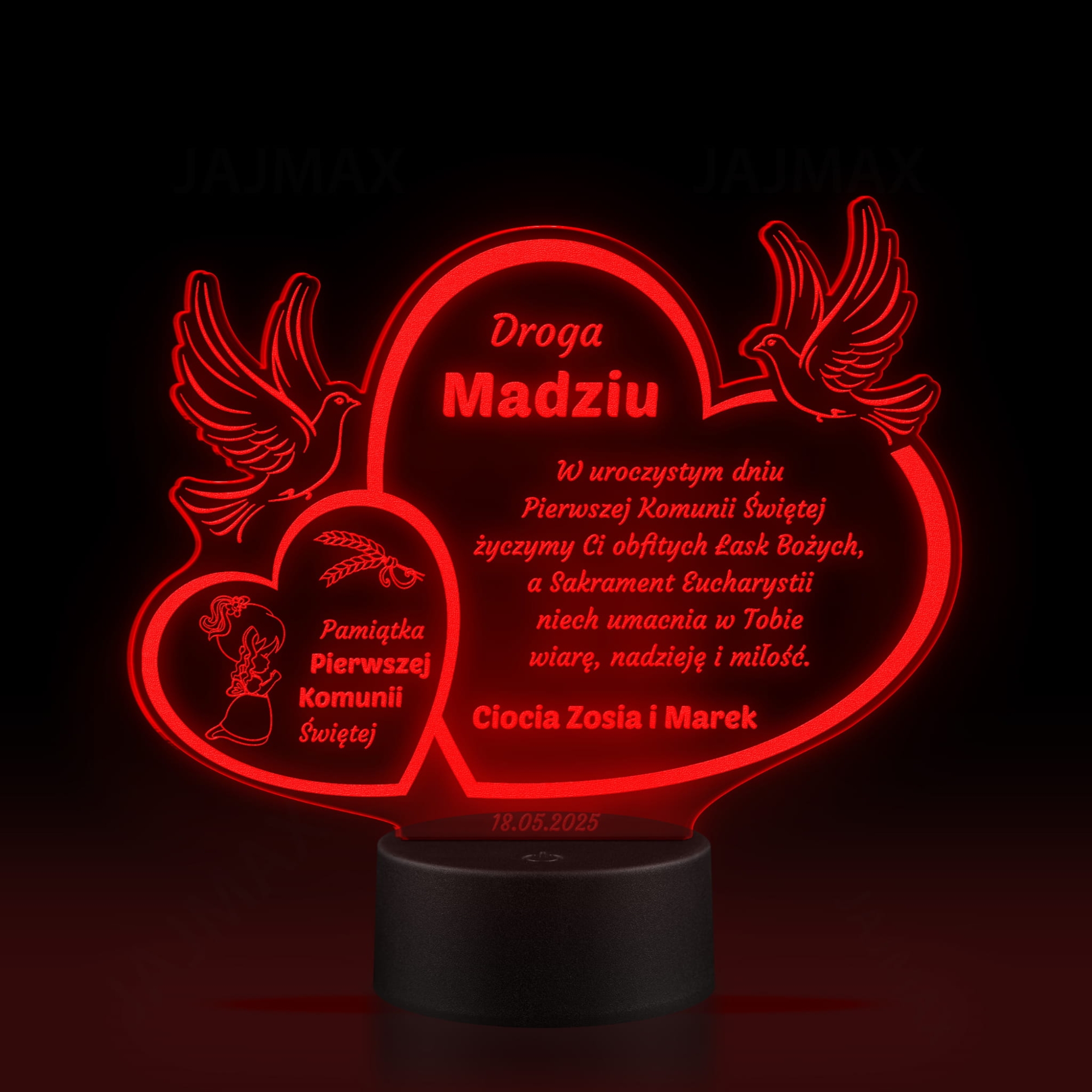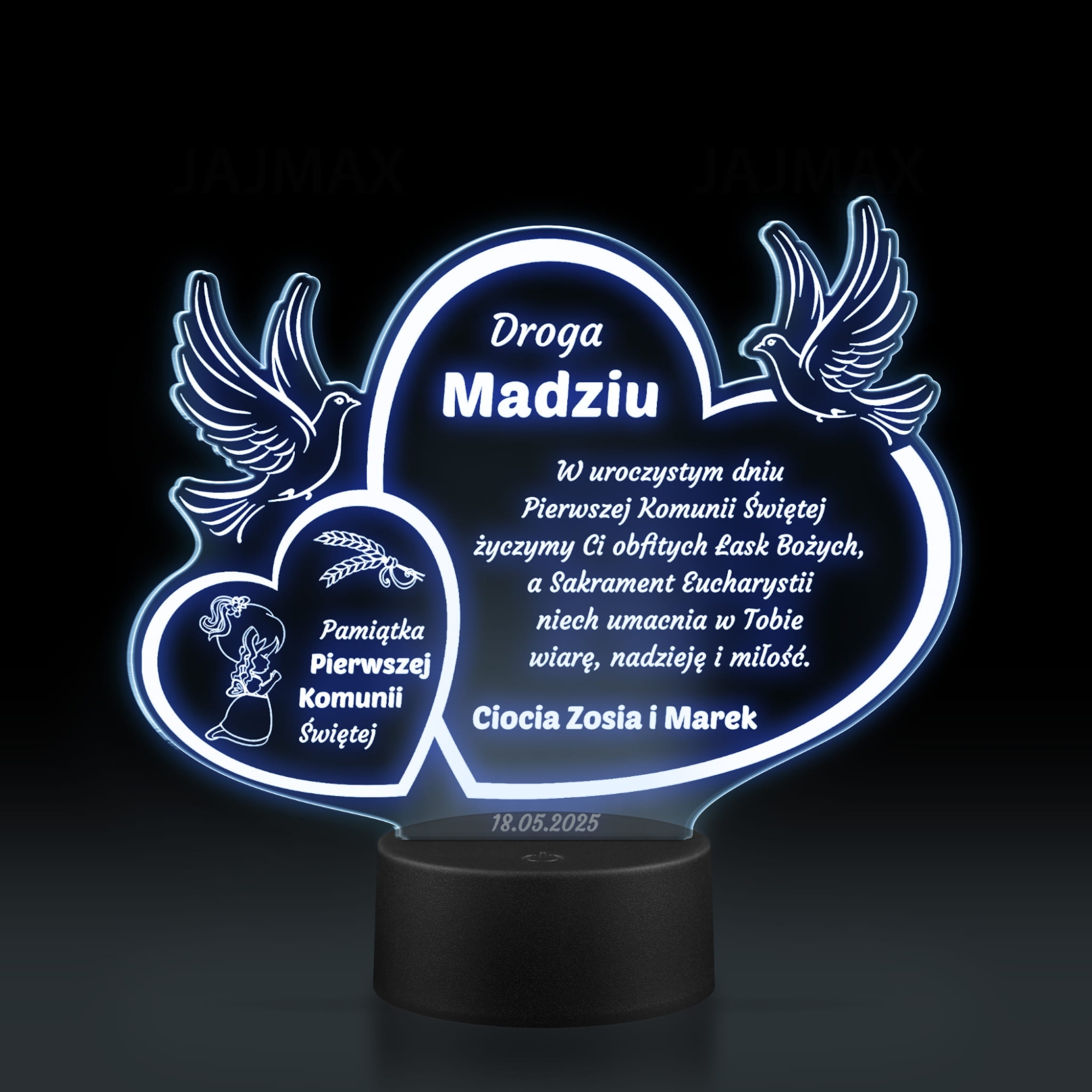 Wyjątkowa statuetka LED z indywidualnym grawerem jako niezapomniana pamiątka komunii dla dziewczynki