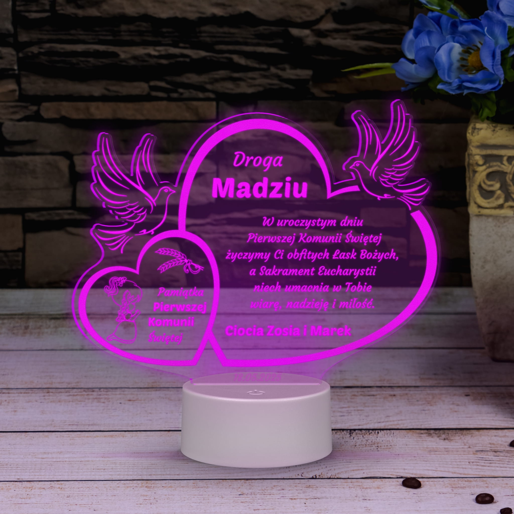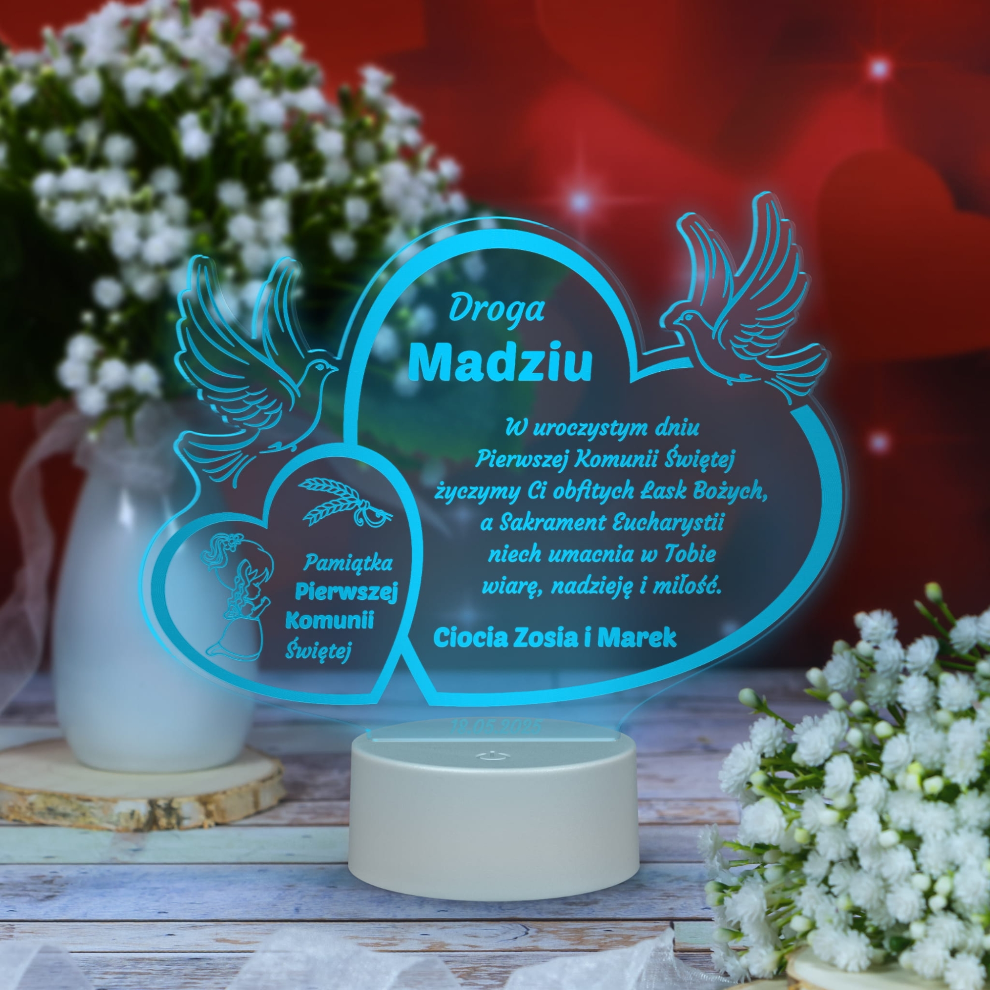 Niech ta statuetka LED stanie się nie tylko piękną ozdobą, ale przede wszystkim symbolem duchowej drogi Twojej córki. Zamów teraz i uczcij ten wyjątkowy dzień pięknym, spersonalizowanym upominkiem!