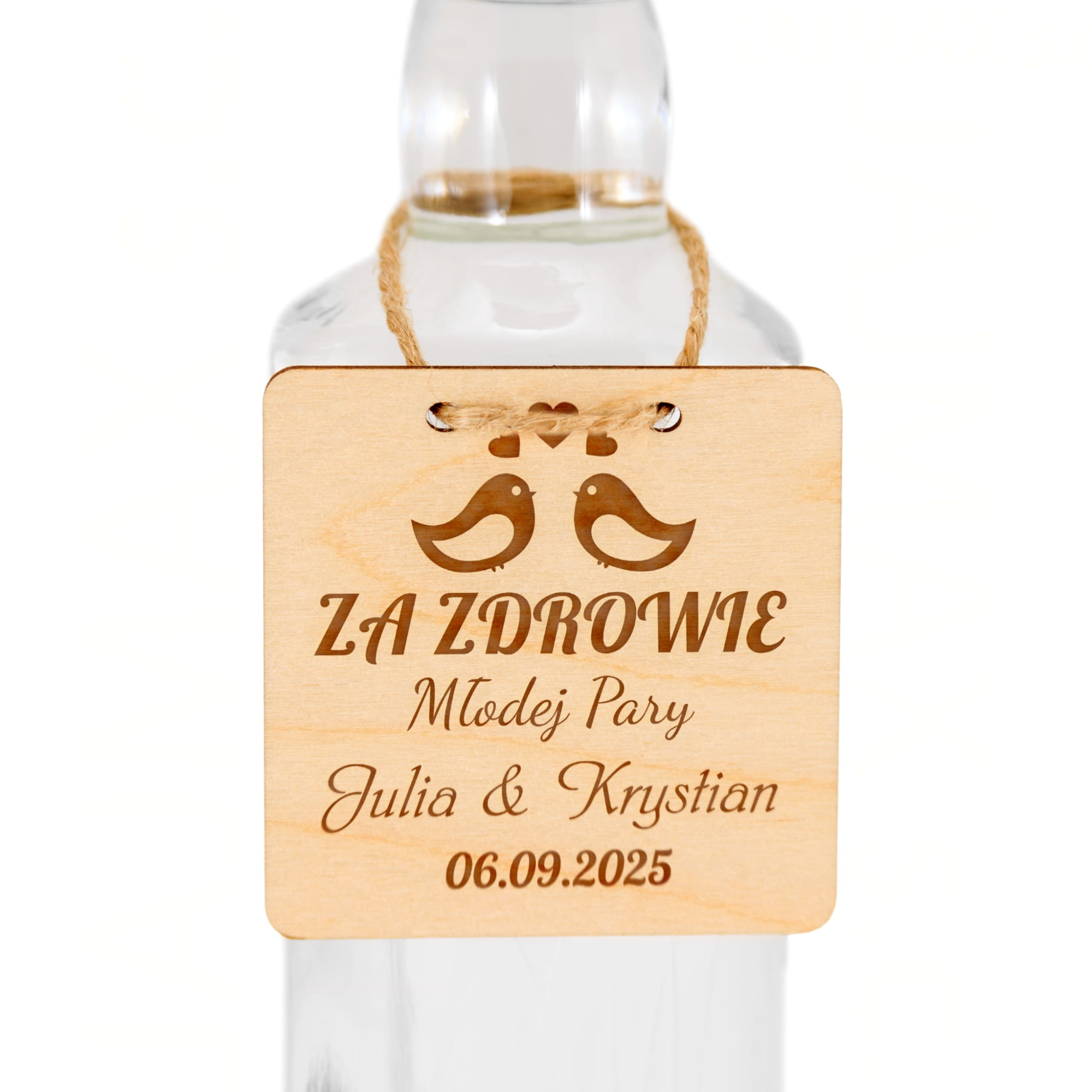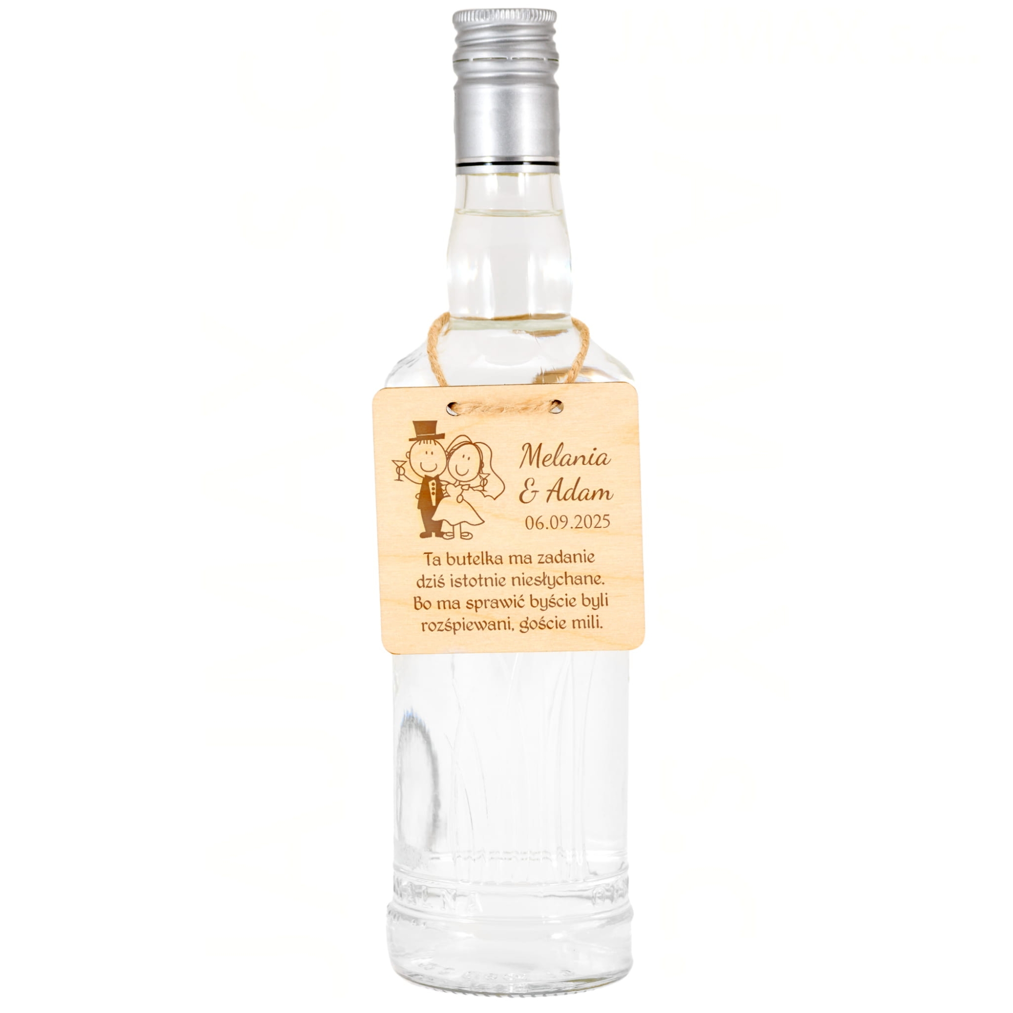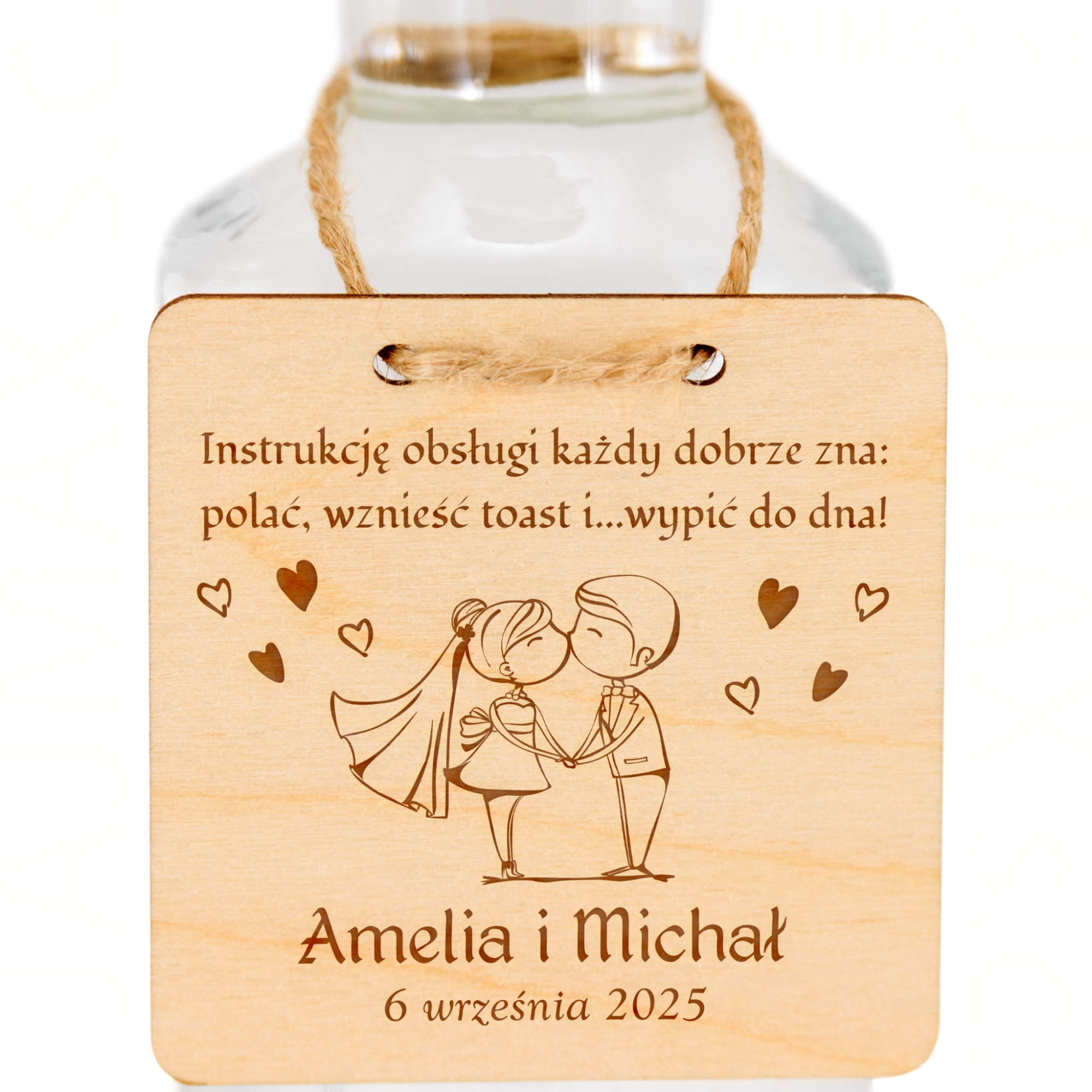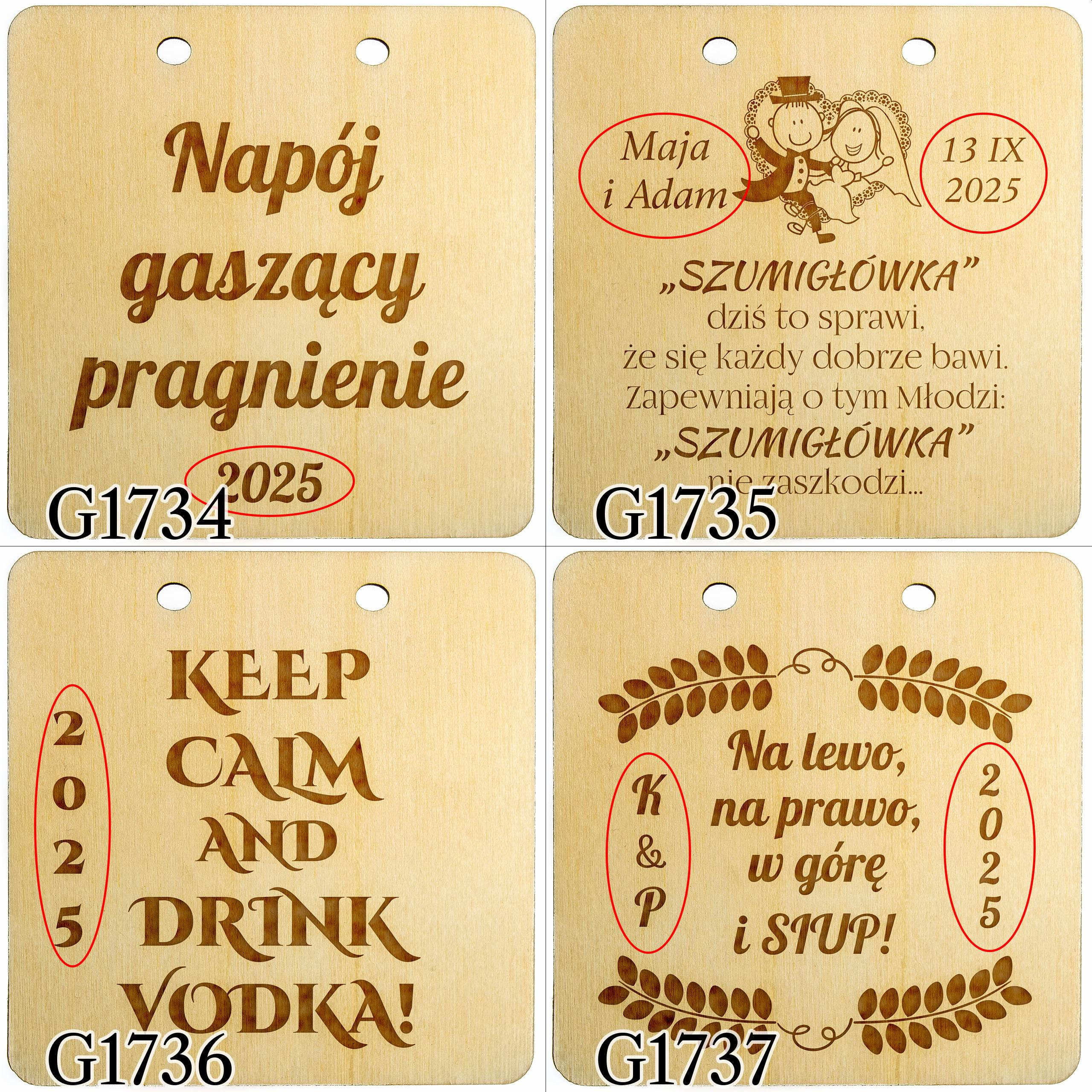 Zawieszki ślubne to doskonałe dopełnienie dekoracji sali weselnej, którego nie może zabraknąć na żadnym weselu. Proponujemy drewniane zawieszki na alkohol w kształcie kwadratów z indywidualnym grawerem. Zawieszki na butelki dzięki personalizacji w postaci daty ślubu, miejsca zaślubin oraz imion małżonków staną się jedyne i niepowtarzalne. Do każdej zawieszki dodajemy sznurek jutowy, dzięki któremu nasze zawieszki ślubne prezentują się znakomicie na butelkach weselnych. Organizując ślub i wesele już teraz pomyśl o tym z pozoru małym, ale bardzo istotnym elemencie wystroju sali weselnej. Krótkie, zabawne cytaty z pewnością rozbawią gości weselnych i sprawią, że zabawa będzie jeszcze lepsza.
