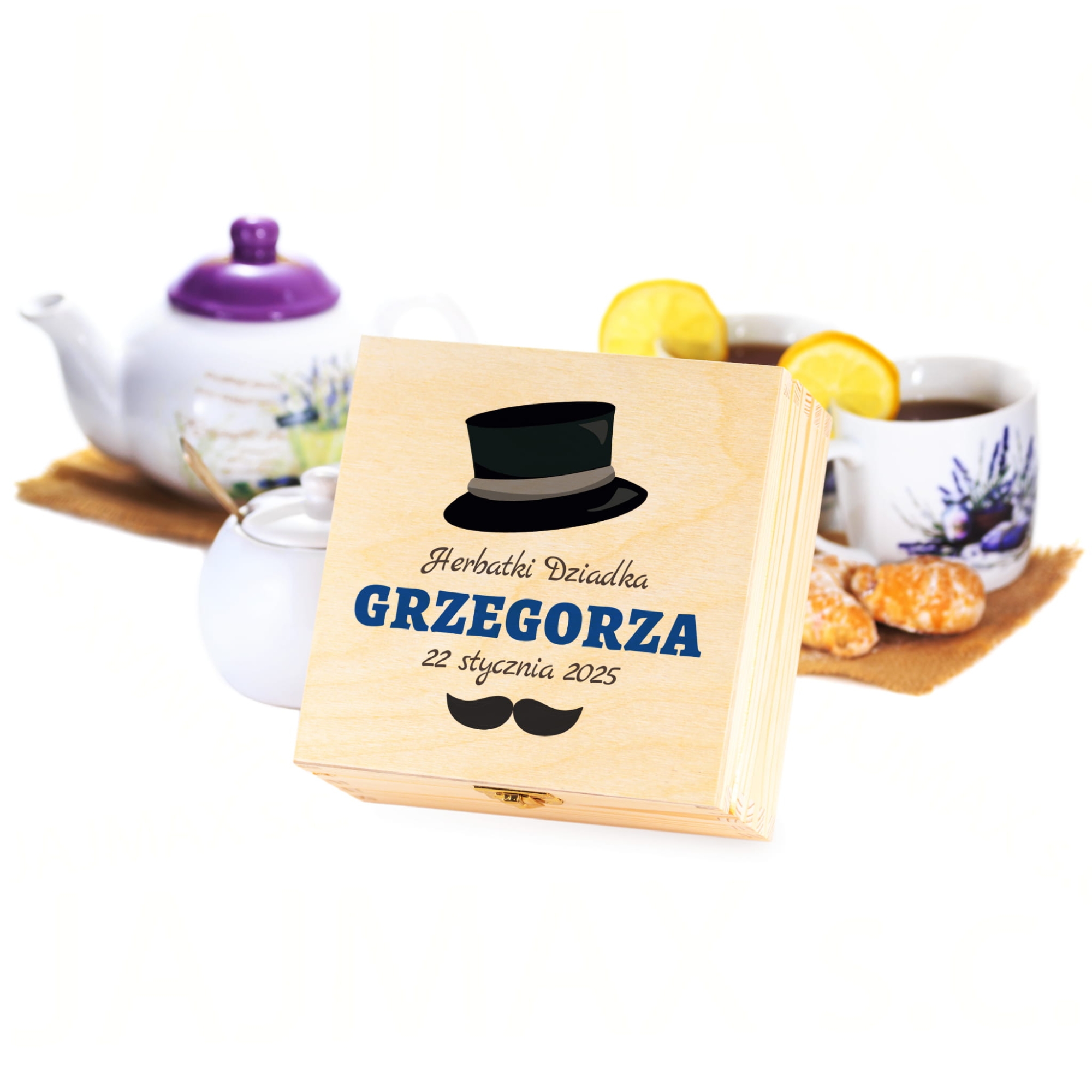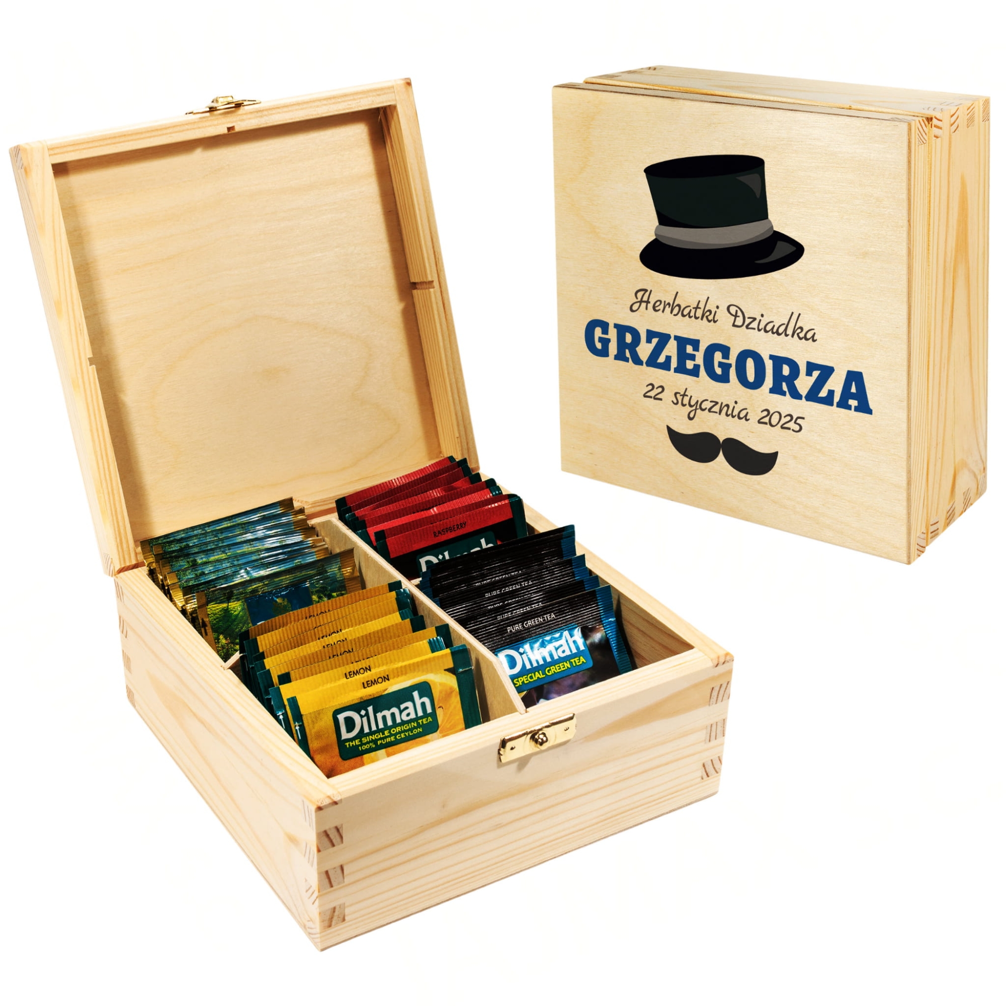 • drewniane pudełko na herbatę z indywidualnym grawerem,