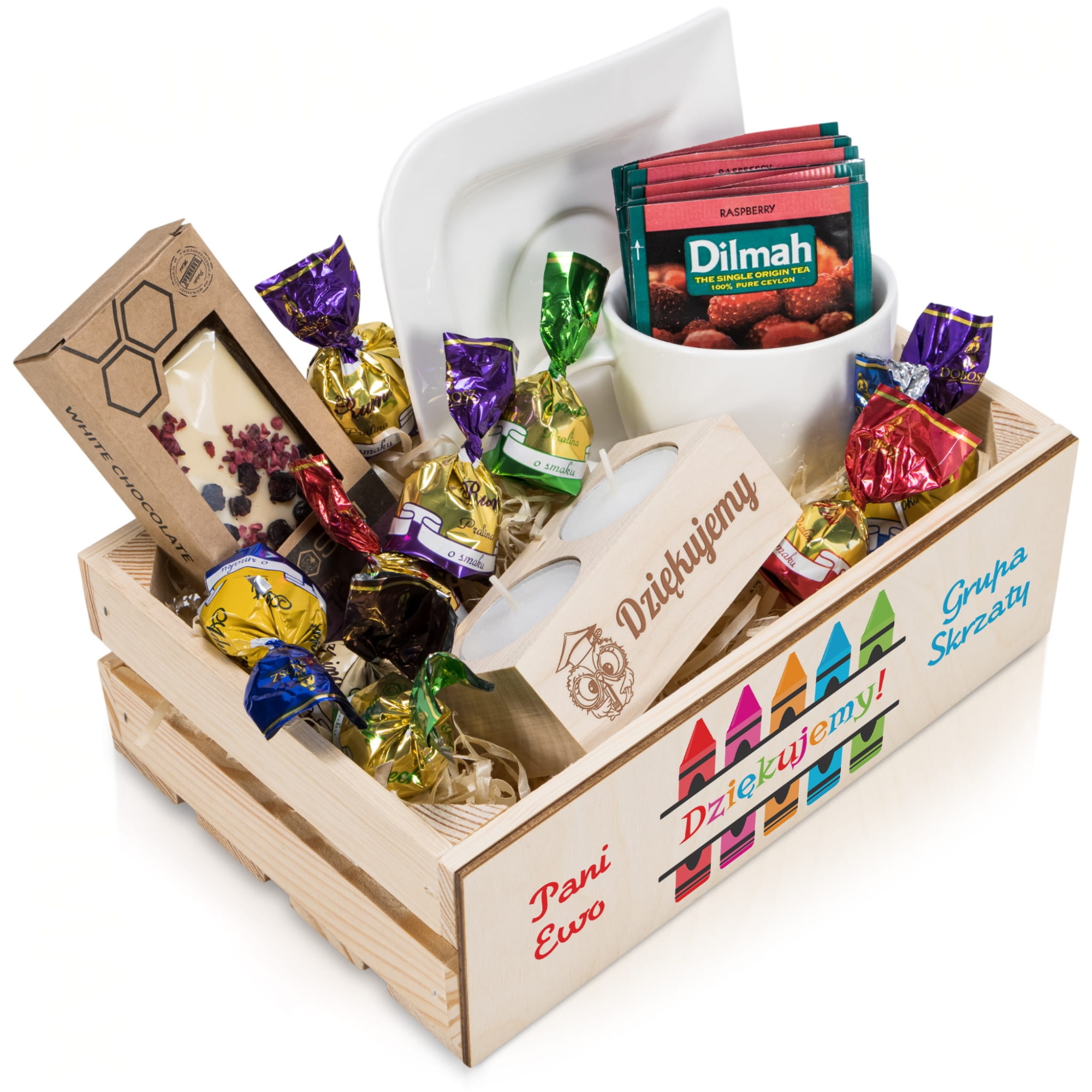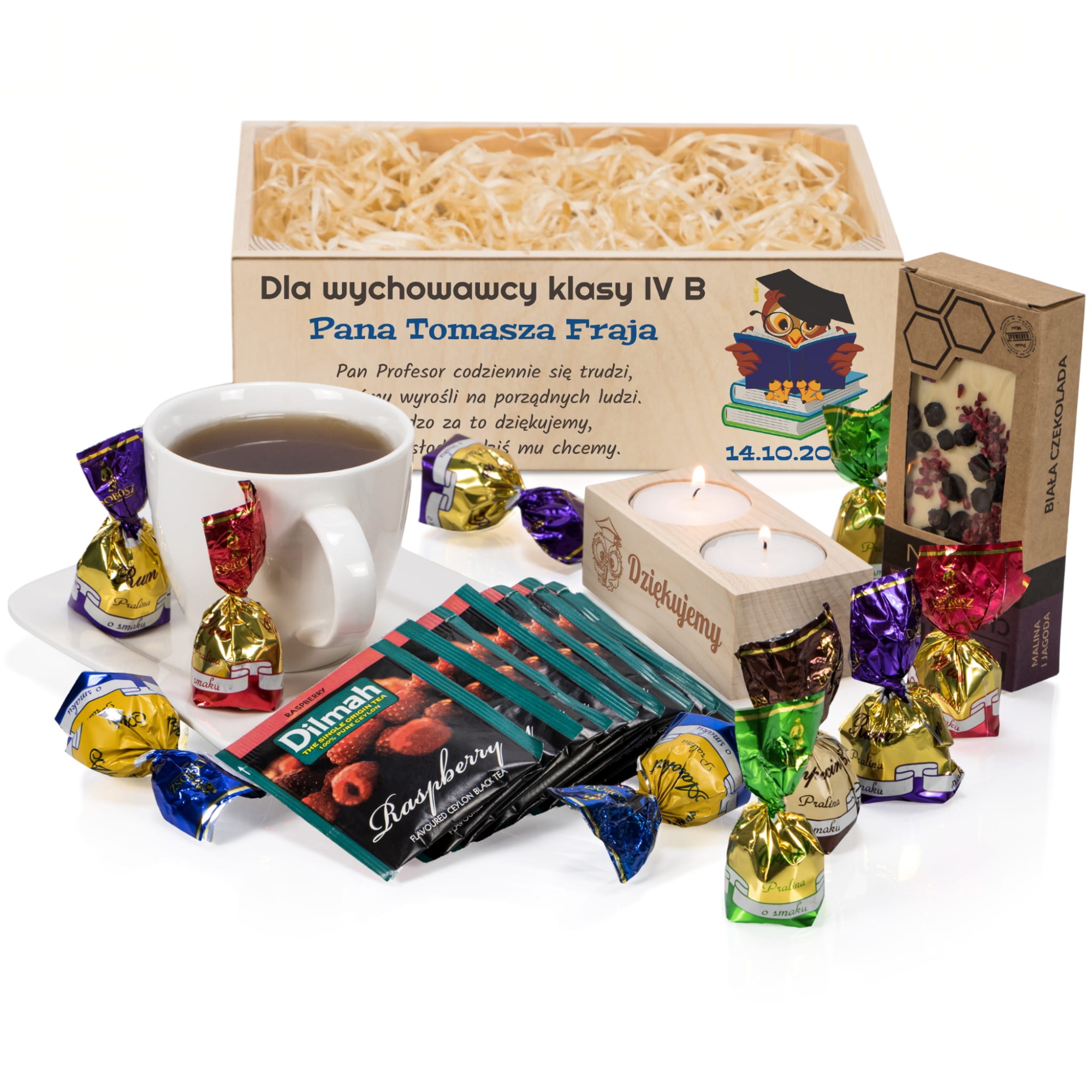 Szukasz prezentu dla wychowawcy? Mamy dla Ciebie wyjątkowy pomysł na prezent na dzień nauczyciela lub zakończenie roku. Nasz kosz prezentowy wypełniony jest produktami wysokiej jakości. Spersonalizowana drewniana skrzyneczka to idealna propozycja na upominek dla wychowawcy, oryginalny prezent dla nauczyciela. Zestaw prezentowy dla wychowawcy wypełniony jest wieloma produktami. Wszystkie elementy zostały dobrane aby stanowiły spójną, użyteczną i elegancką kompozycję. Dzięki indywidualnemu nadrukowi umieszczonemu na tabliczce, jako uczniowie bądź rodzice możecie w podziękować nauczycielom za ich trud włożony w edukację i wychowanie.