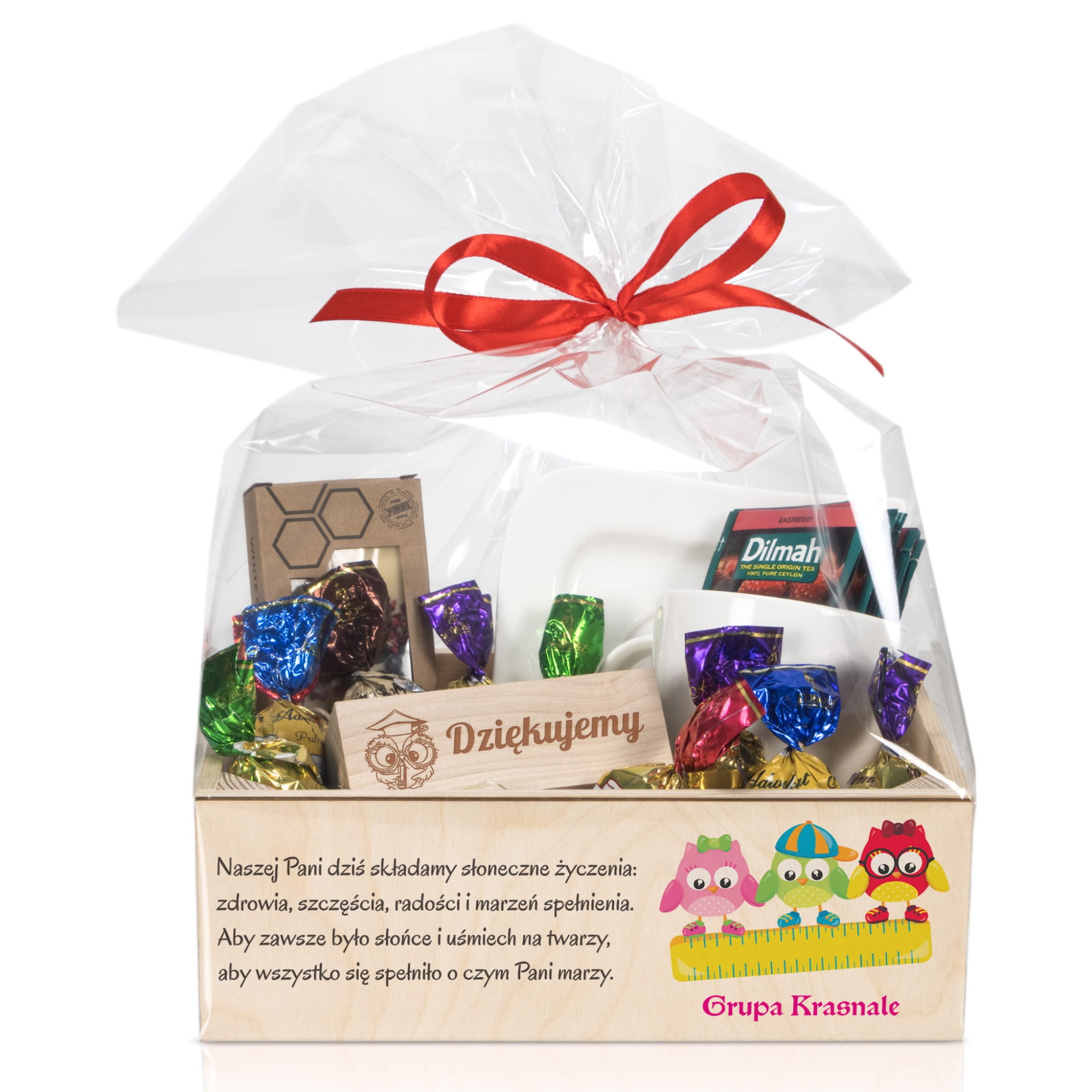 Drewniany personalizowany kosz prezentowy z dedykacją zestaw prezentowy dla nauczyciela wychowawcy