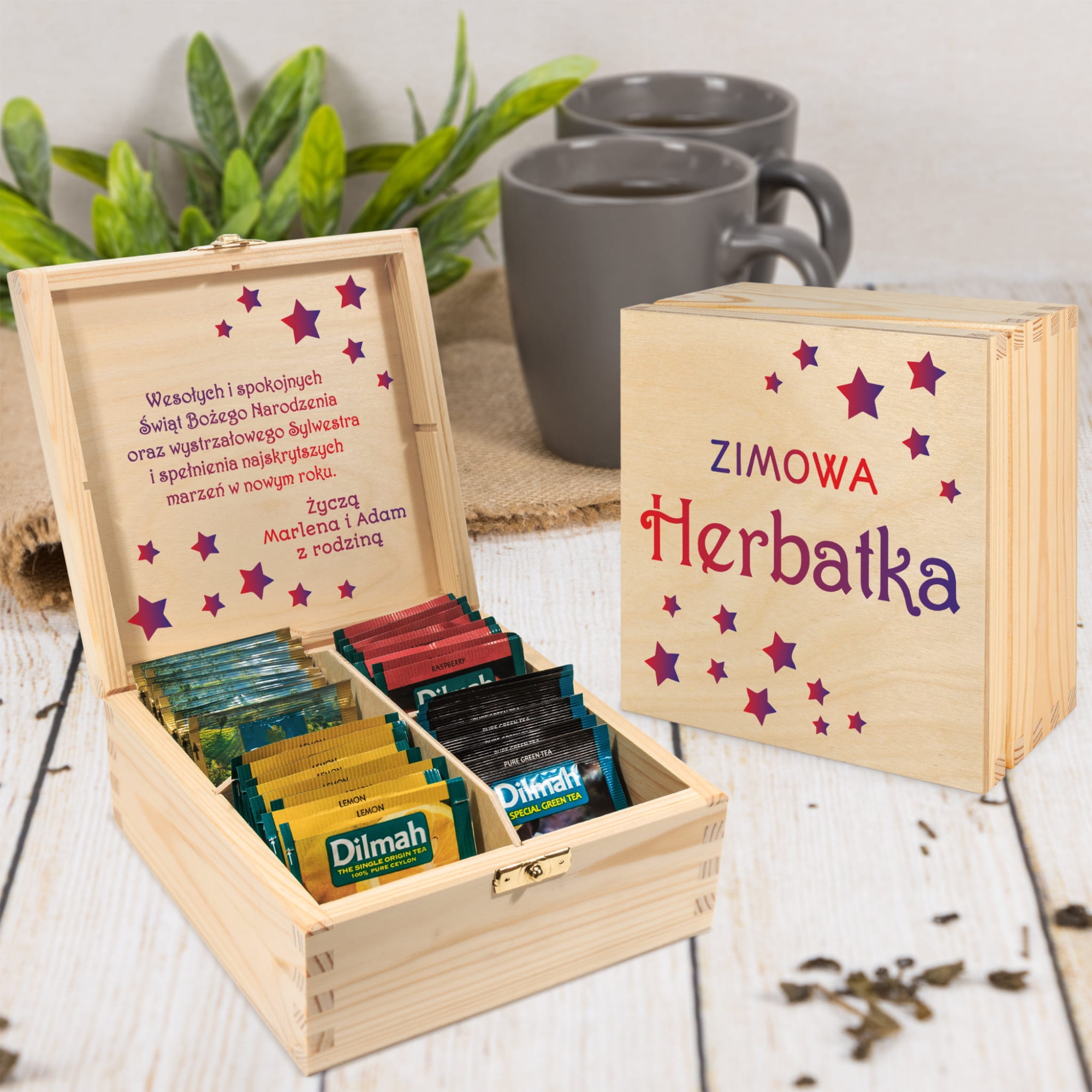 HERBACIARKA z wkładką Box Prezentowy zestaw na Boże Narodzenie Box Prezentowy zestaw na Święta z życzeniami pudełko pyszności Drewniane pudełko słodkości prezent świąteczny z życzeniami nadruk