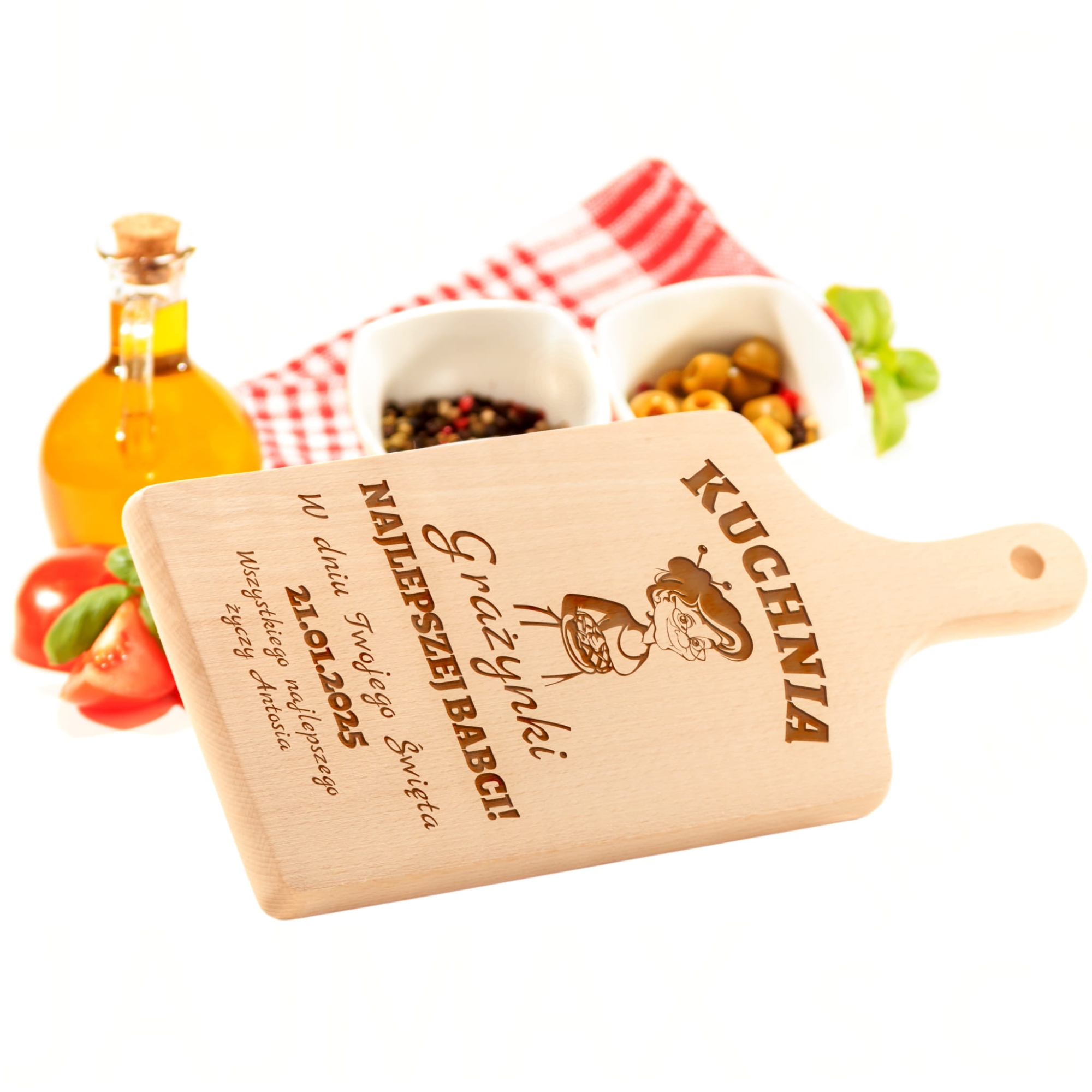 Wykonana z trwałego drewna bukowego deska z rączką i łopatka, to prezent na dzień babci i dziadka, który przyda się w kuchni. Zamień klasyczny produkt na personalizowany upominek, dedykowany wyjątkowym osobom. Drewniany zestaw to praktyczny prezent na dzień babci z dedykacją umieszczoną w samym sercu niespodzianki. Co można kupić dziadkom na prezent? Na jakie trendy postawić? Nowoczesny czy tradycyjny prezent na dzień babci? Nie zastanawiaj się dłużej, jaki upominek dla babci na dzień babci wybrać. Wybierz produkt, który będzie trafnym połączeniem klasycznego stylu z innowacyjnym akcentem w postaci dedykacji.