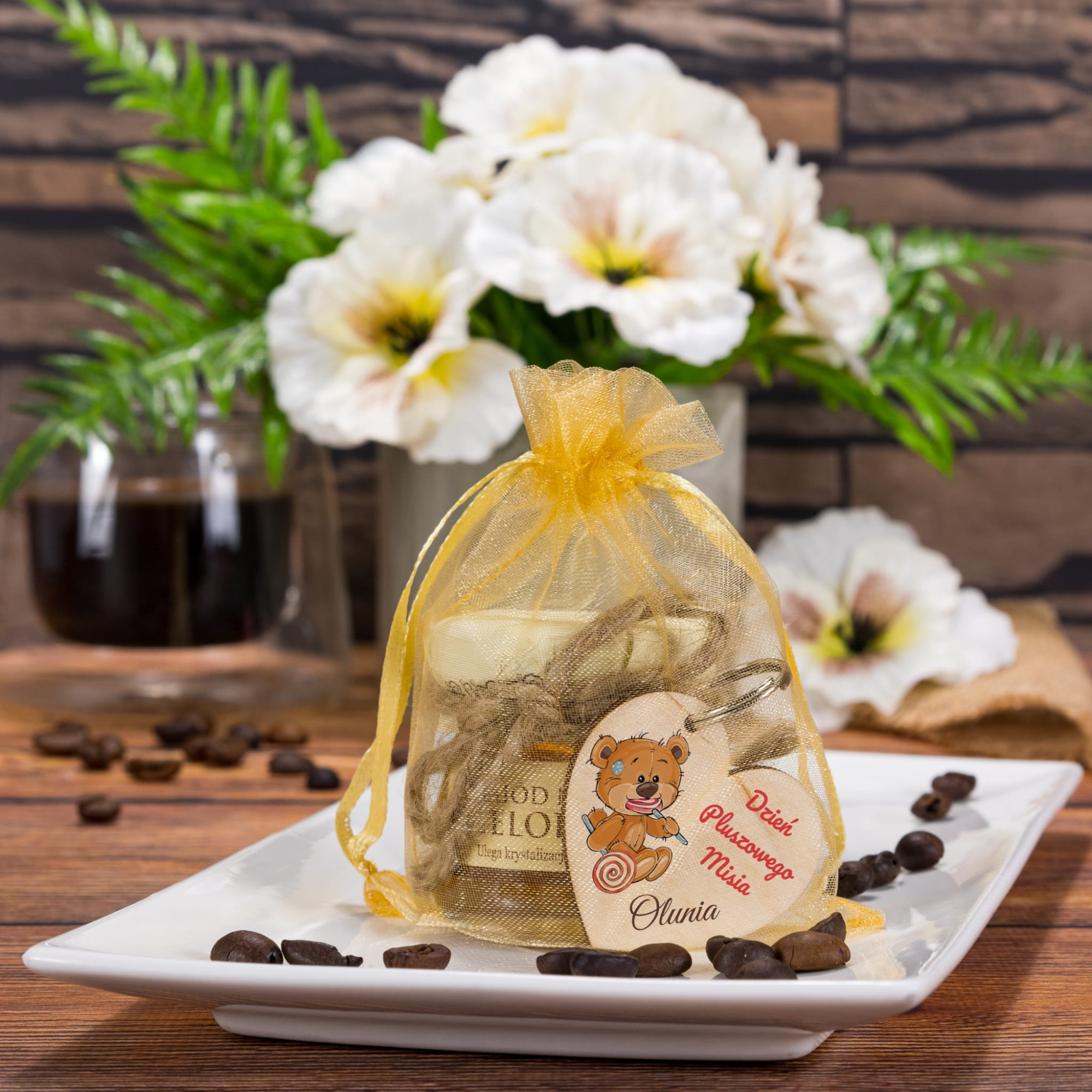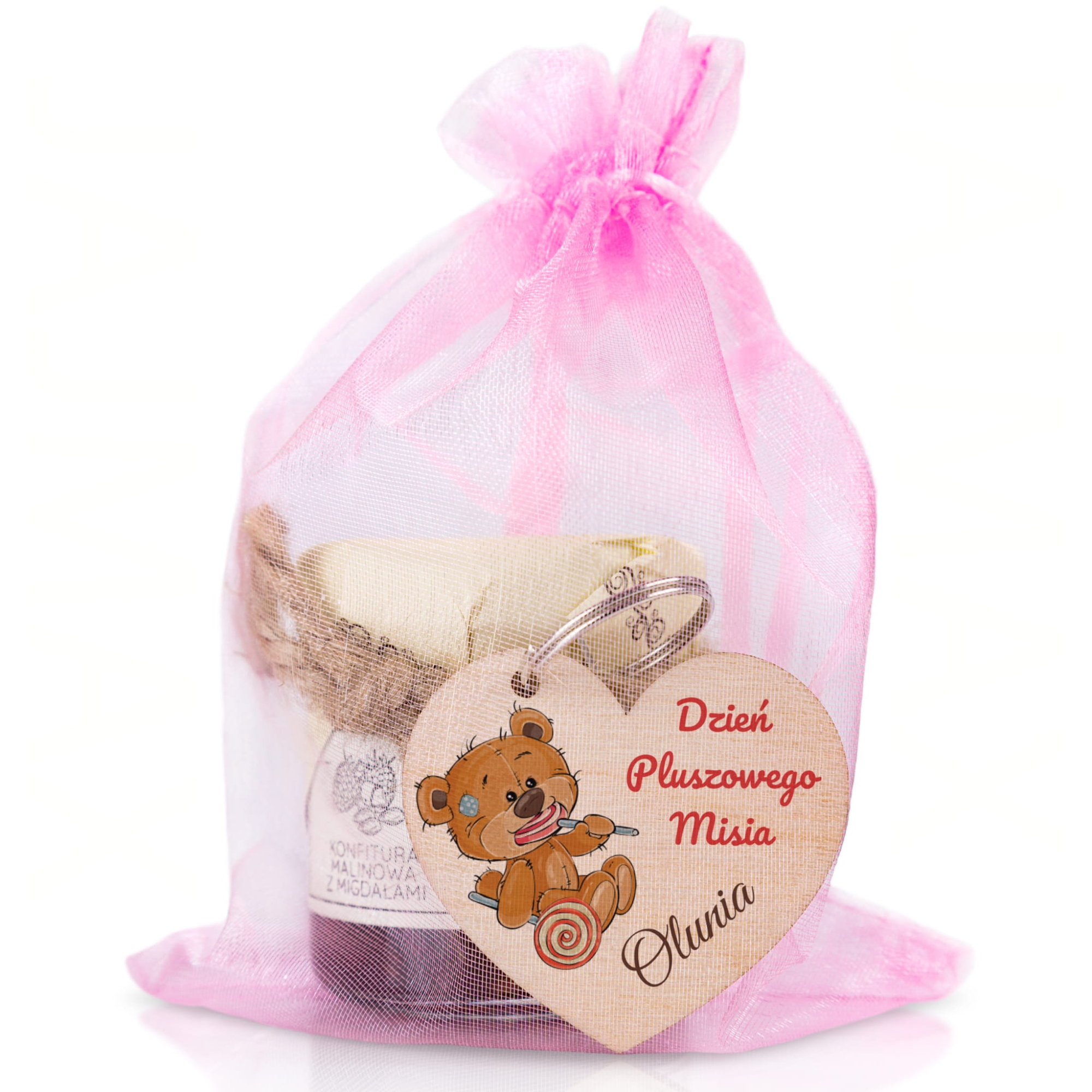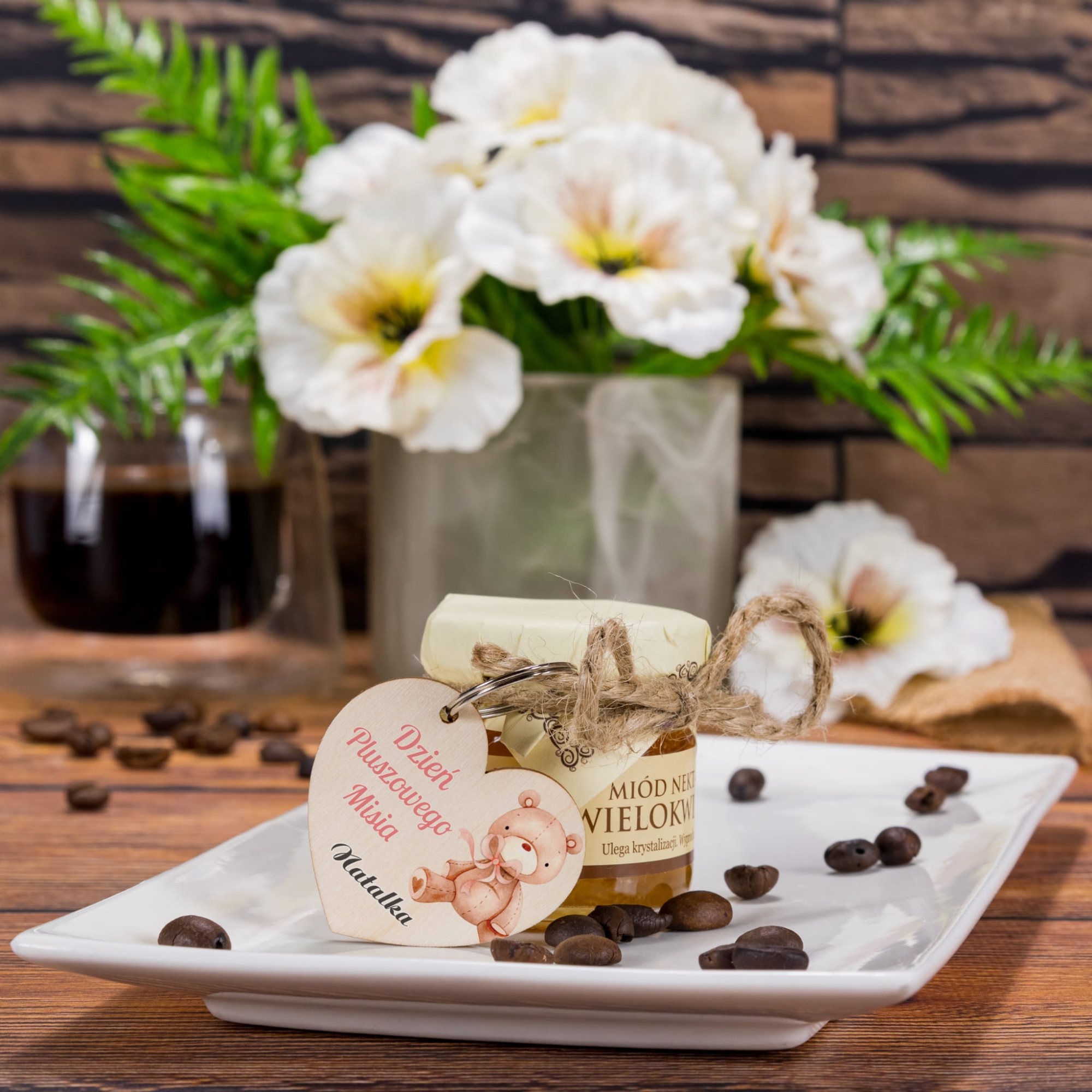 Zestaw Miód i Breloczek serce na DZIEŃ PLUSZOWEGO MISIA imienny
