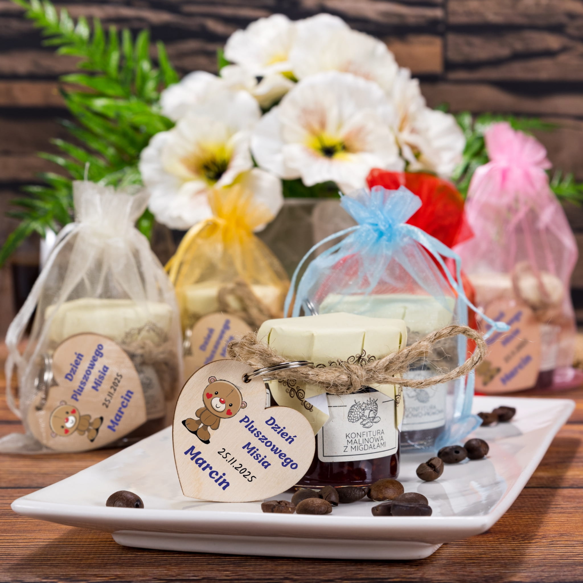 Dzień Pluszowego Misia to święto uwielbiane przez wszystkie dzieci. Jeśli organizujesz w przedszkolu lub w szkole zabawy na Dzień Pluszowego Misia nie zapomnij o upominkach dla dzieci. Nasza propozycja to, to co misie lubią najbardziej czyli miodzik z breloczkiem serce z imieniem dziecka. Zestaw posiada ozdobny woreczek z organzy w jednym z 6 kolorów jakie mamy do wyboru. Taki pomysł to super pamiątka dla dziecka z Dnia Pluszowego Misia.