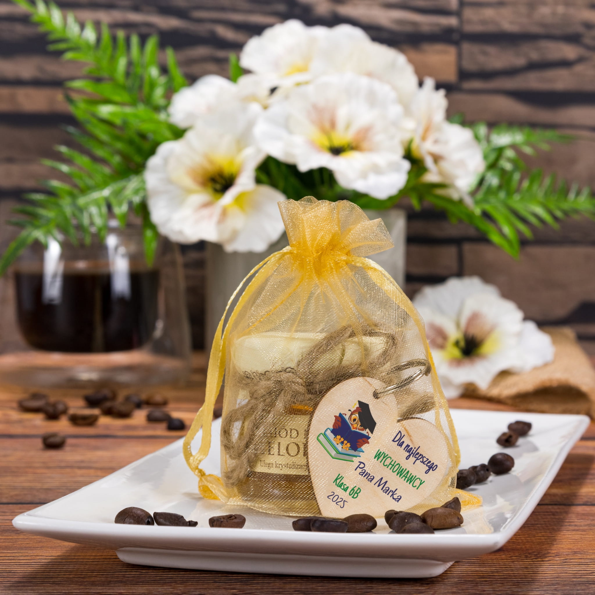 Nasza propozycja na oryginalny prezent dla nauczyciela to miodzik lub konfitura w ozdobnym woreczku z organzy z personalizowanym breloczkiem. Ten zestaw powstał jako alternatywa dla tradycyjnych kwiatów i czekoladek, które wydają się już przeżytkiem. Taki upominek dla nauczyciela lub upominek dla wychowawcy to świetny pomysł na prezent na Dzień Nauczyciela i prezent na Zakończenie Roku Szkolnego. Do wyboru aż 6 kolorów woreczków z organzy i kilka super wzorów graficznych. Miodzik lub konfiturka będą słodkim upominkiem, a breloczek miłą i praktyczną pamiątką.