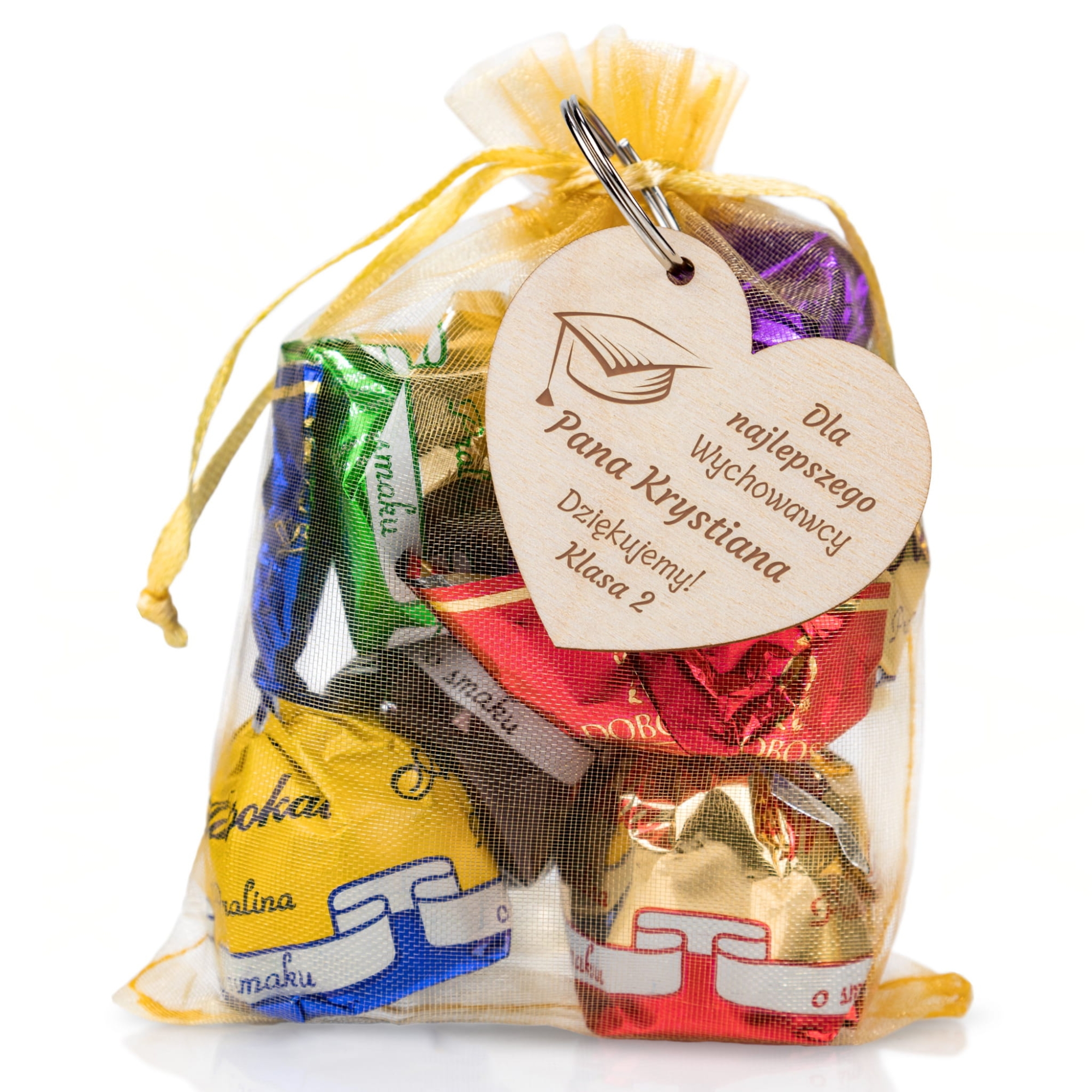 Tradycyjne prezenty dla nauczyciela jak kwiaty czy czekoladki wydają się już nieco nudne. Dlatego stworzyliśmy wyjątkowy zestaw jako prezent dla nauczyciela z dedykacją. Czekoladowe praliny w ozdobnym kolorowym woreczku z organzy z grawerowanym breloczkiem to oryginalna propozycja. Ten pomysł na prezent na Zakończenie Roku Szkolnego lub prezent na Dzień Nauczyciela sprawdzi się znakomicie zarówno od ucznia jak i od całej klasy. Cukierki w zestawie to pralinki o różnych smakach w ładnie prezentujących się kolorowych, błyszczących papierkach. Do wyboru aż 6 kolorów woreczków z organzy i kilka wzorów graficznych. Zaskocz ulubionych nauczycieli i wybierz oryginalny prezent na Dzień Nauczyciela i prezent na Zakończenie Roku.
