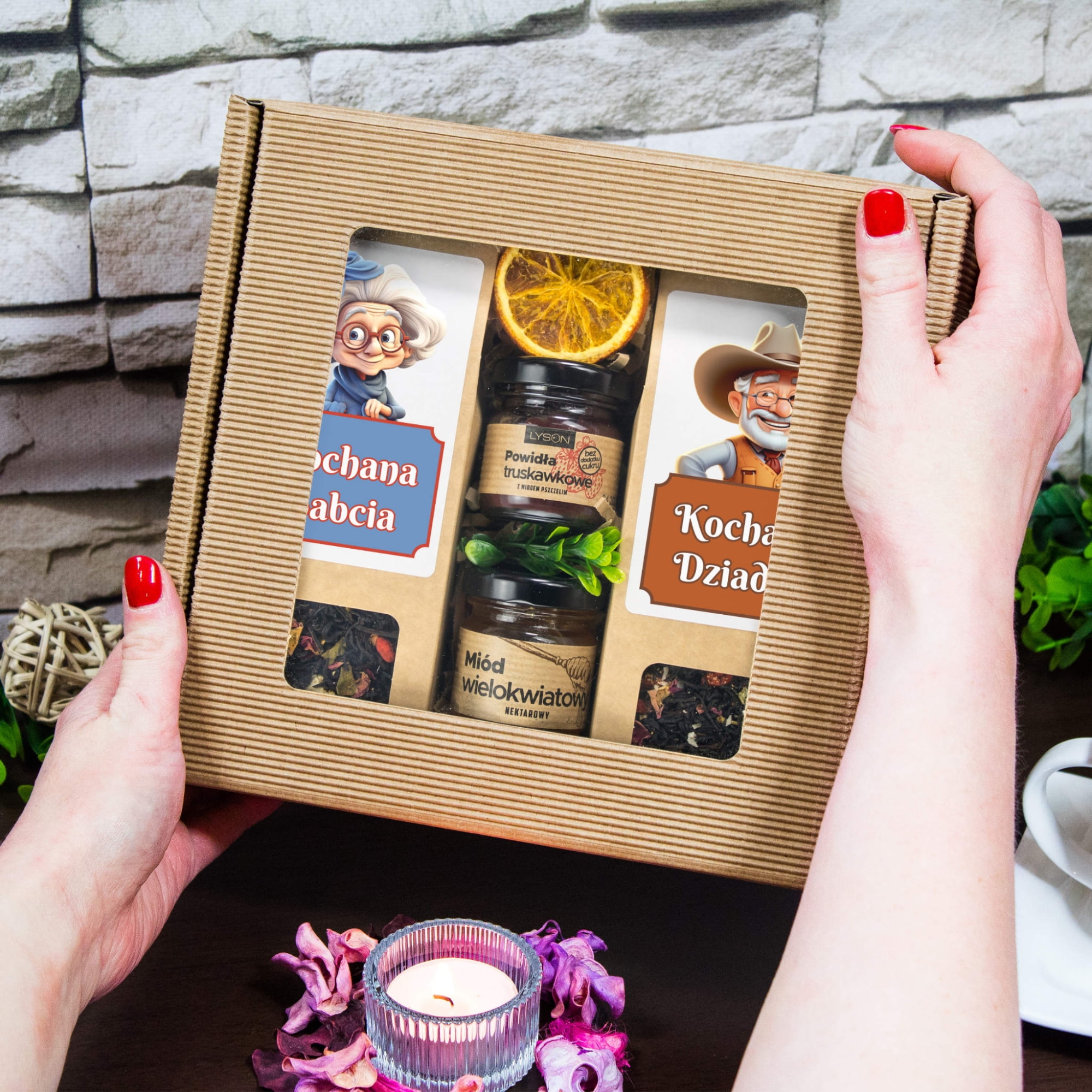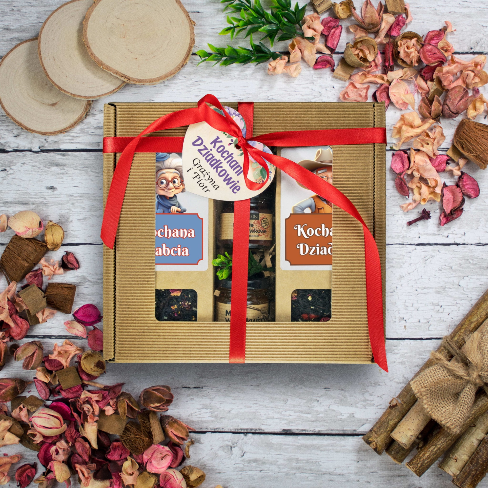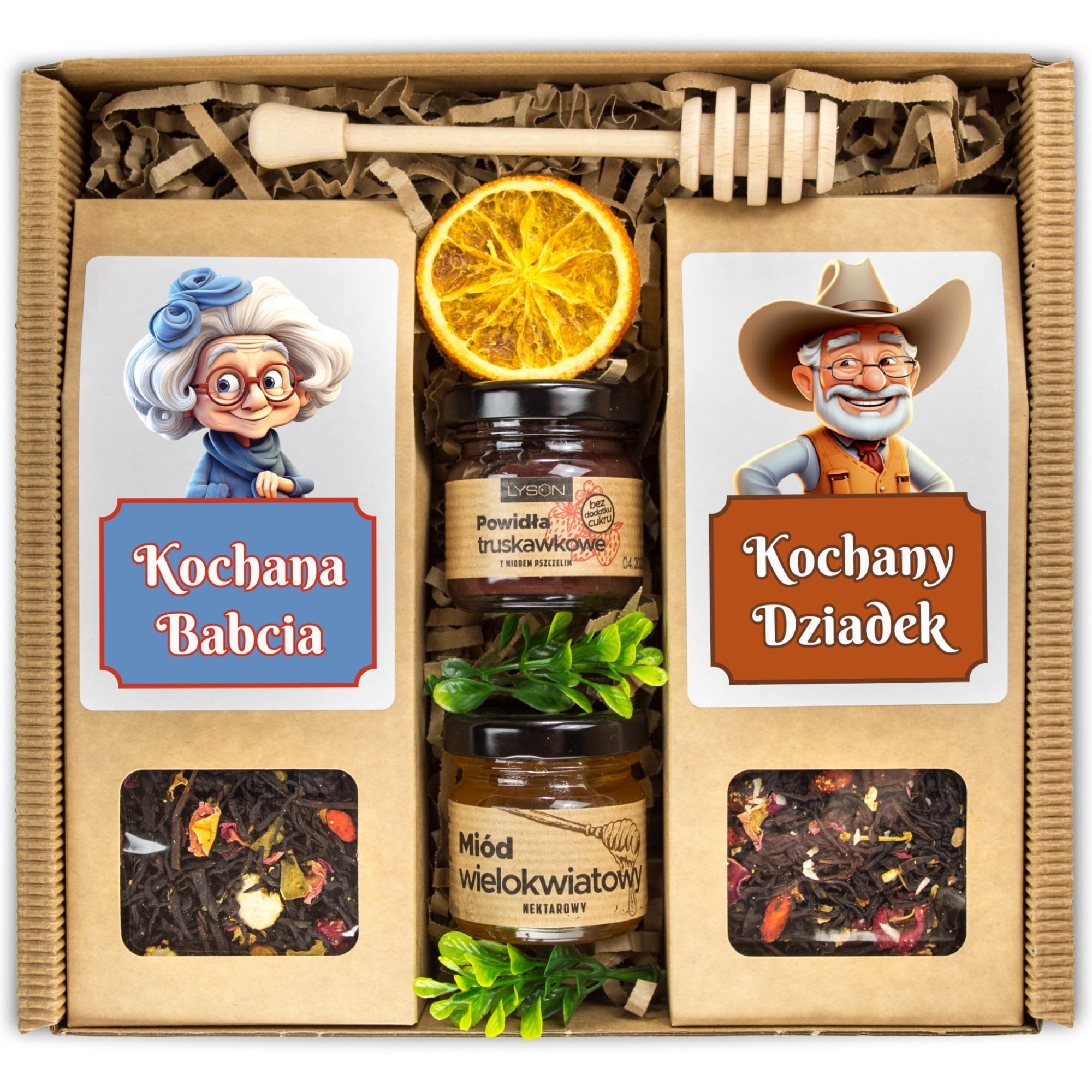 Zestaw prezentowy dla Babci i Dziadka – herbaty, miód i powidła w uroczym pudełku