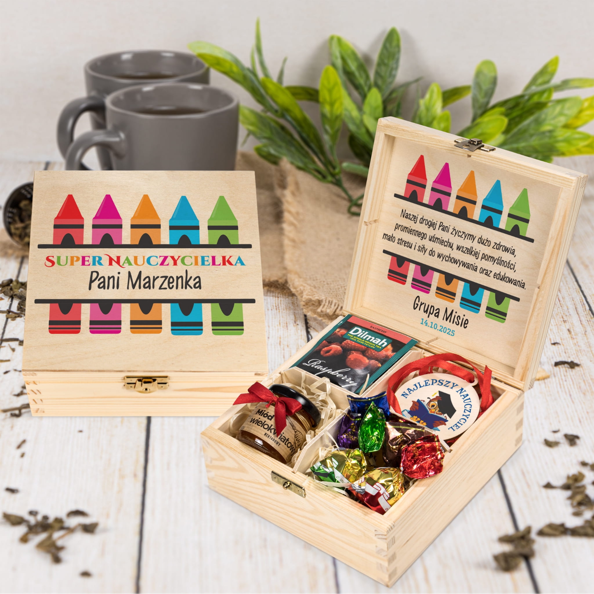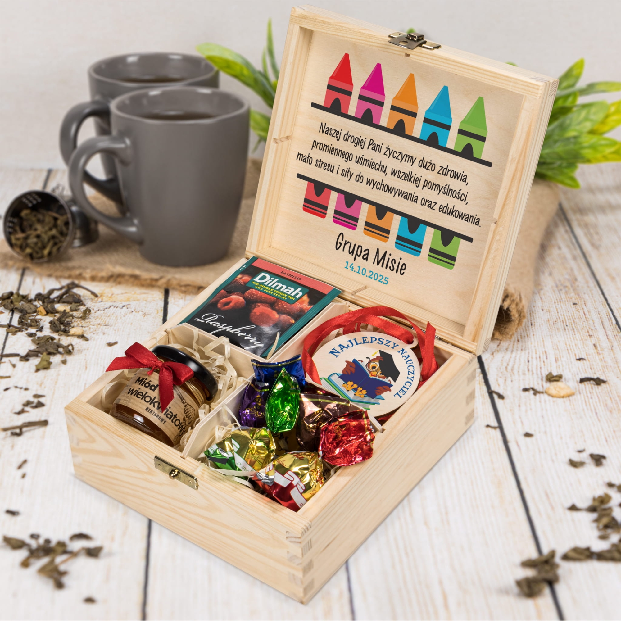- drewniane pudełko na herbatę z indywidualnym nadrukiem,